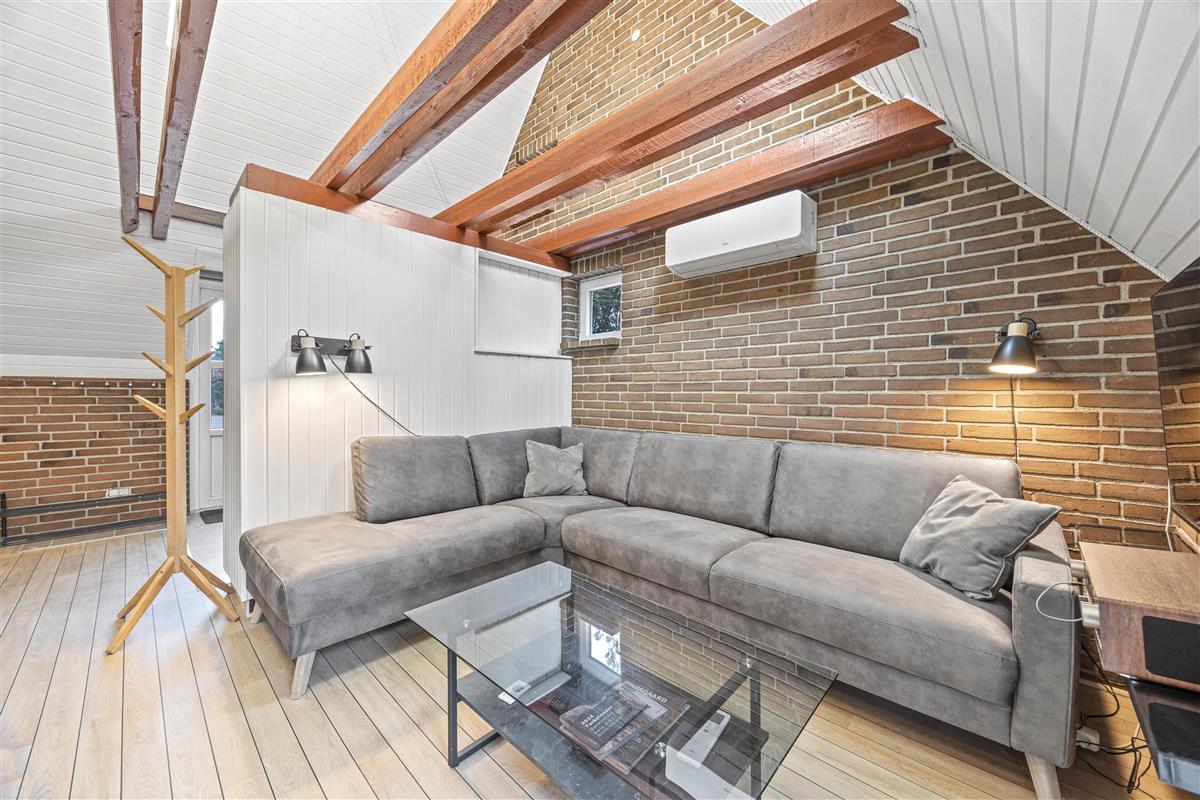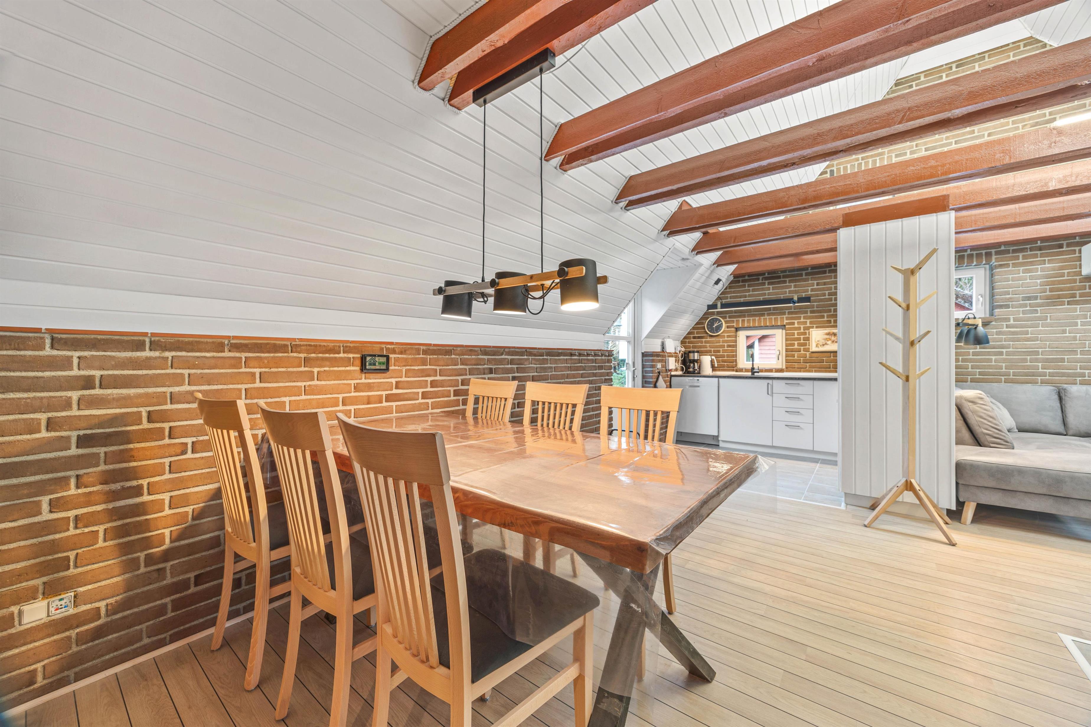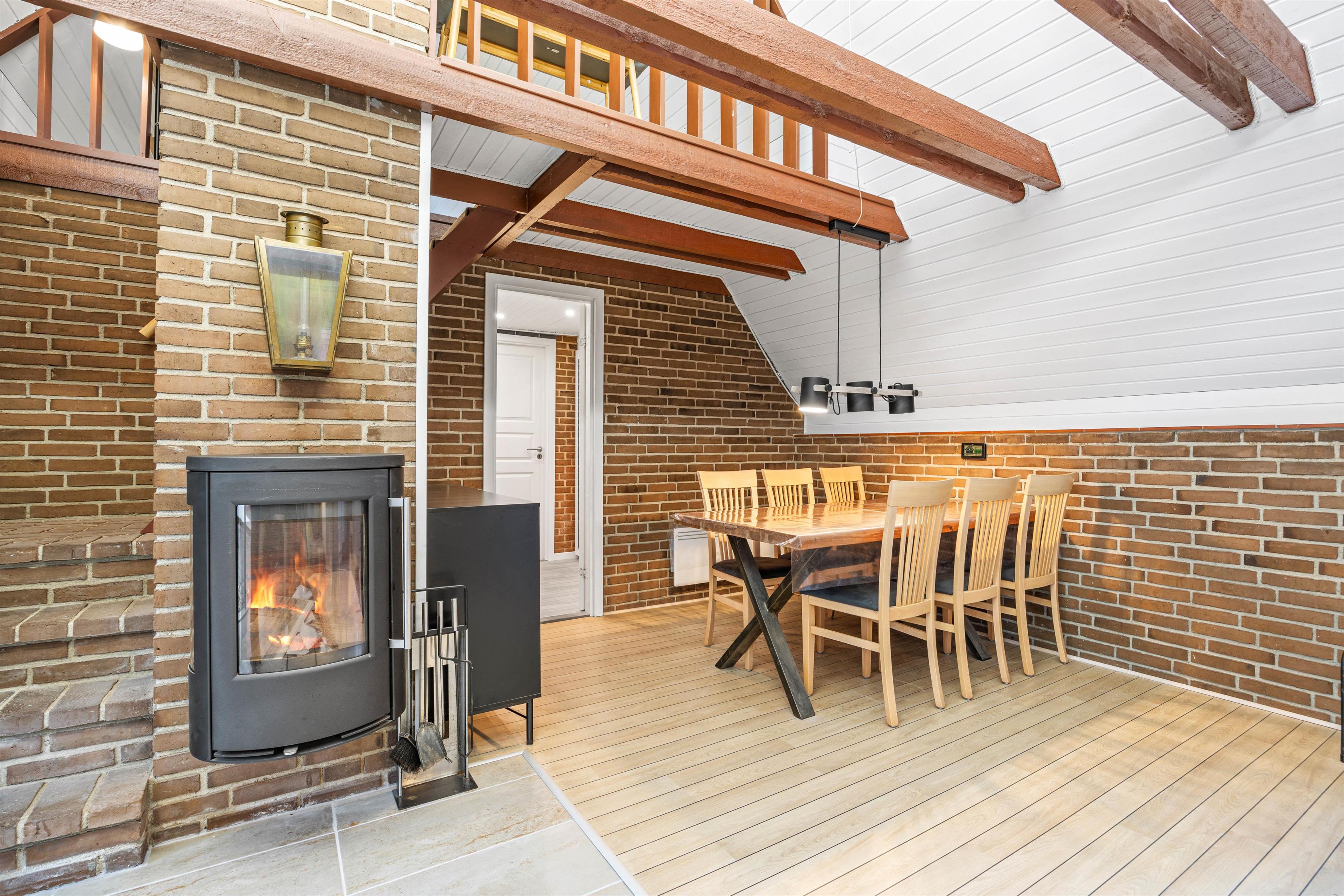 The interior is cosily furnished, with exposed beams and brickwork lending the rooms a rustic charm. The living room features a large sofa perfect for relaxation. Here you can settle in for board games or warm yourself by the welcoming fireplace. The holiday home has two bedrooms with comfortable single beds, while the spacious loft houses a double bed and an additional bed can be found in the annexe. This layout is ideal for families with older children who appreciate their own space.