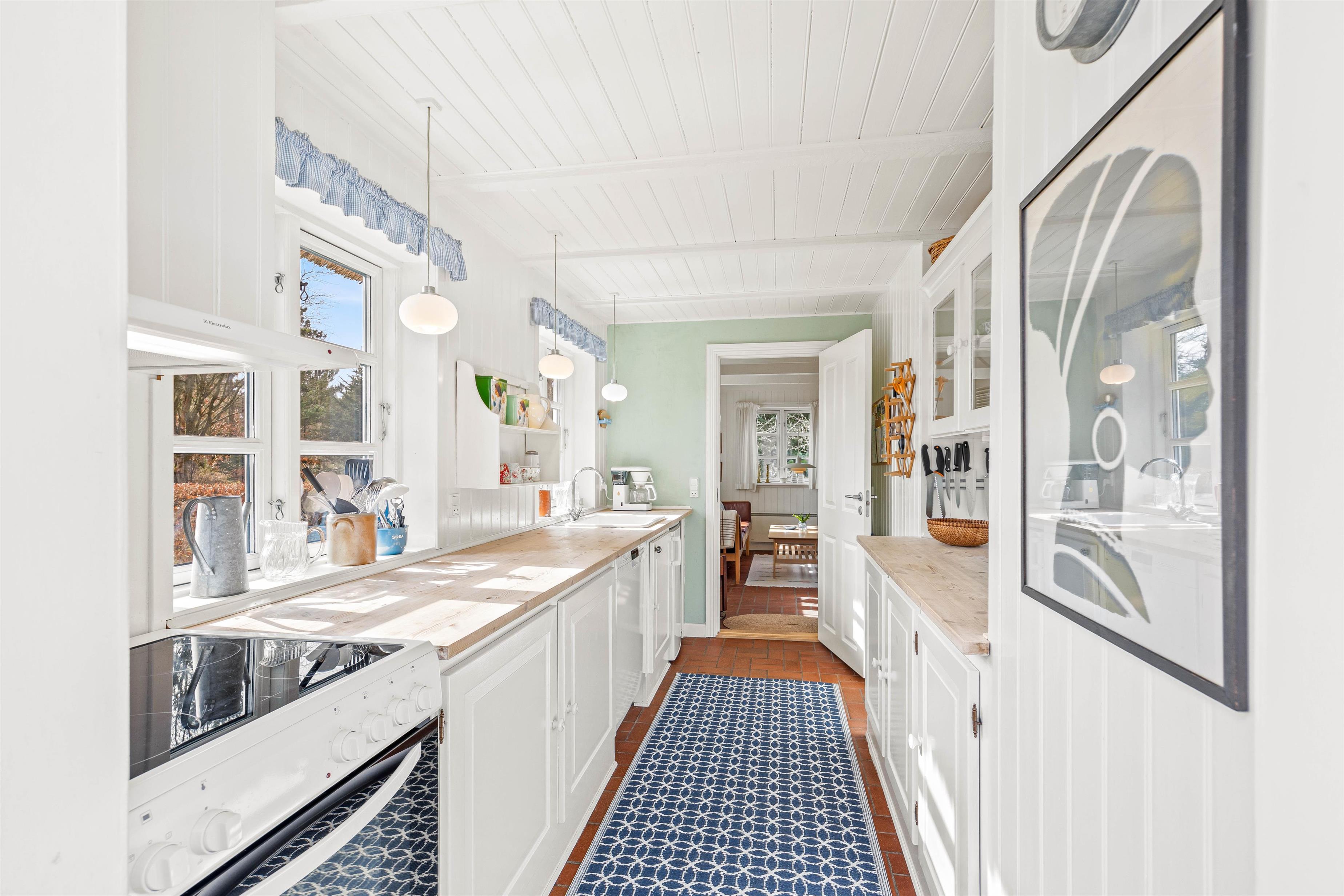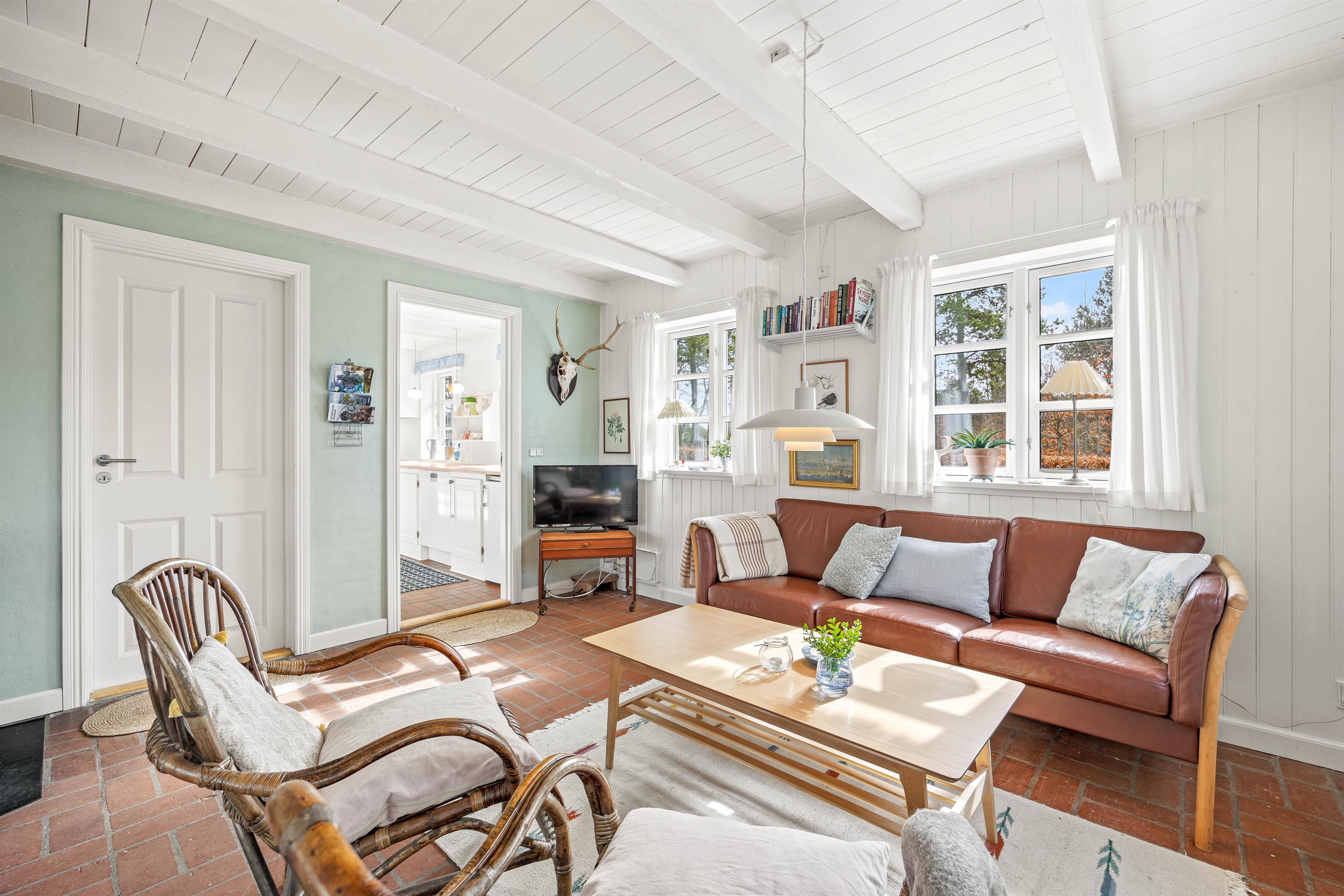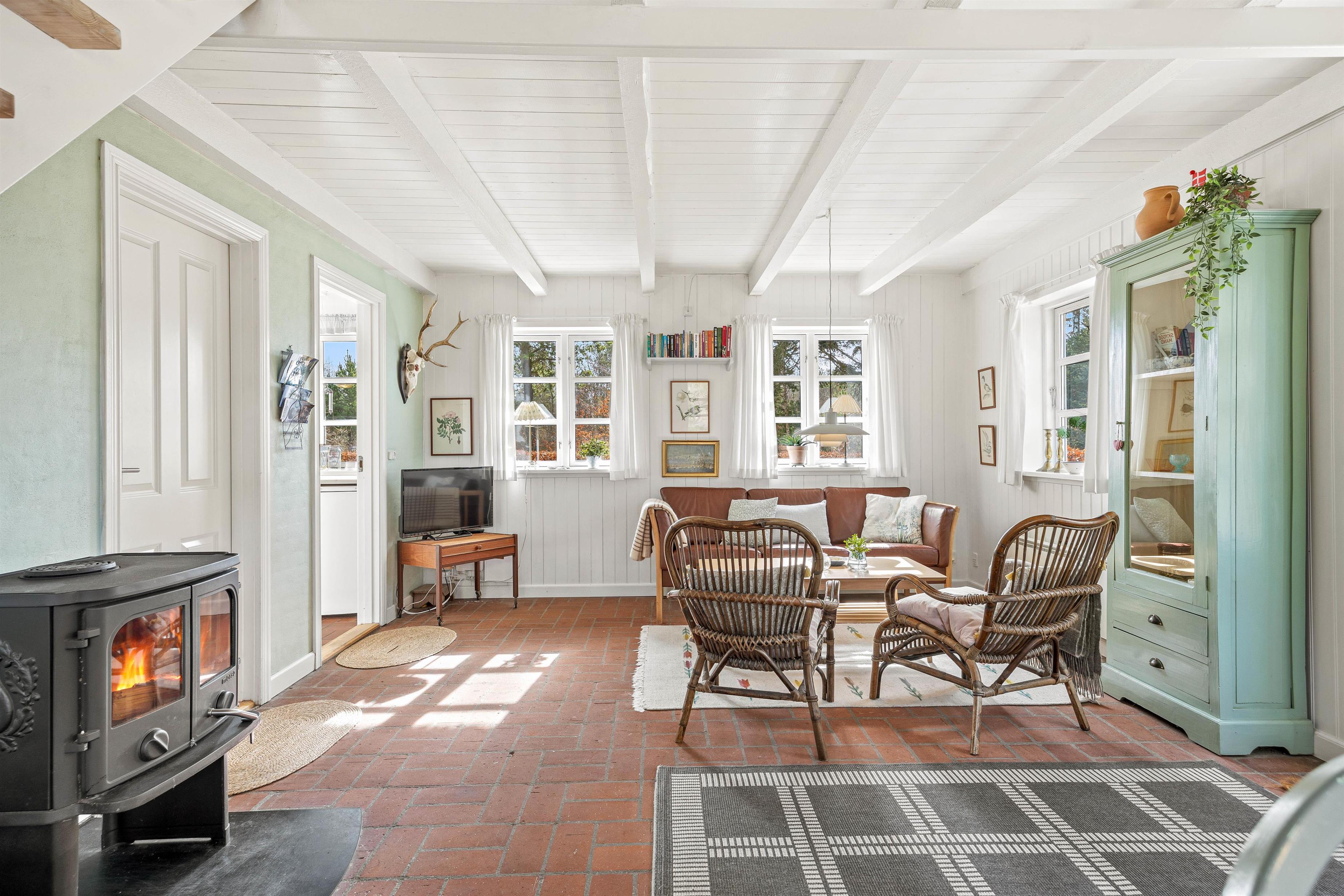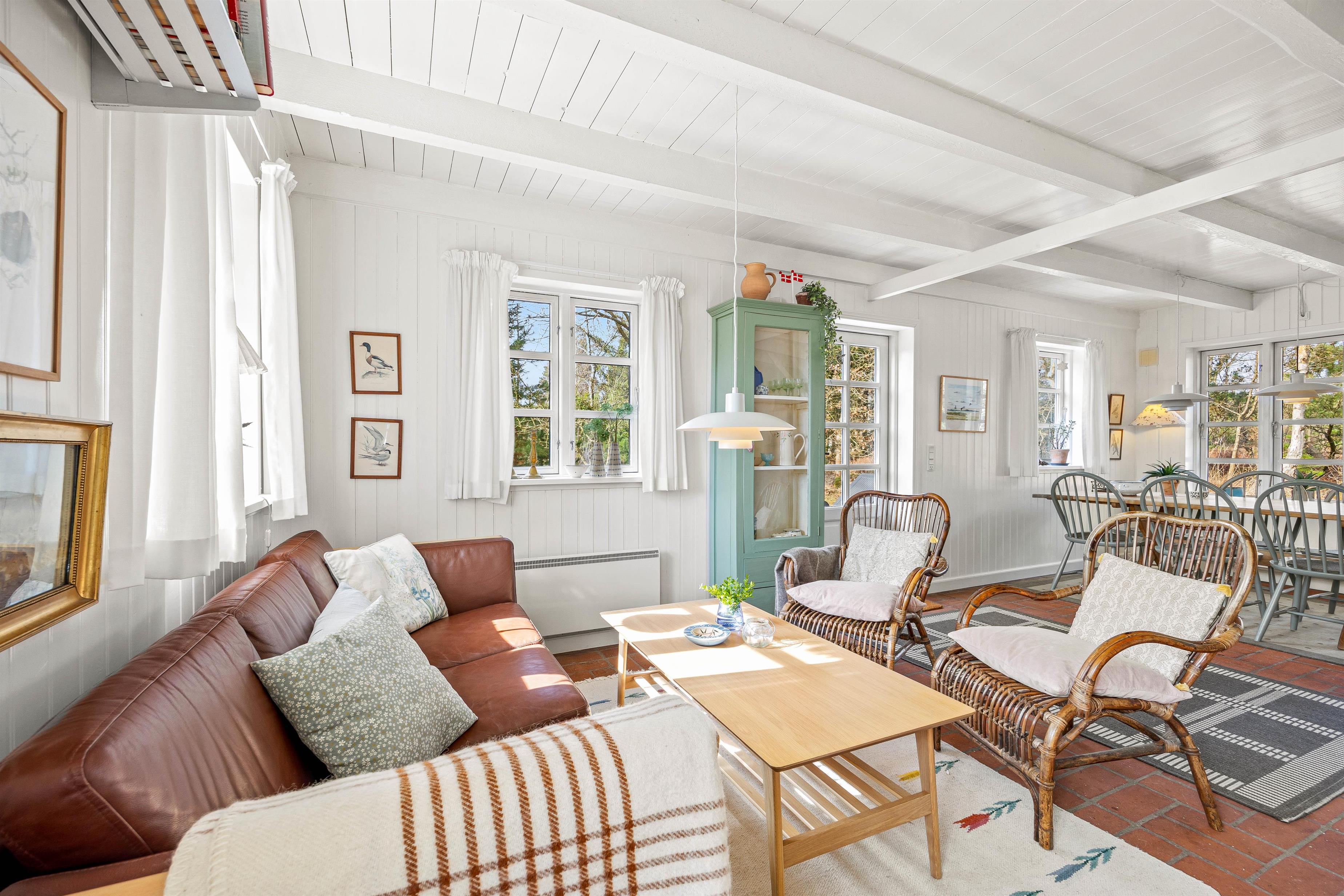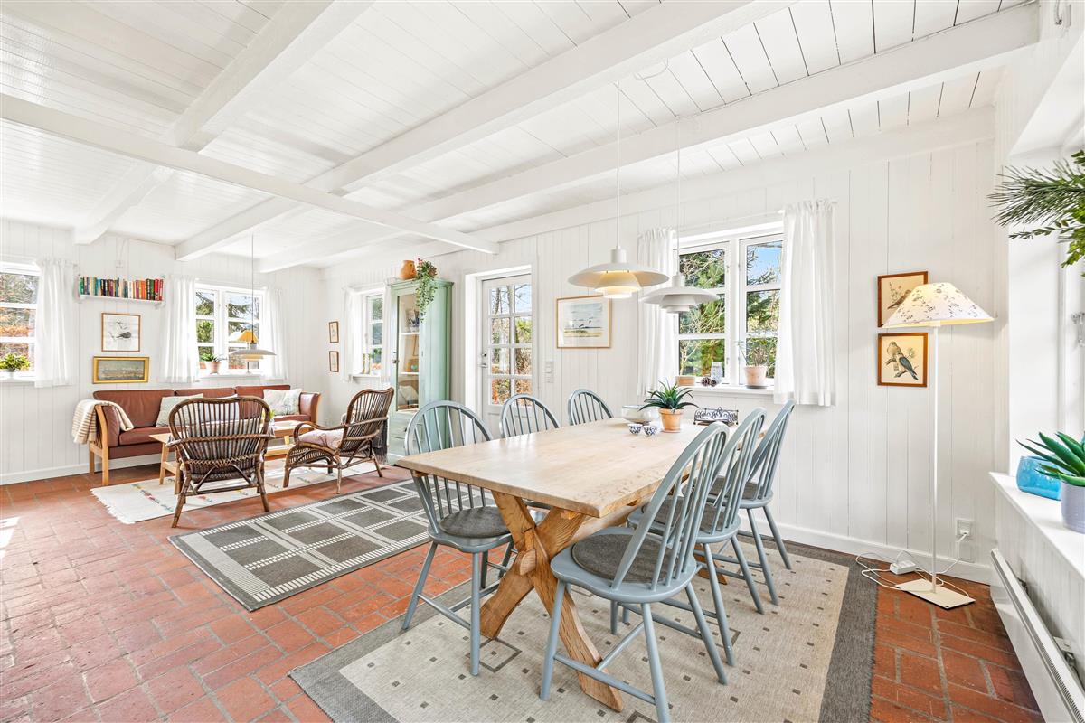 The interior of this Houstrup holiday home immediately exudes a cosy yet modern atmosphere that makes you feel right at home. The open-plan living area is the heart of the holiday home, where the wood-burning stove provides comfortable warmth on cool evenings – the perfect place to unwind after an eventful day. The modern kitchen with dishwasher meets all your needs, making meal preparation and cleanup equally effortless. The dining area is where you can eat together, share laughs and create wonderful memories.