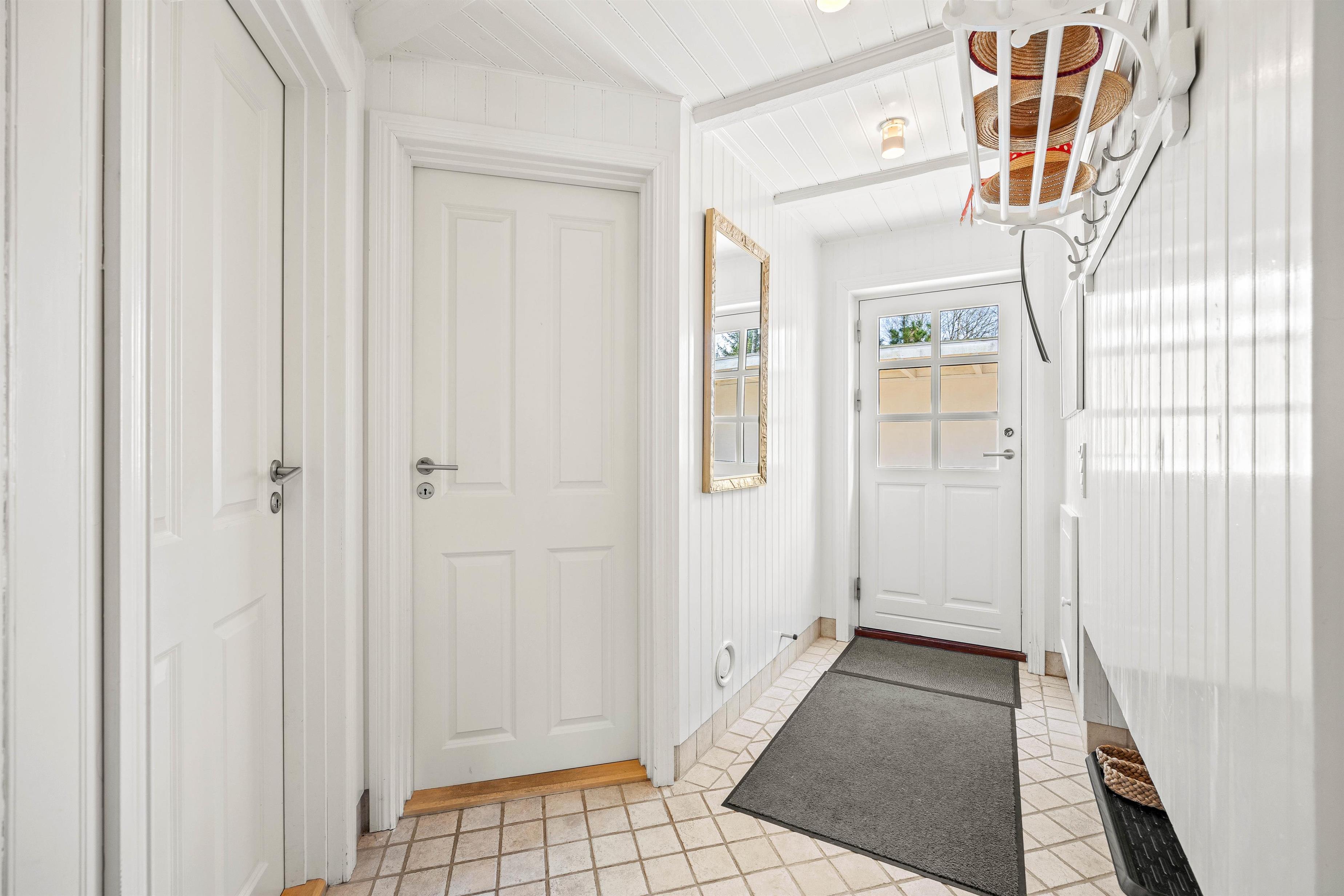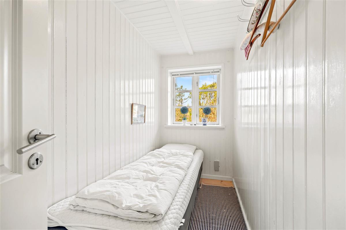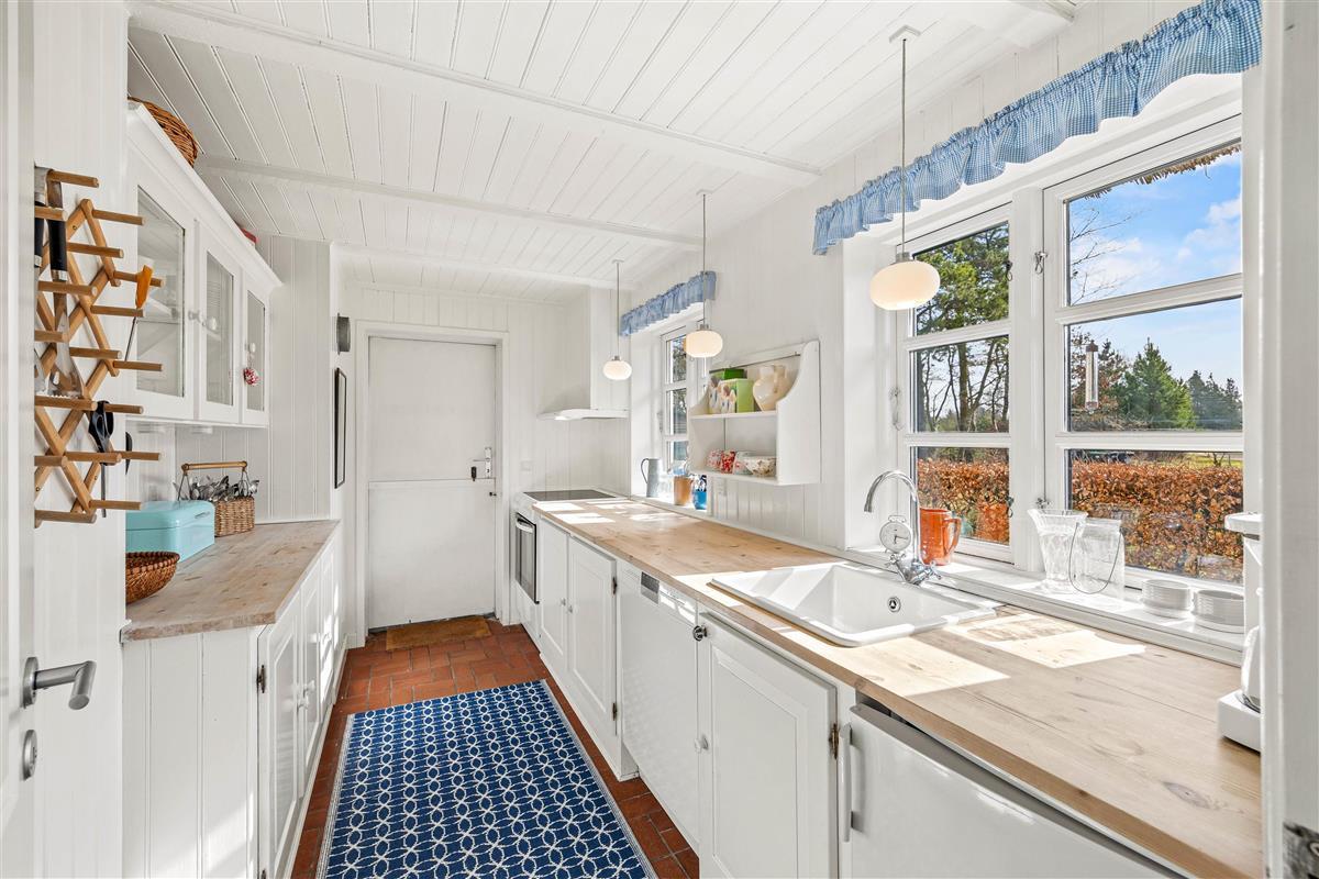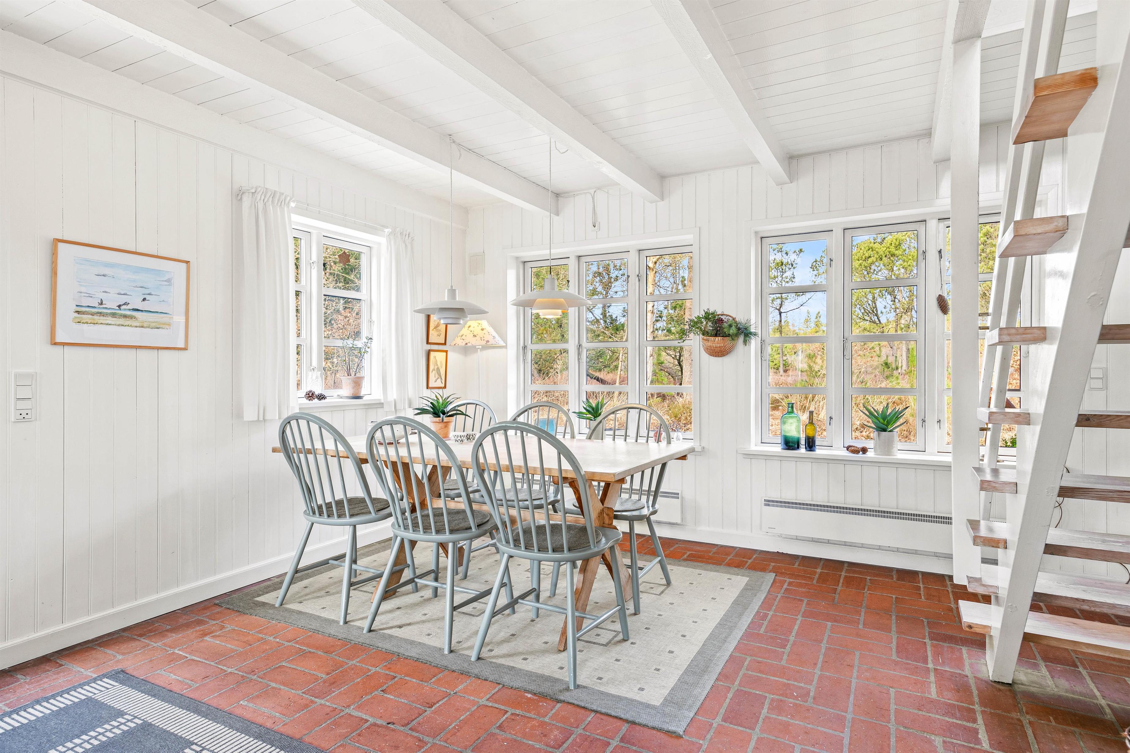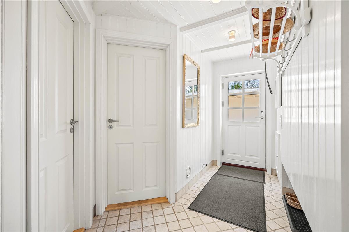 The interior of this Houstrup holiday home immediately exudes a cosy yet modern atmosphere that makes you feel right at home. The open-plan living area is the heart of the holiday home, where the wood-burning stove provides comfortable warmth on cool evenings – the perfect place to unwind after an eventful day. The modern kitchen with dishwasher meets all your needs, making meal preparation and cleanup equally effortless. The dining area is where you can eat together, share laughs and create wonderful memories.
