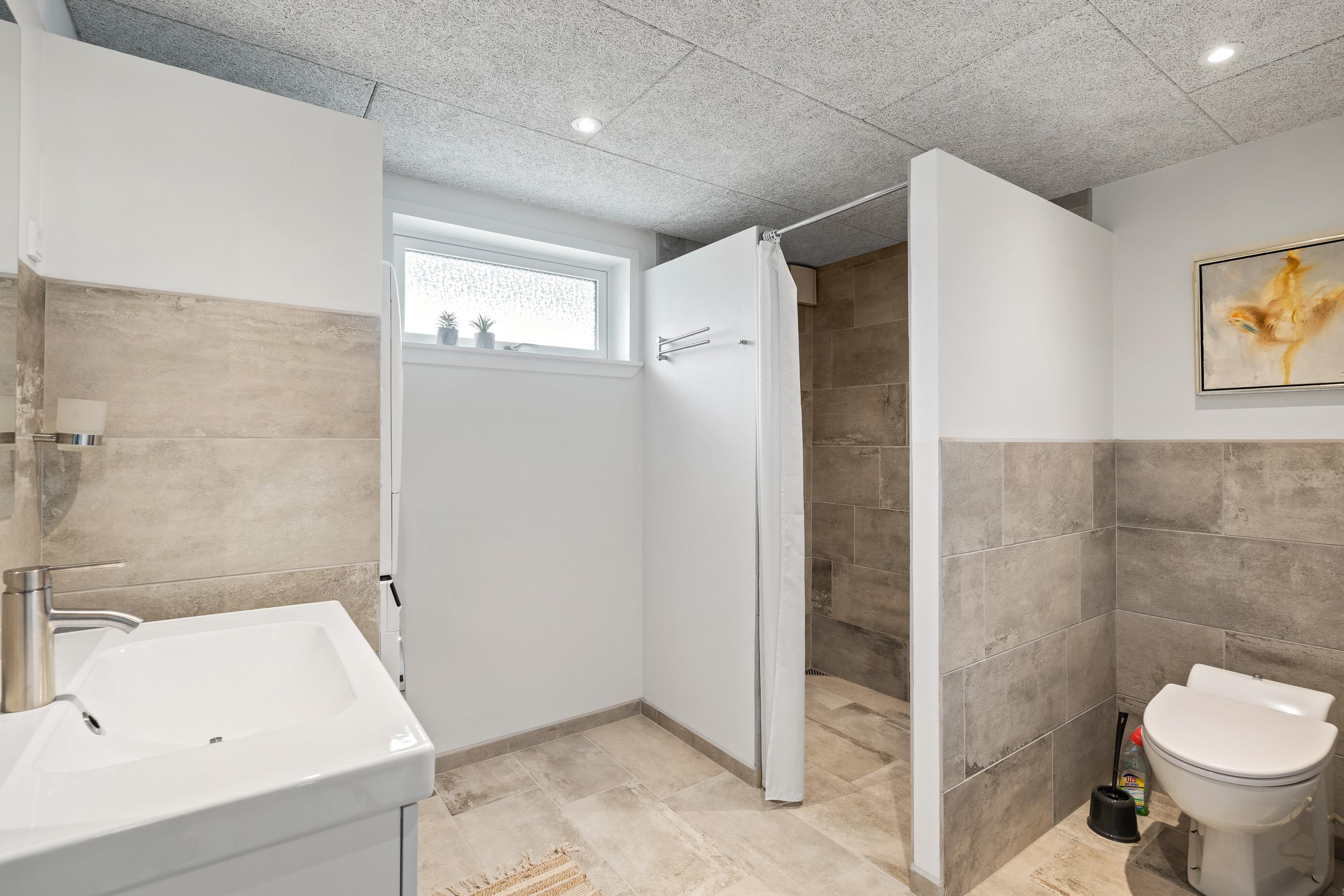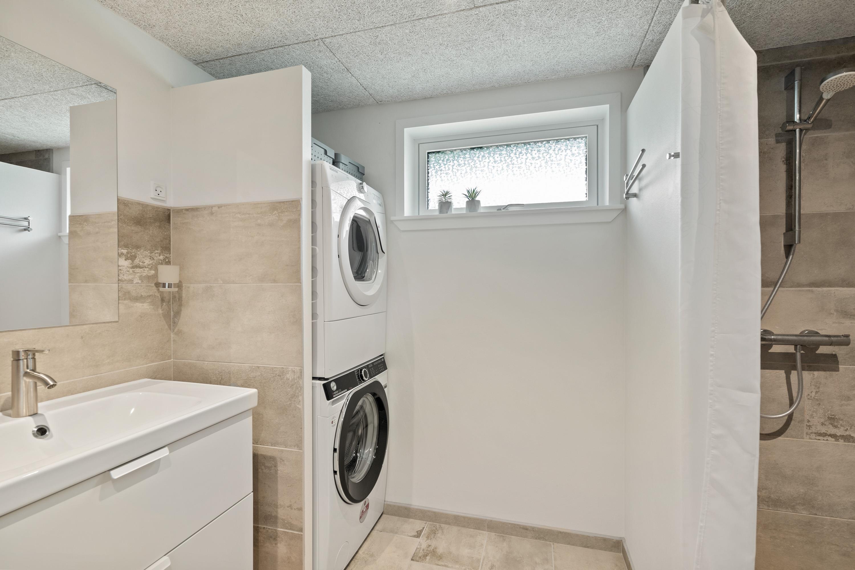 The modern bathroom offers everything you need for a relaxing break, and for added convenience, there's a washing machine and tumble dryer, making longer stays even more comfortable. The heat pump provides efficient heating throughout the holiday home, and underfloor heating in the bathroom adds extra comfort on cold days.