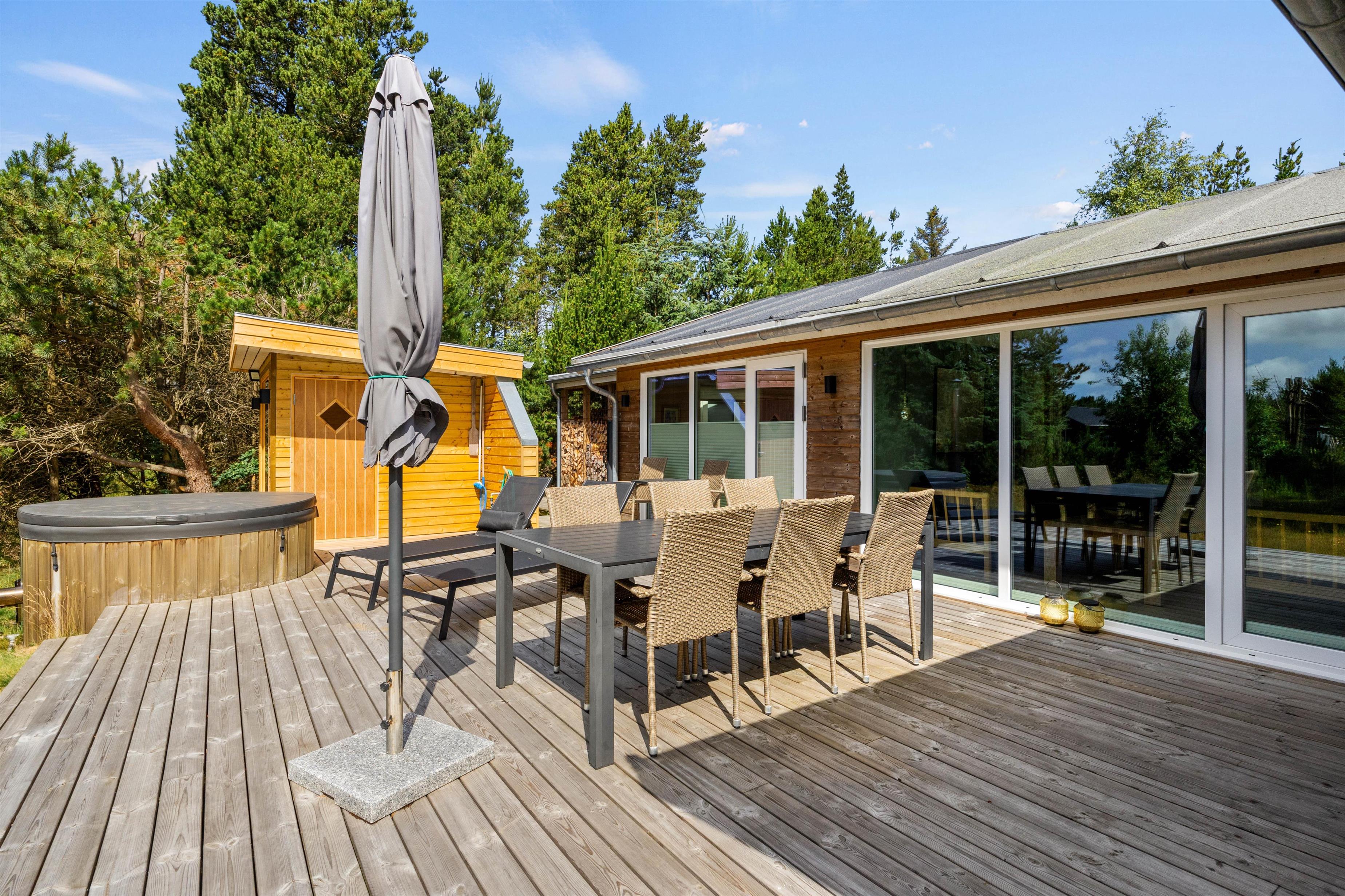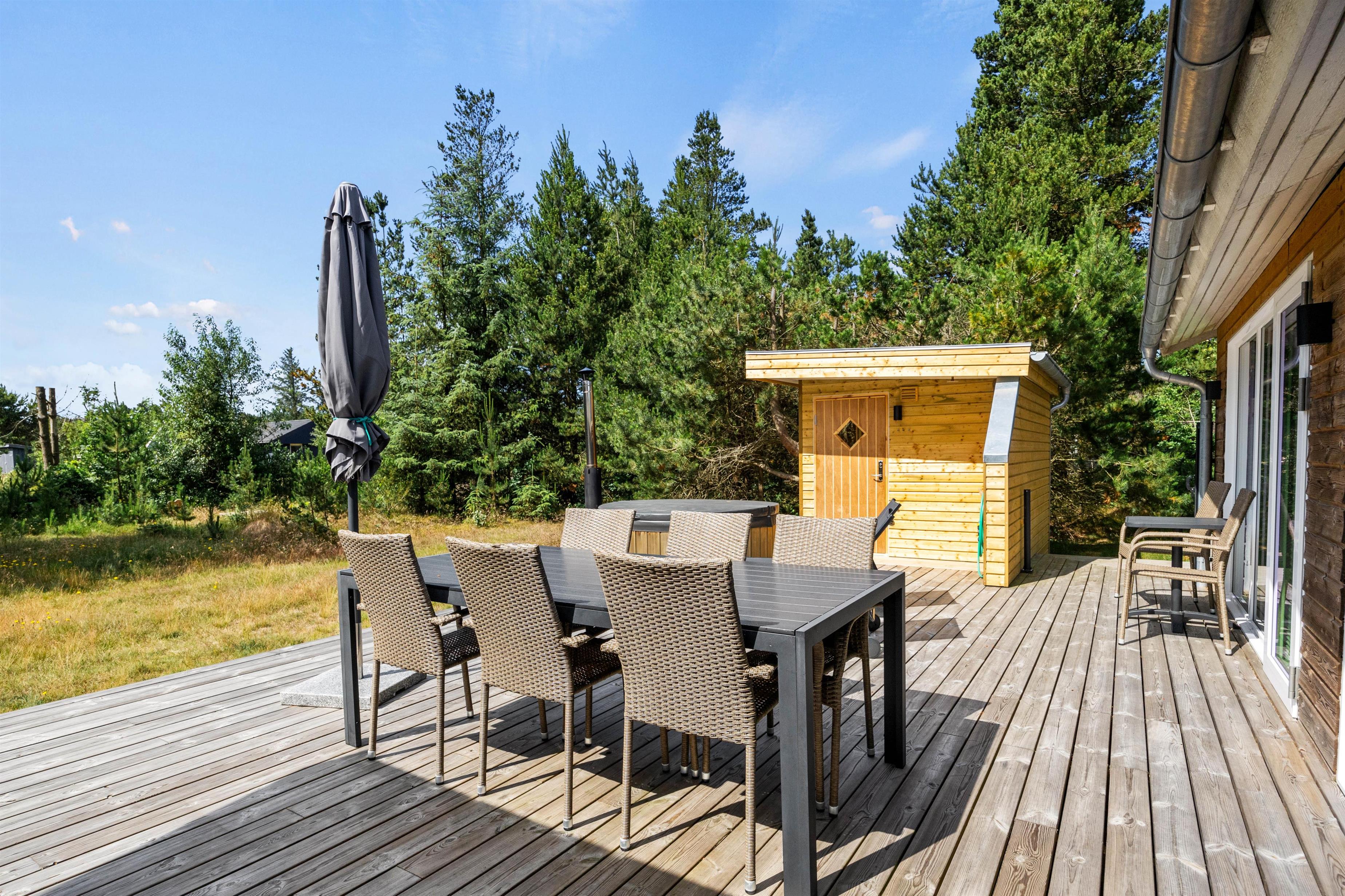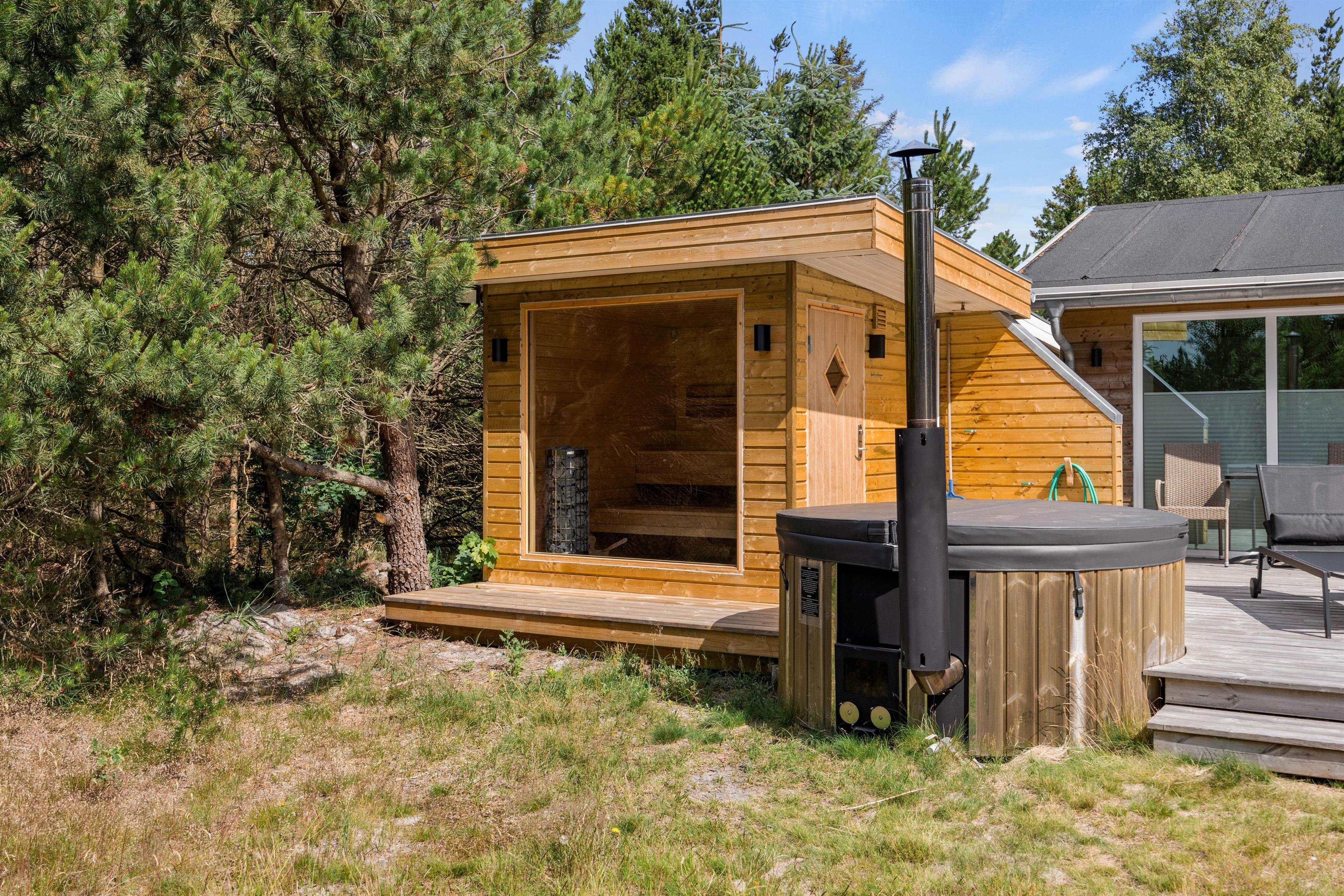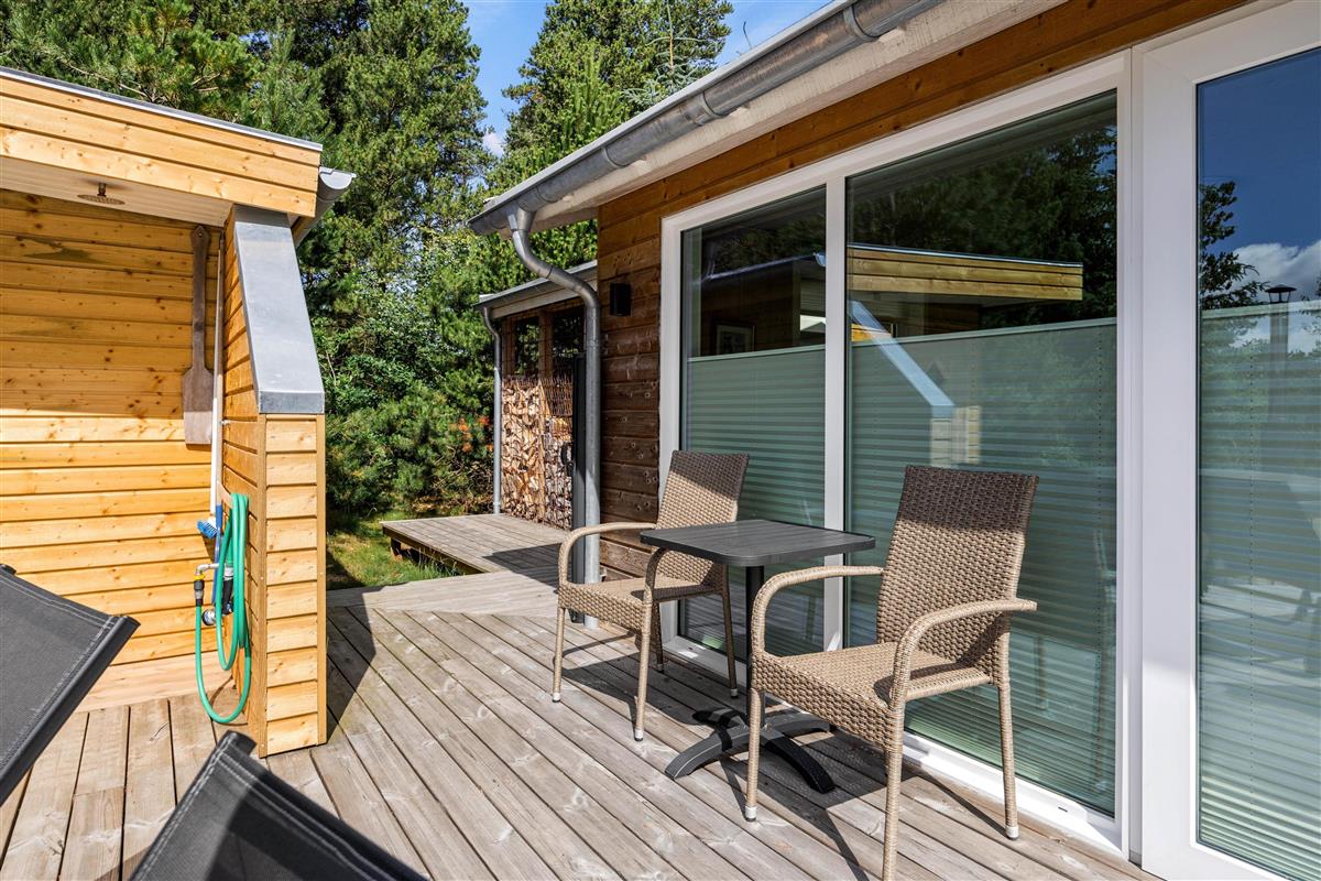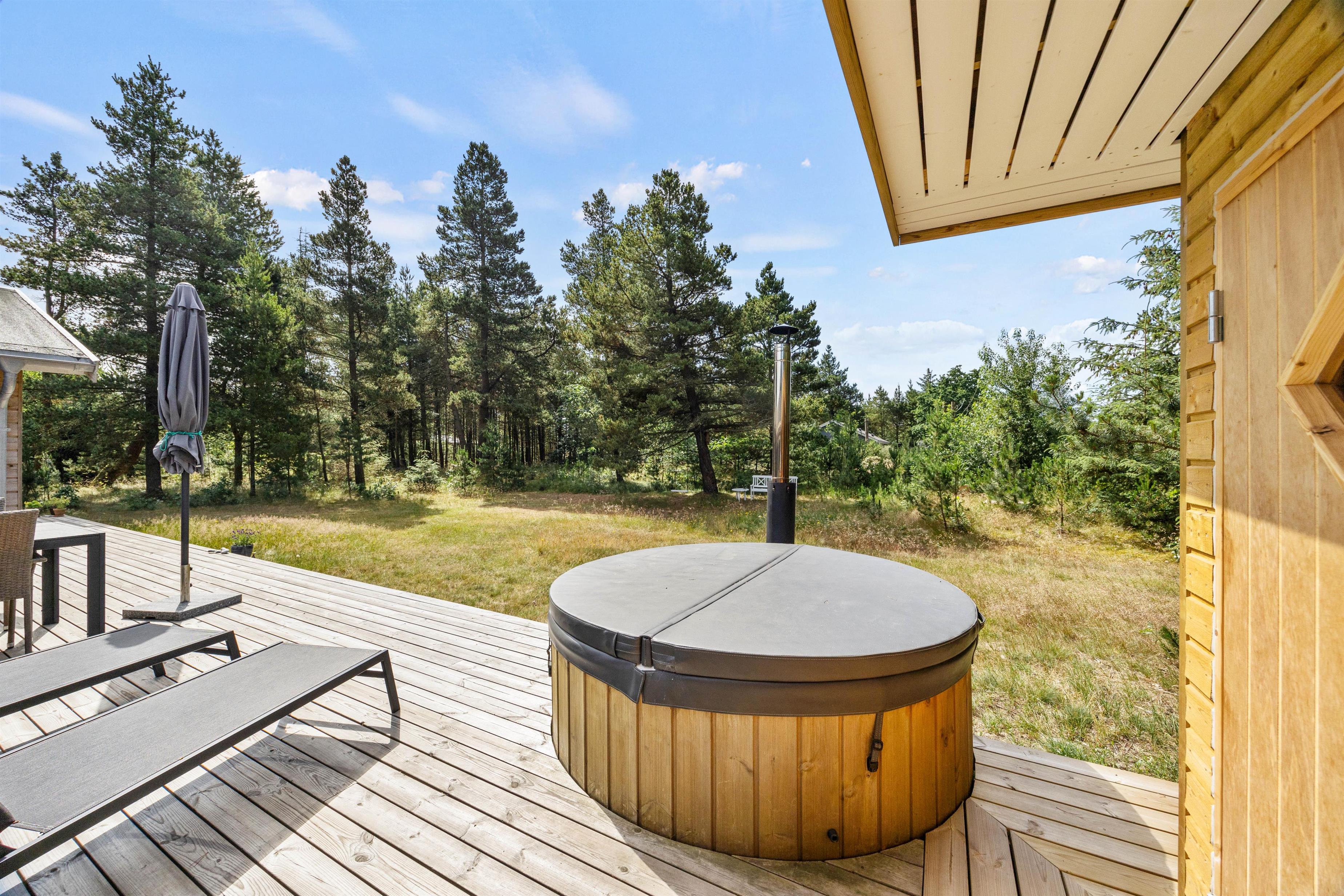 The screened terrace provides additional privacy, perfect for quiet moments away from everyday life. A special highlight is the Nordic outdoor hot tub, offering a wonderful wellness experience under the open sky. After a day of exploring the surroundings, it's the perfect spot to unwind in the evening.