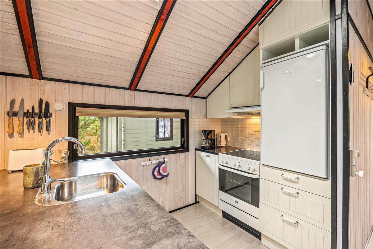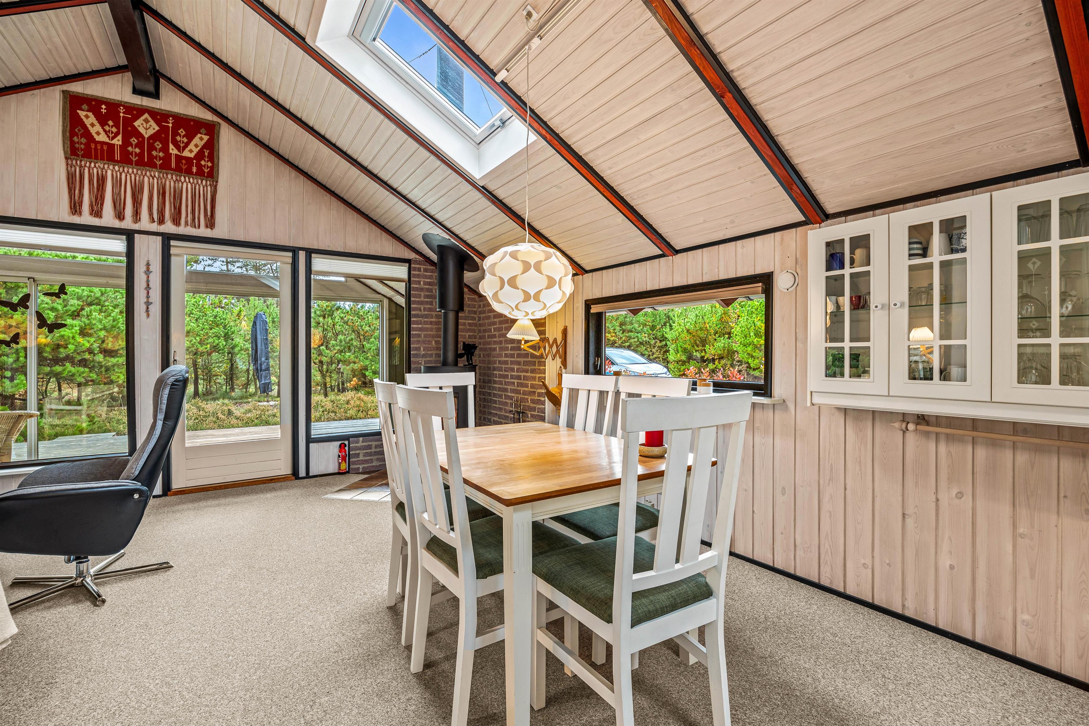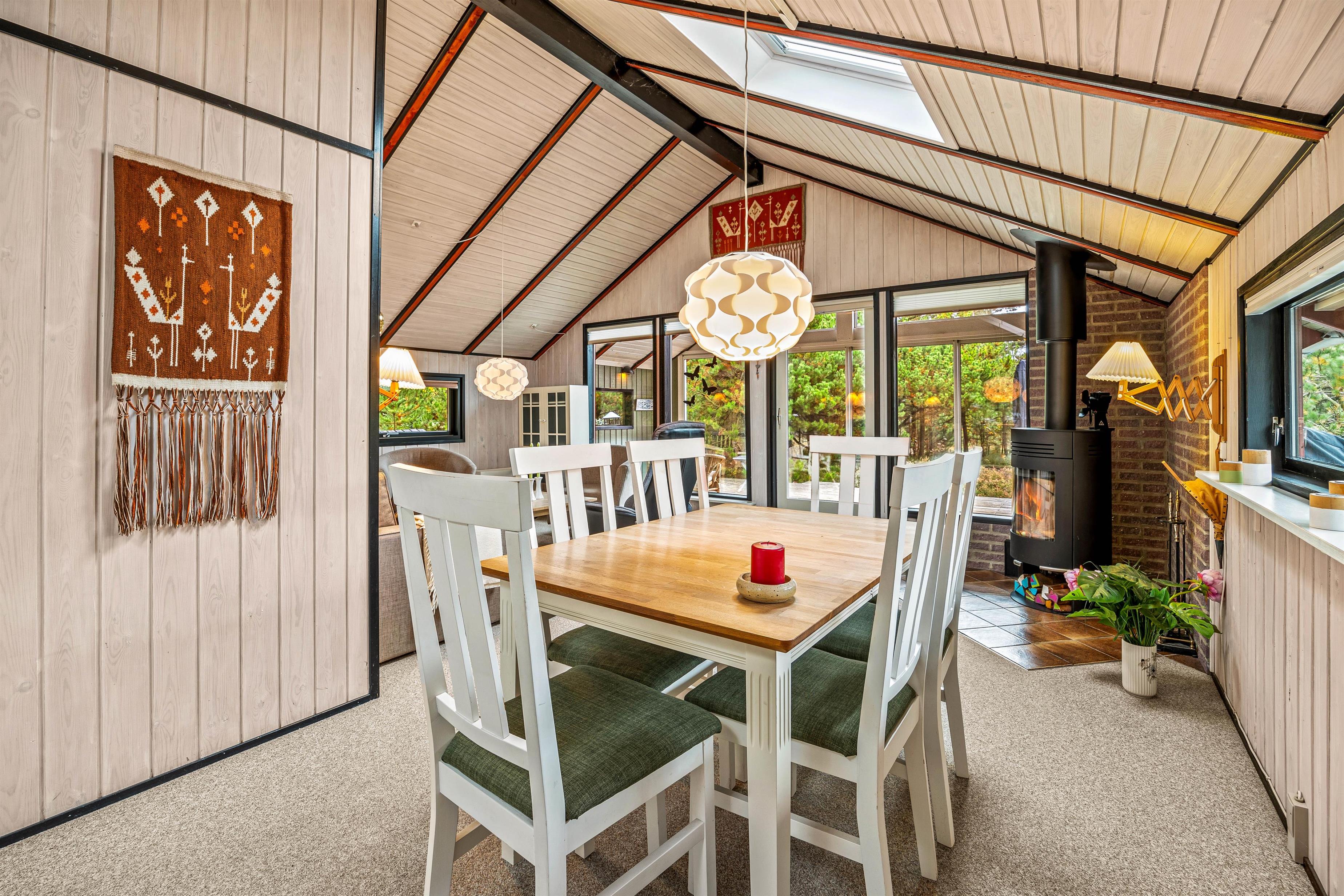 The focal point of the living room is the wood-burning stove, which not only provides welcome warmth on cooler days but also creates a lovely ambiance. The living room is perfect for relaxing after a day outdoors, reading a book, or enjoying a sociable evening. The kitchen's dishwasher makes cleaning up easier, leaving more time for shared activities. The adjoining dining area provides a lovely space for family meals or dining with friends.