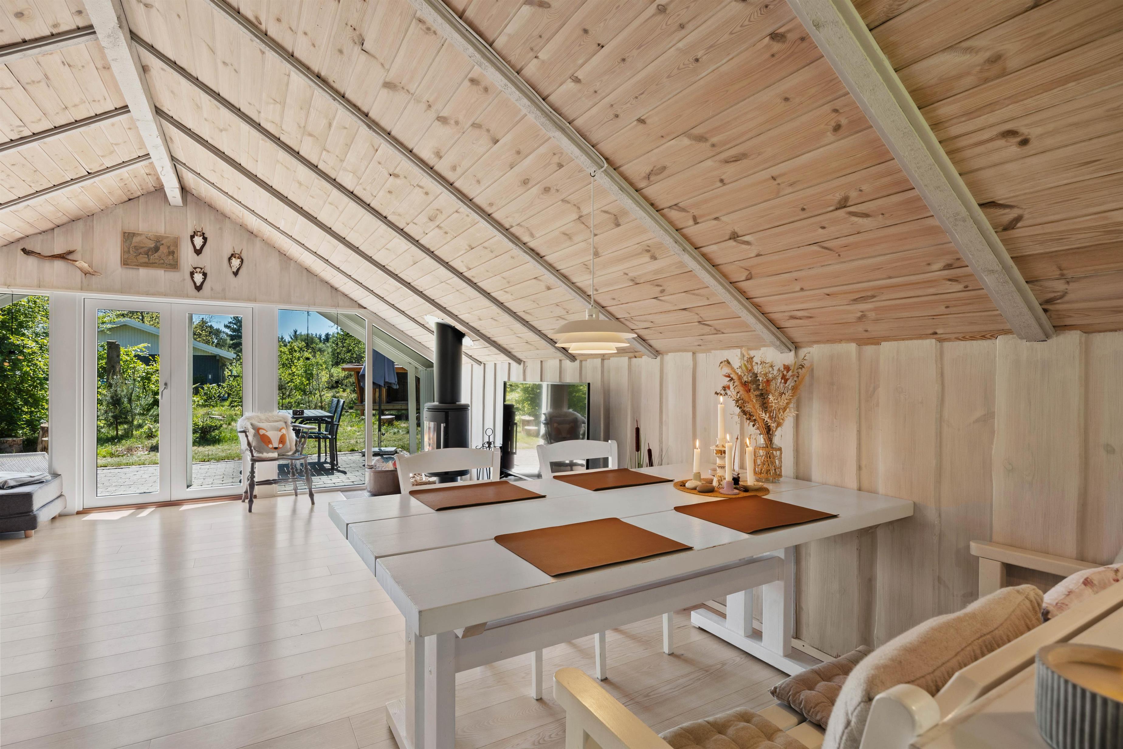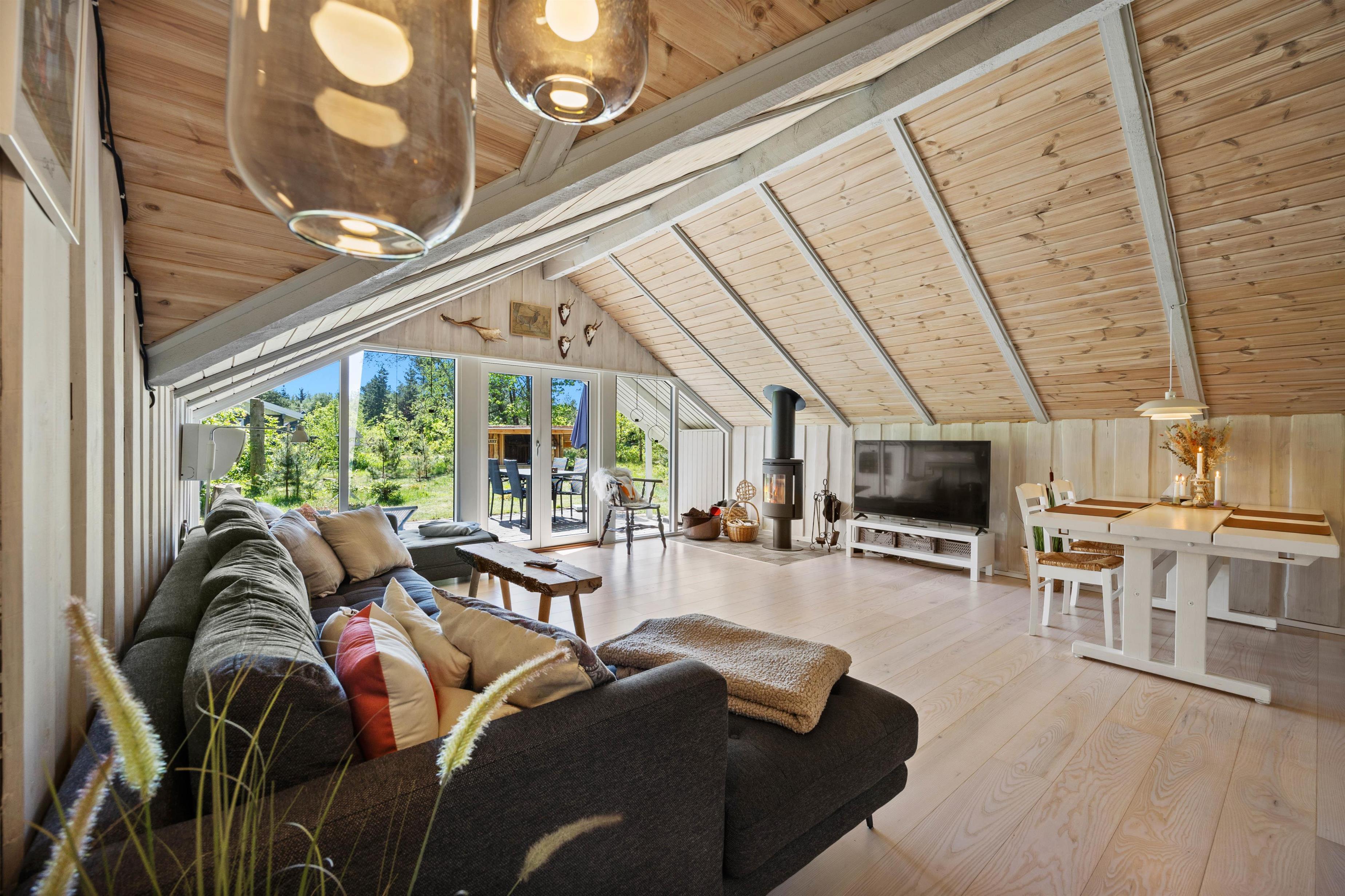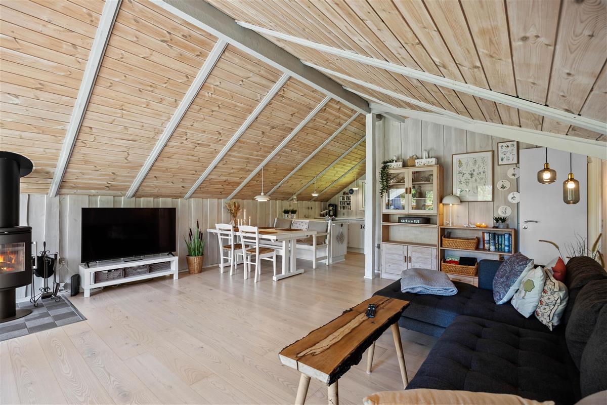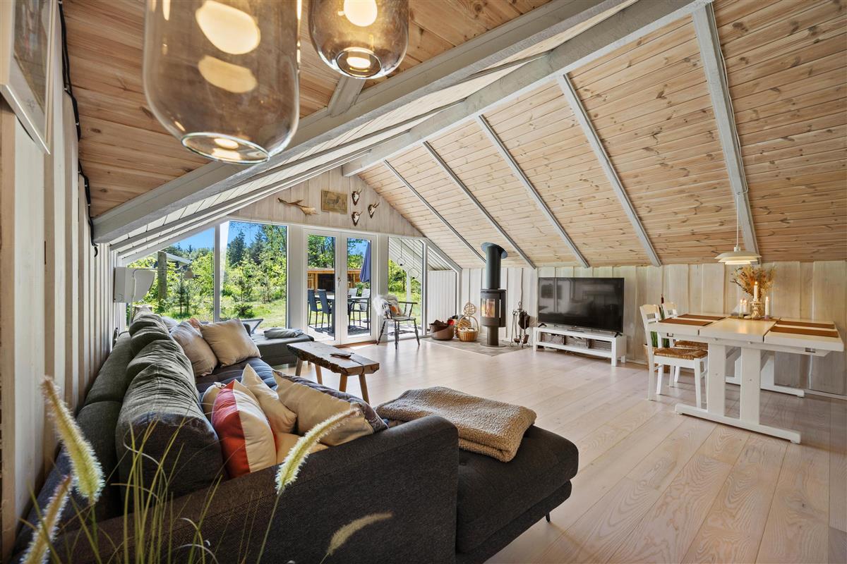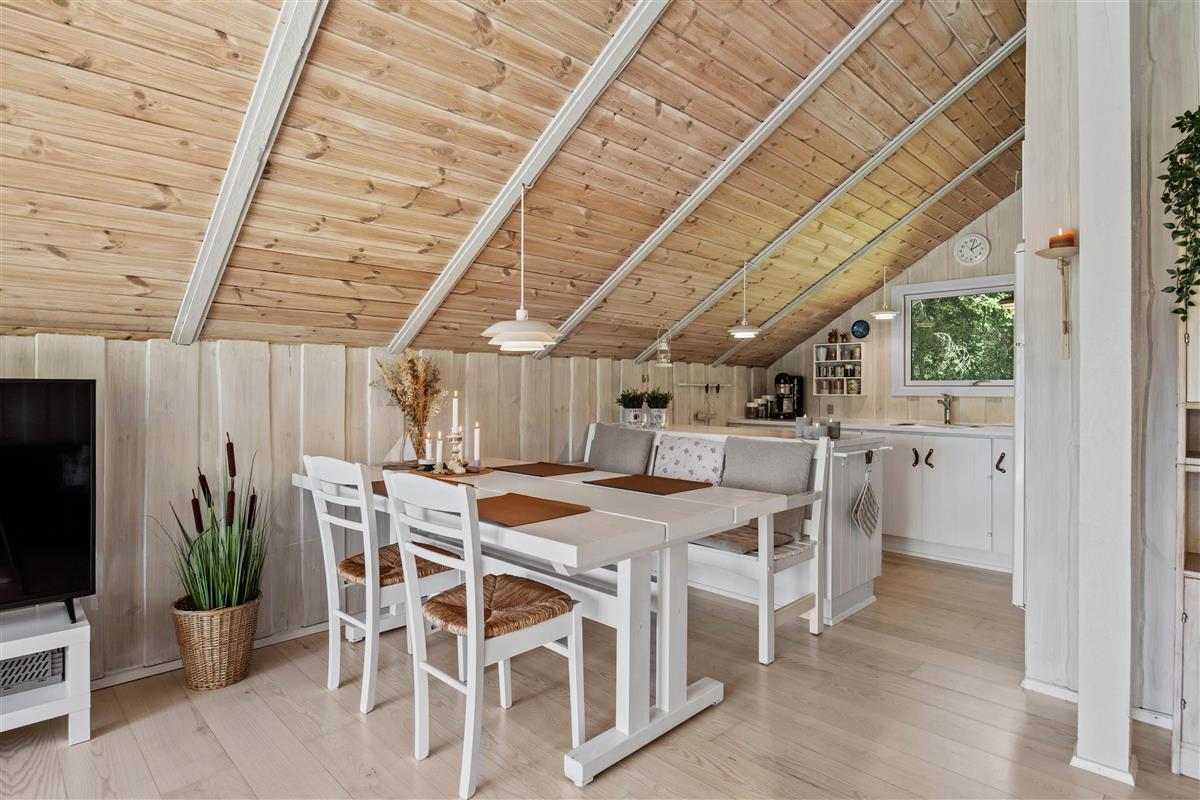 As soon as you enter the holiday home, you'll feel the classic atmosphere of a Danish holiday retreat. The walls and ceilings throughout are wood-panelled, giving the holiday home a bright and welcoming ambiance. The heart of this beautiful holiday home is the large living area, combining the living room, kitchen and dining room in one space.