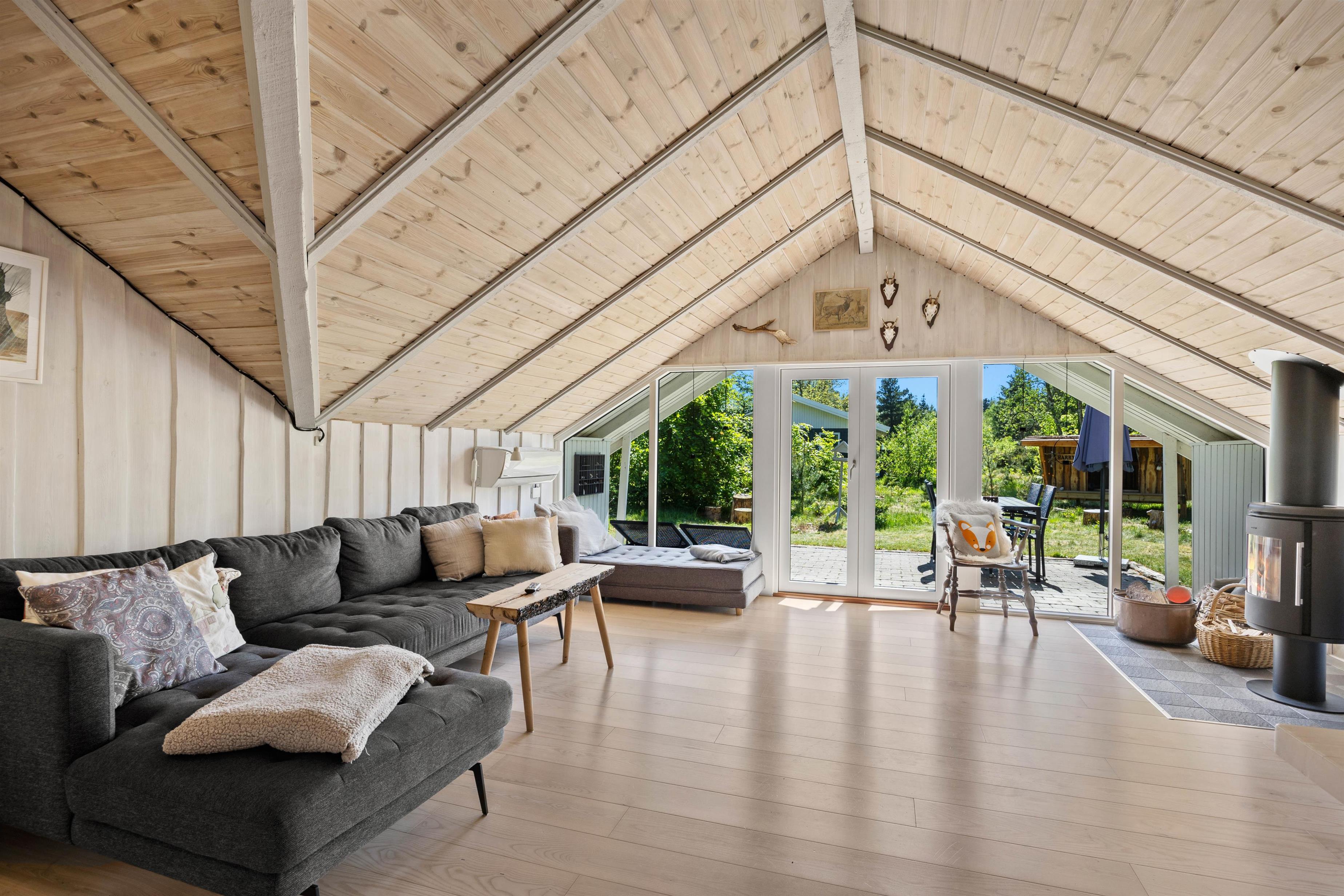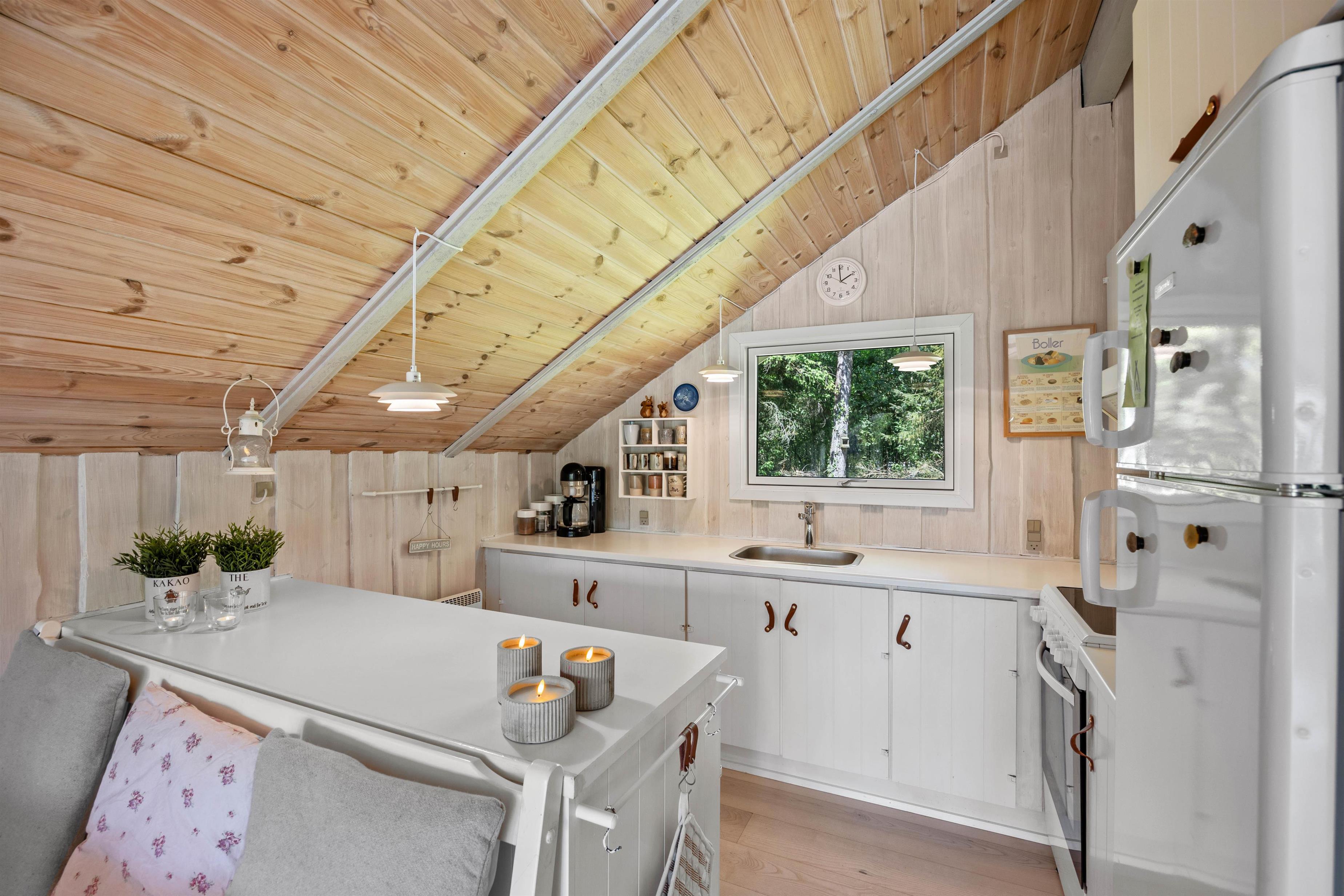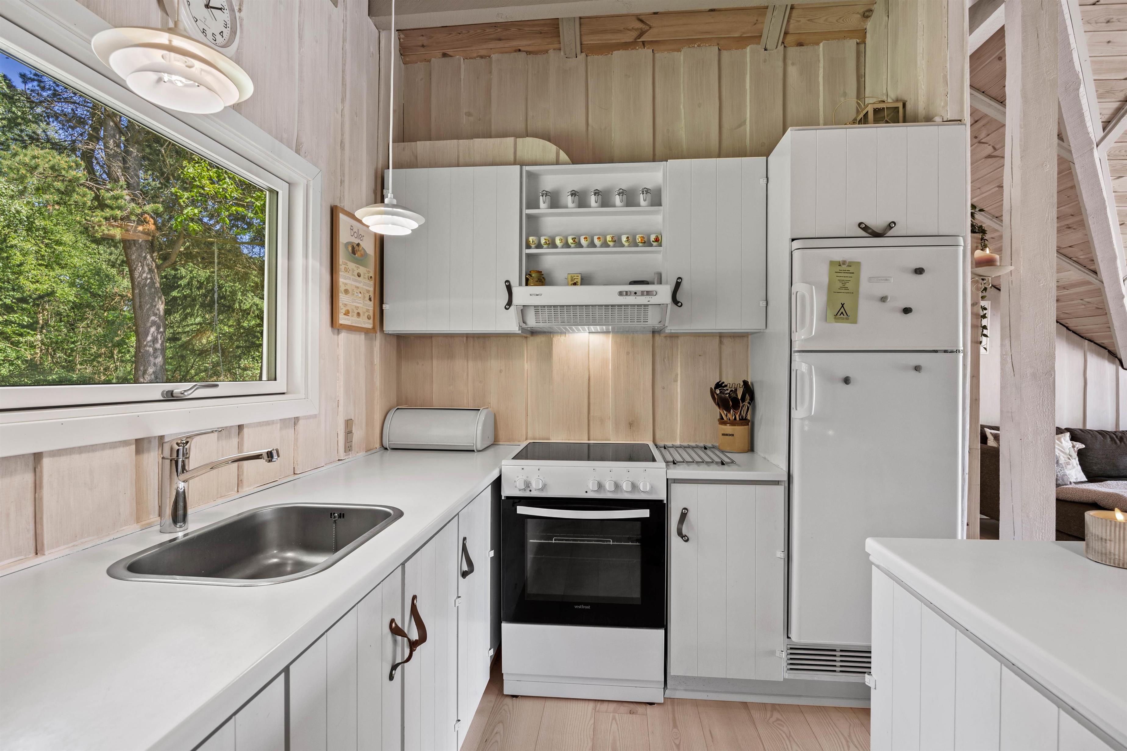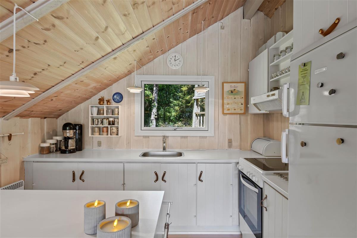 As soon as you enter the holiday home, you'll feel the classic atmosphere of a Danish holiday retreat. The walls and ceilings throughout are wood-panelled, giving the holiday home a bright and welcoming ambiance. The heart of this beautiful holiday home is the large living area, combining the living room, kitchen and dining room in one space.