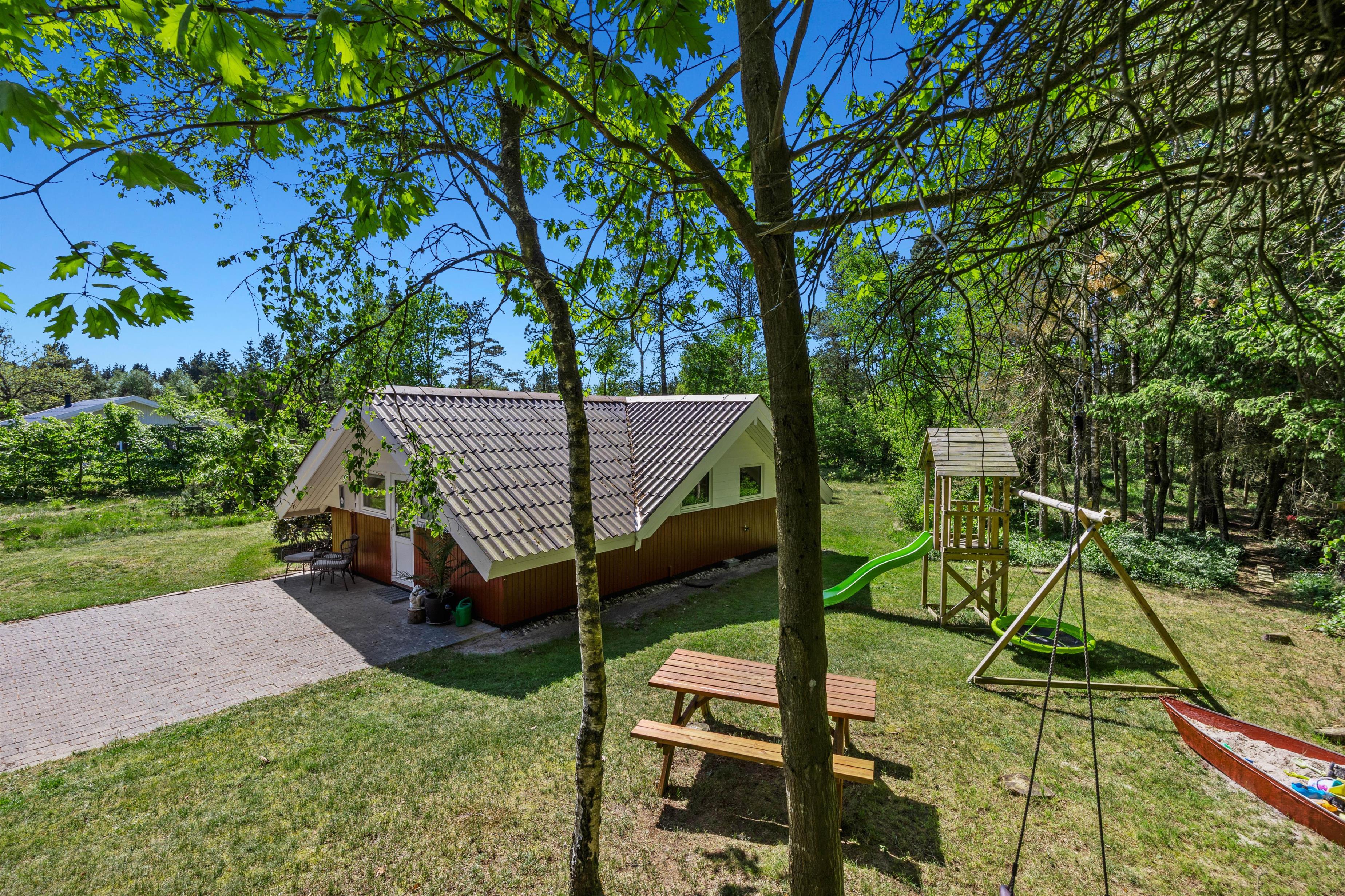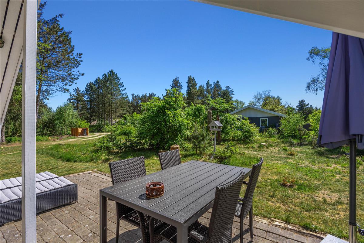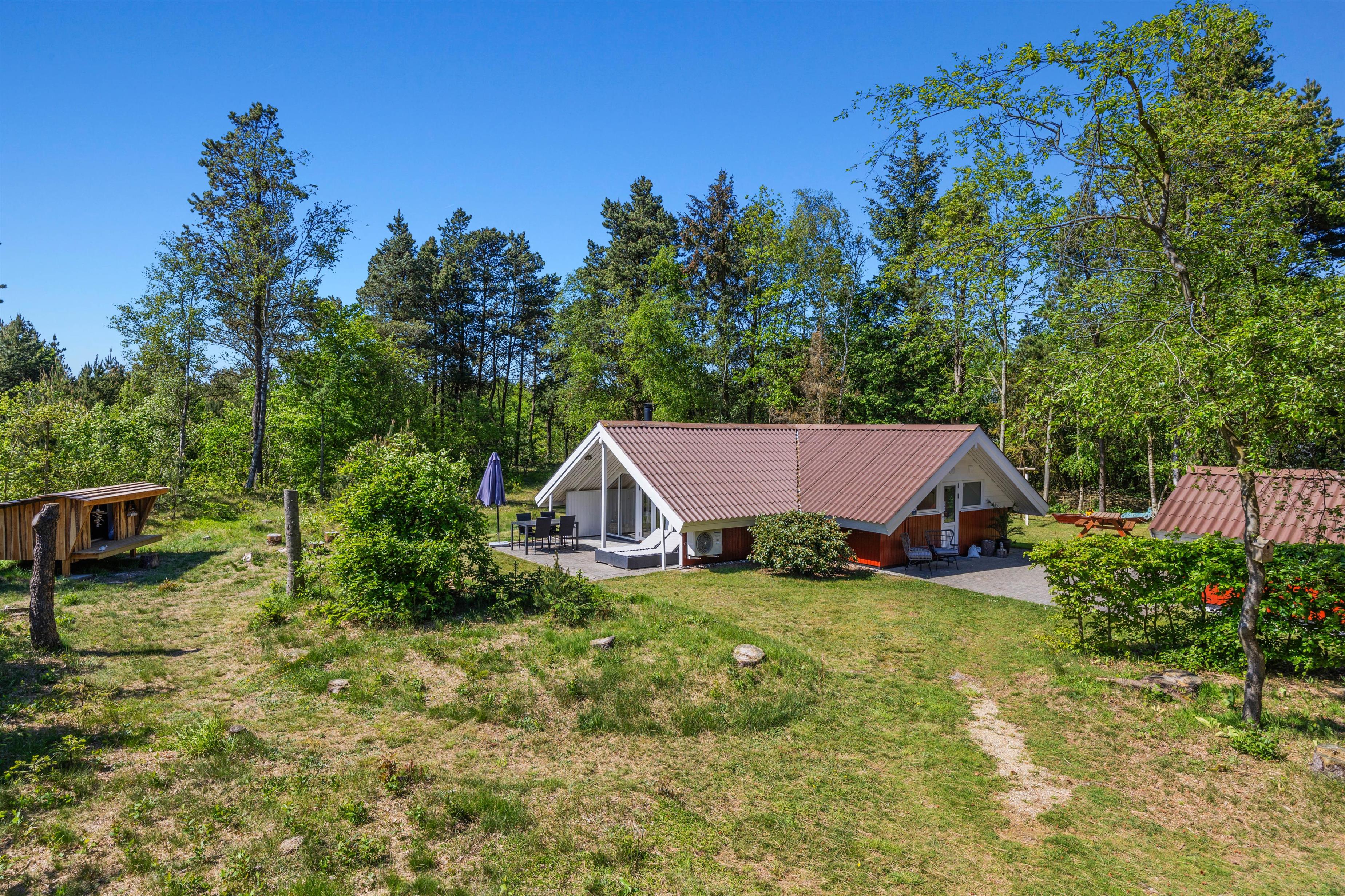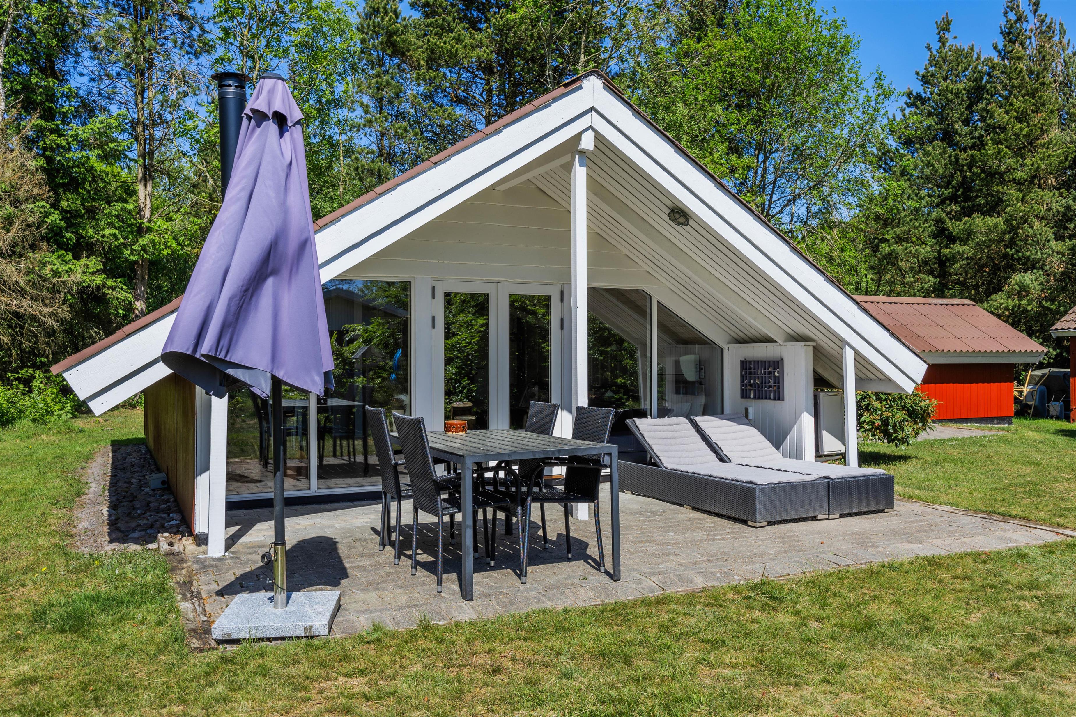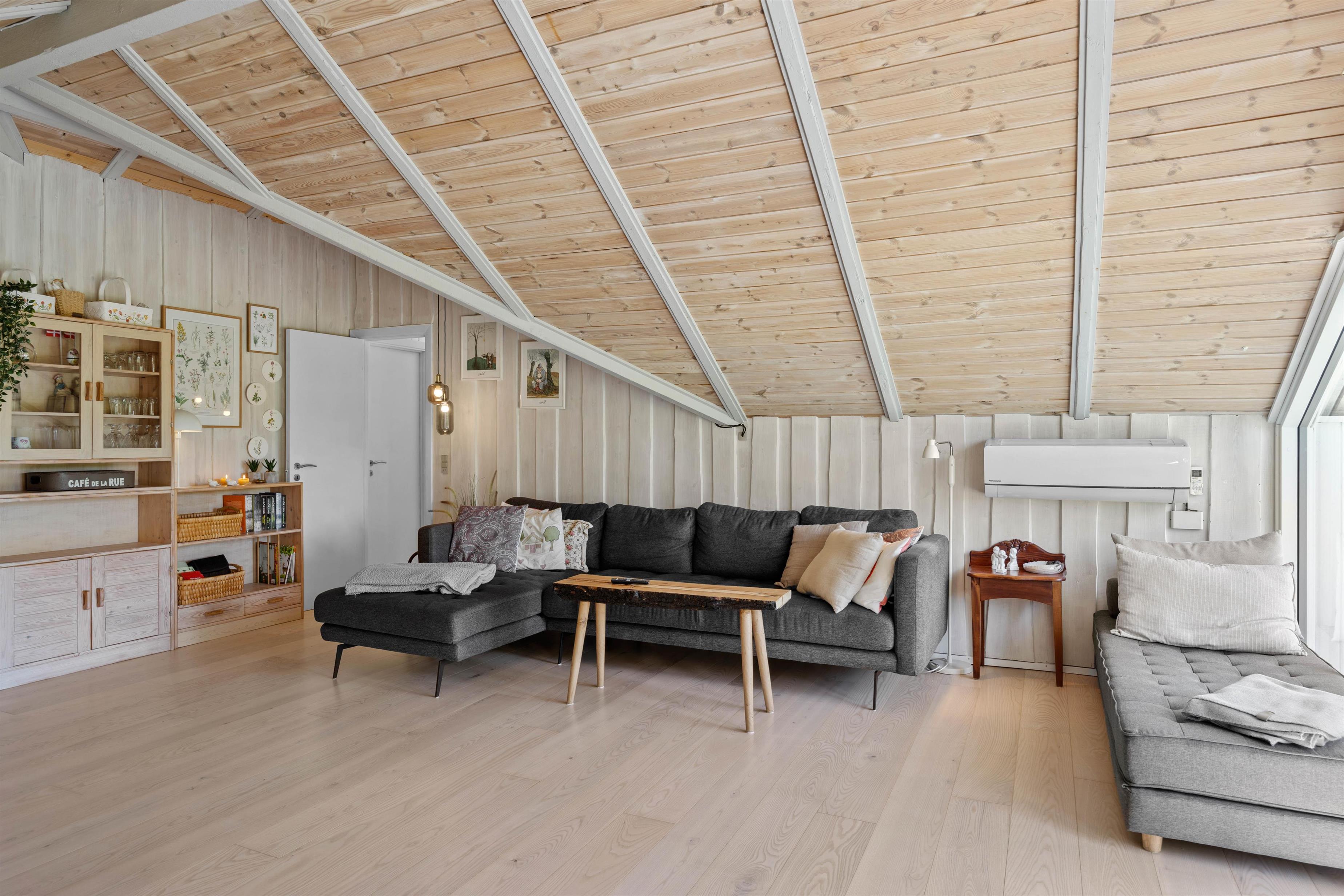 As soon as you enter the holiday home, you'll feel the classic atmosphere of a Danish holiday retreat. The walls and ceilings throughout are wood-panelled, giving the holiday home a bright and welcoming ambiance. The heart of this beautiful holiday home is the large living area, combining the living room, kitchen and dining room in one space.