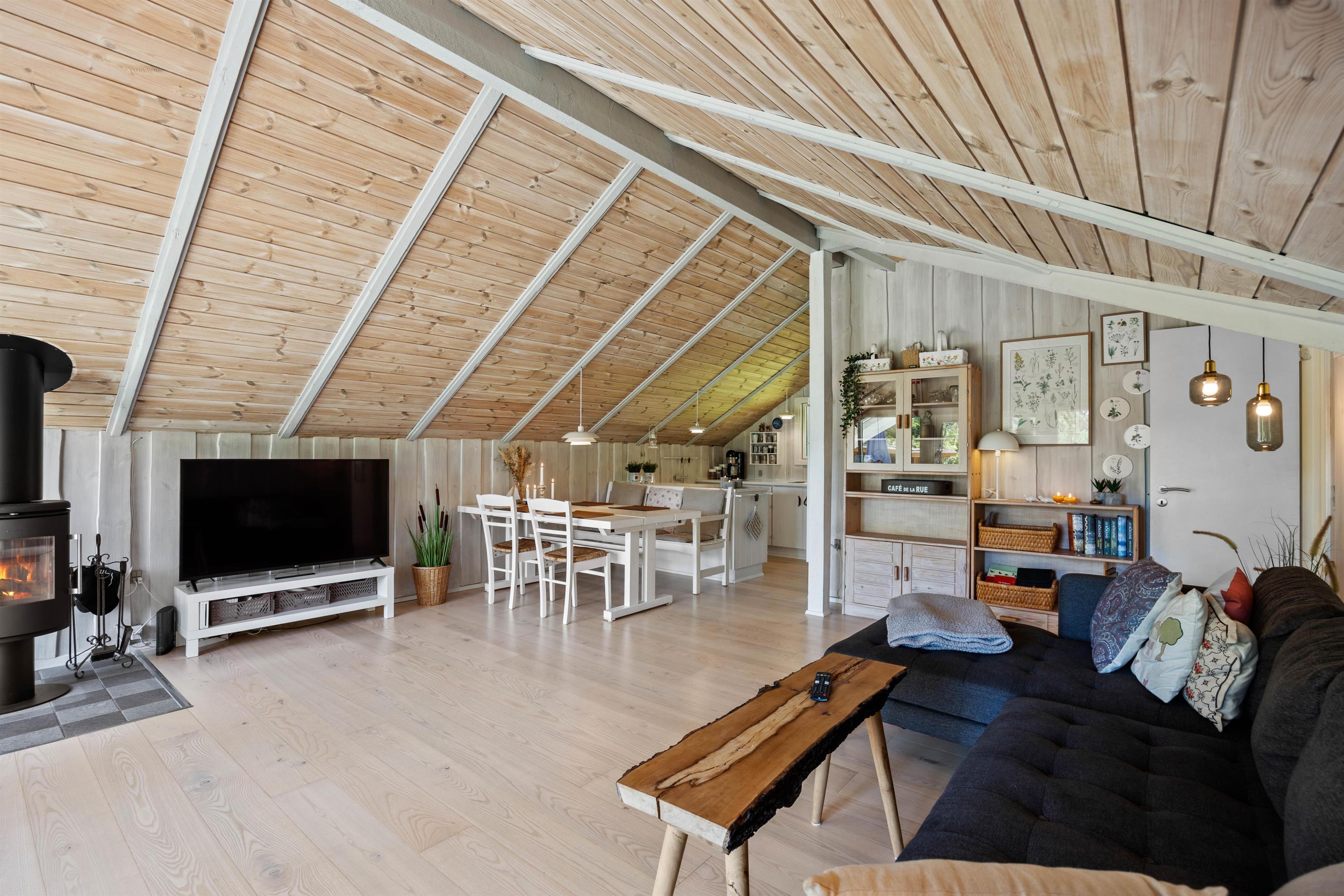 The open-plan design allows the whole family to enjoy their holiday together. Whether you're baking or cooking in the small but well-equipped kitchen, or completing puzzles at the dining table - everyone will feel at home here. While streaming your favourite film on the sofa, you can watch the flames in the wood-burning stove and enjoy its cosy warmth.