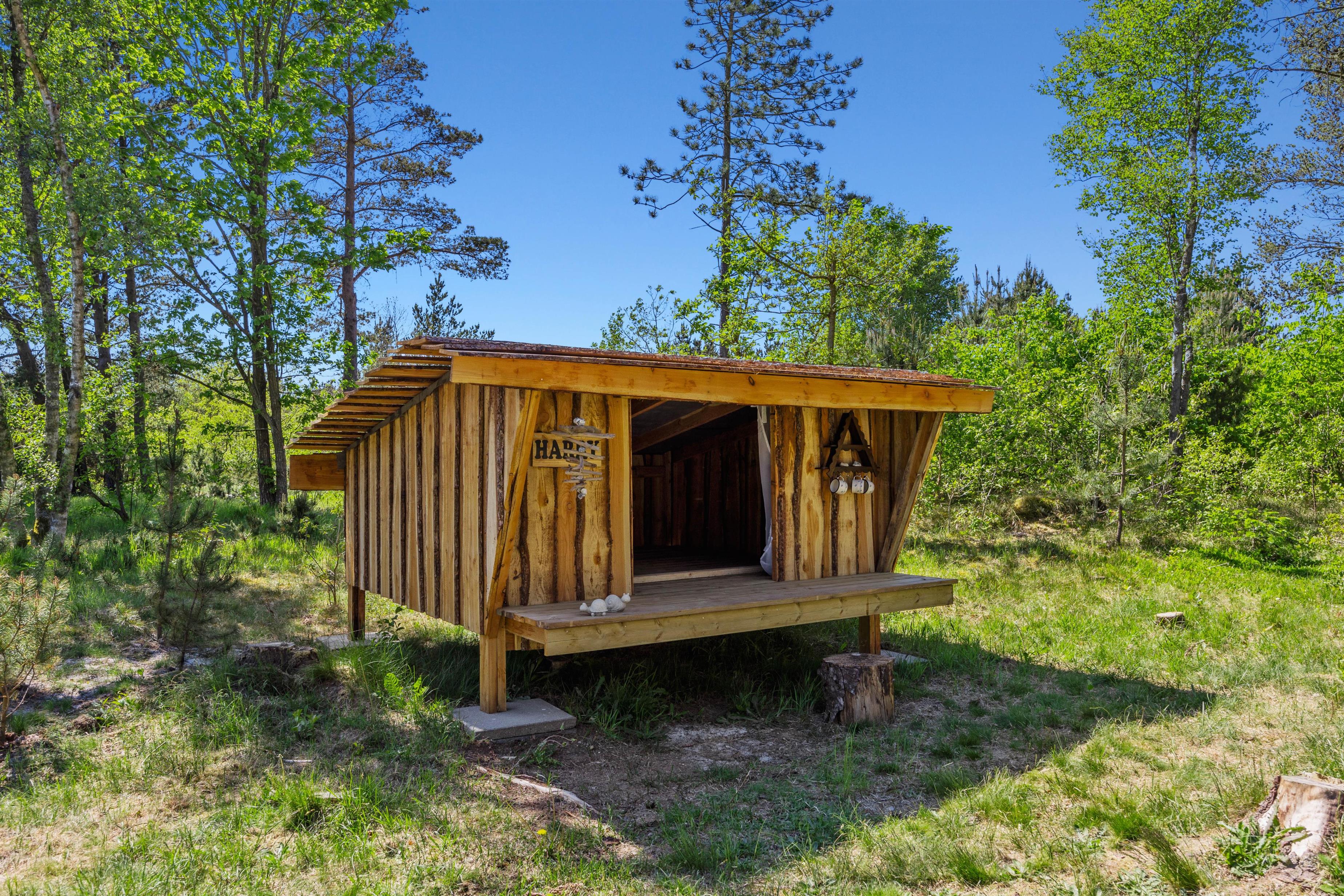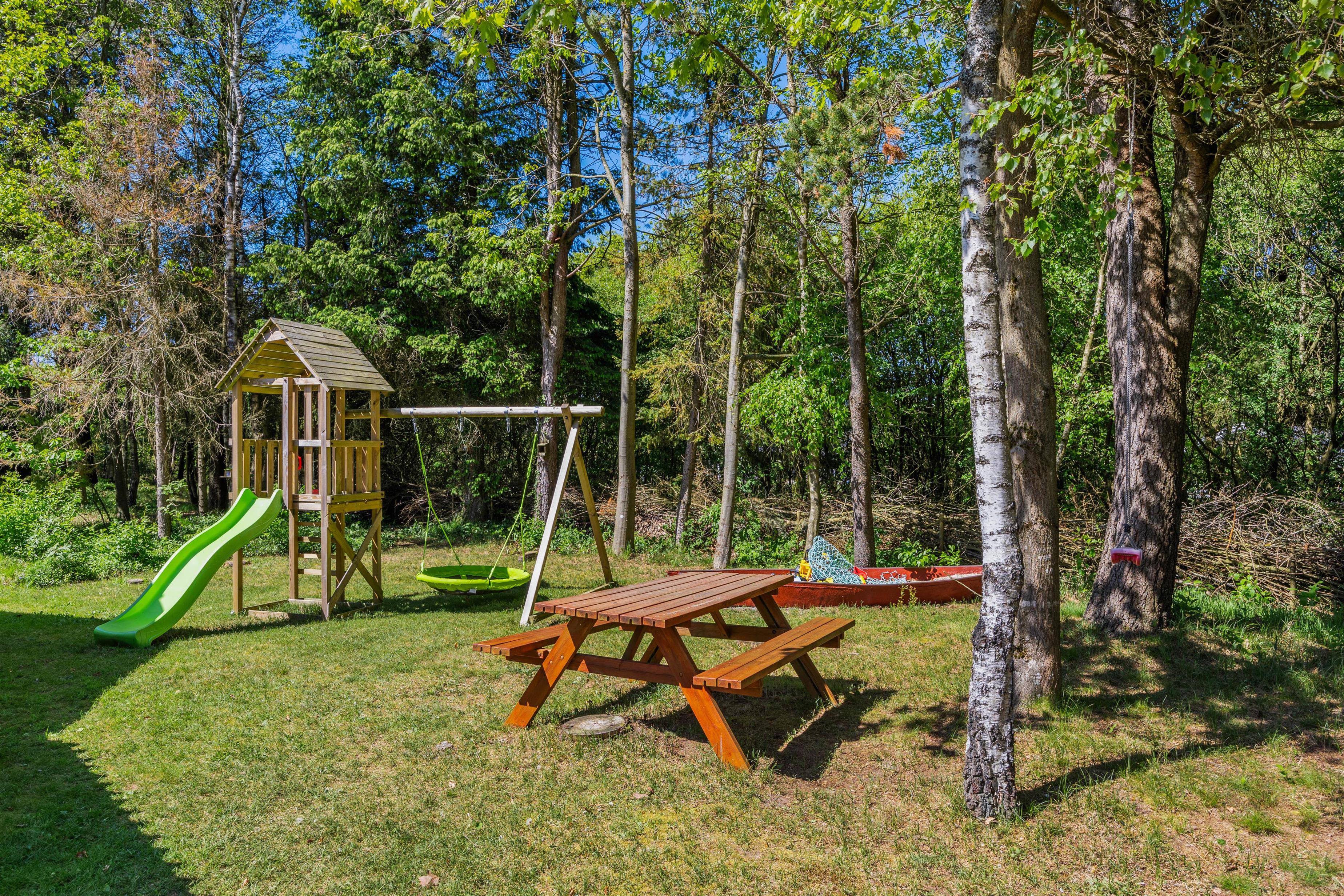 The open, partially covered terrace flows seamlessly into the traditional natural grounds, perfect for relaxation. Garden furniture, sun loungers, parasol and a barbecue are all provided. Children will be delighted once they discover the garden. Not only is there plenty to explore – little ones can enjoy the swing, sandbox, and play tower with slide. A special feature is the shelter, where you can spend warm summer nights sleeping outdoors.