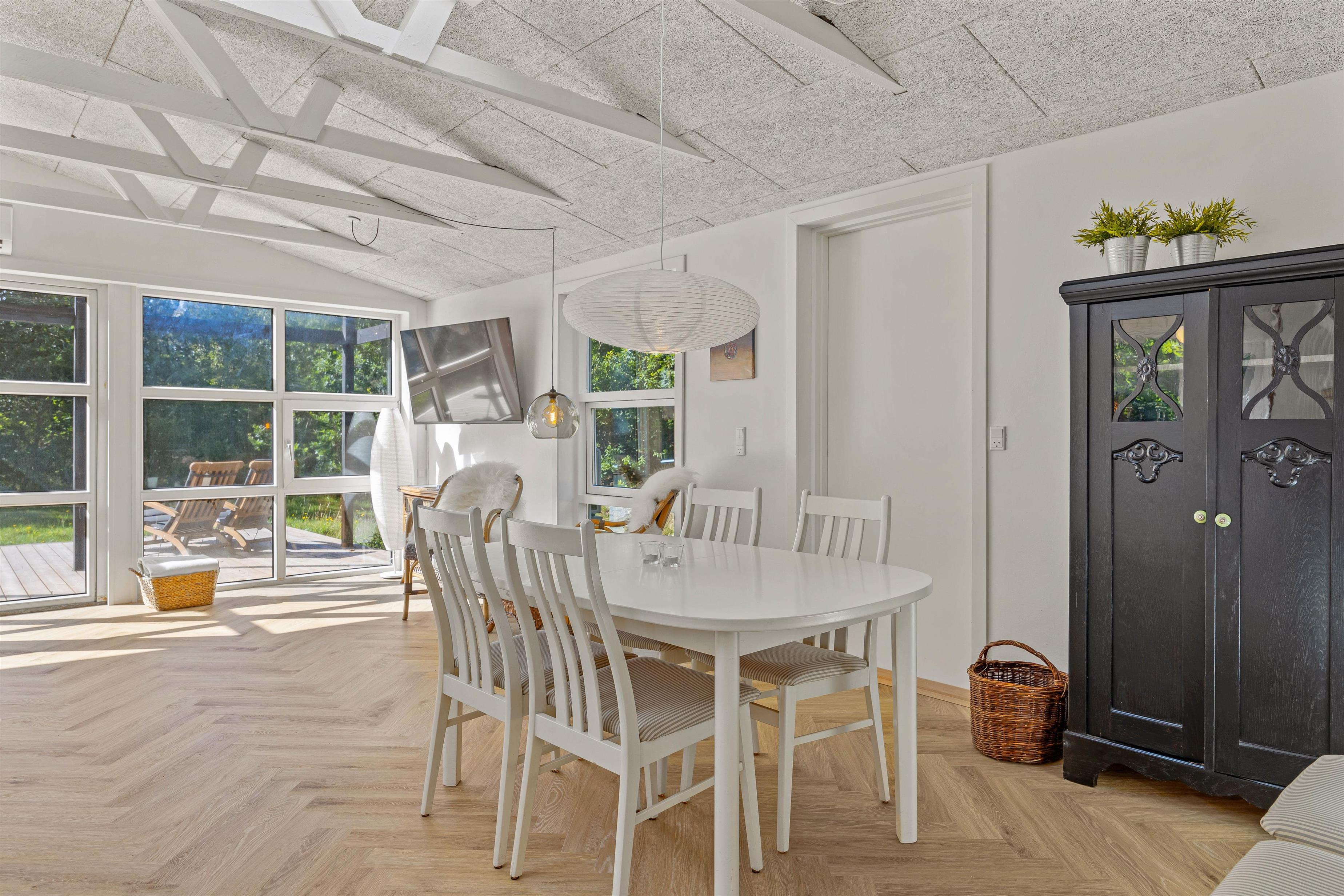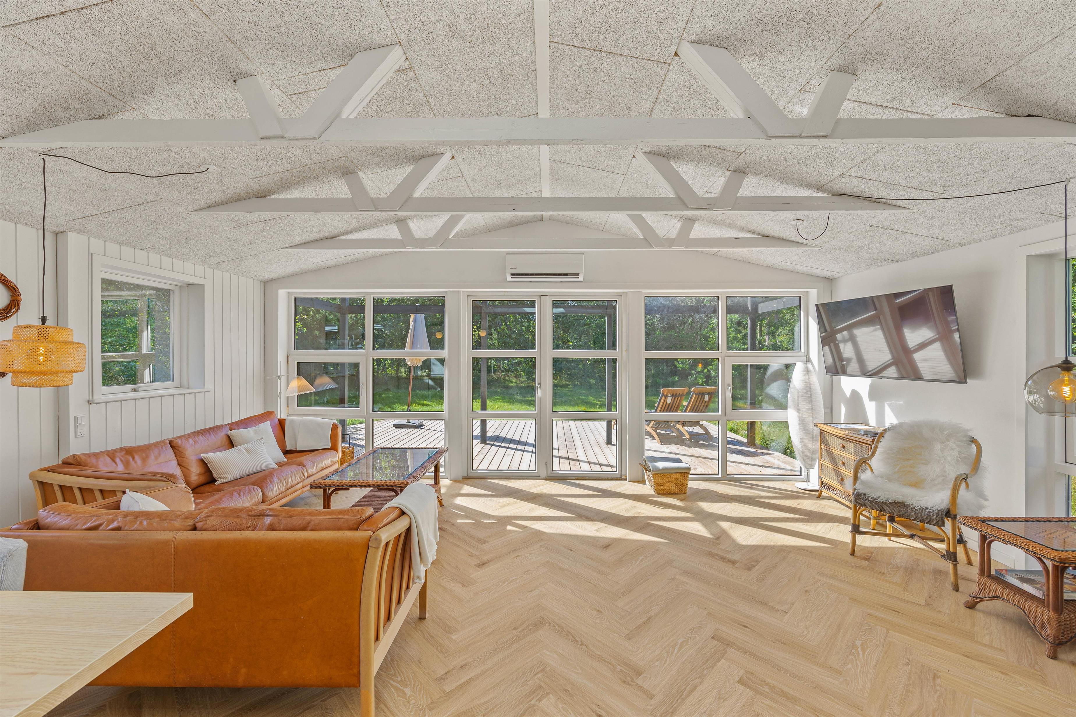 High ceilings, light flooring and white walls create a pleasant, light-filled atmosphere perfect for relaxation. Large windows flood the holiday home with natural light and offer beautiful views of the mature natural garden surrounded by tall pine trees. The comfortable sofa invites you to unwind - whether reading a book or enjoying a film night.
