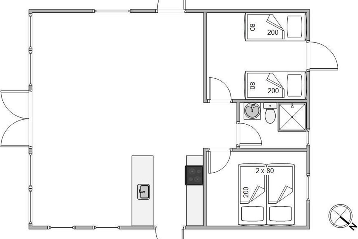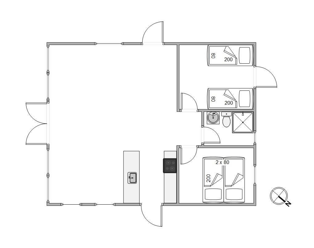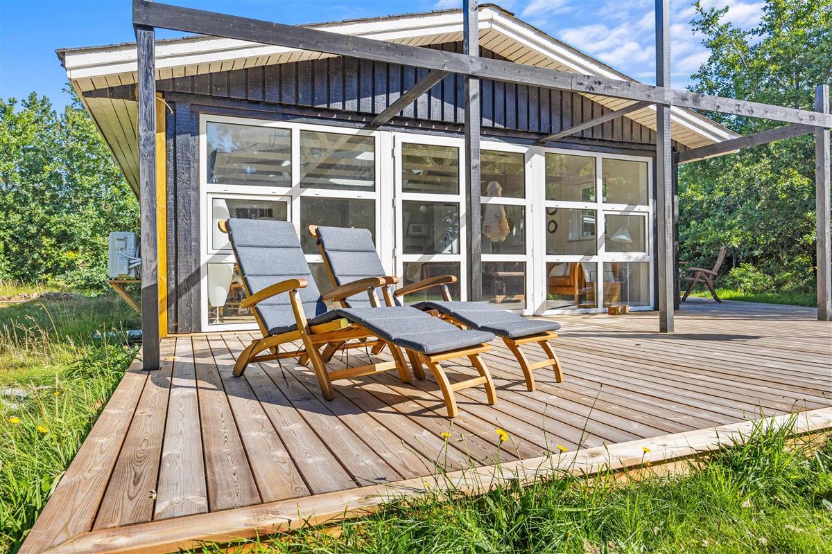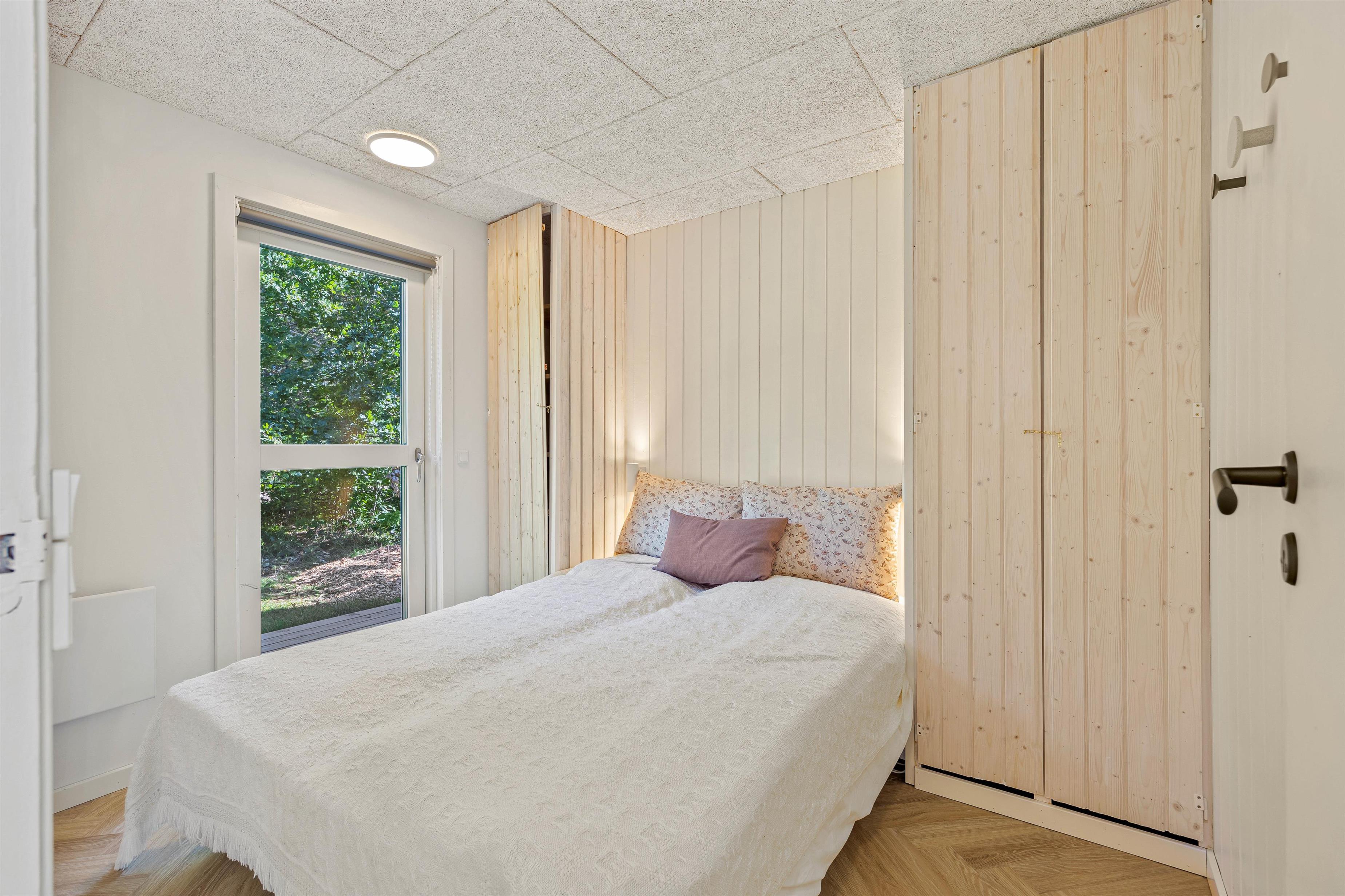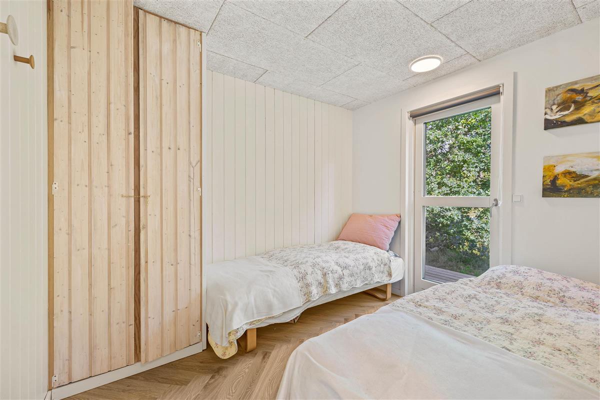 On cooler evenings, an energy-efficient heat pump provides comfortable warmth, while the open-plan kitchen is equipped with everything needed to prepare delicious meals. The open-plan layout ensures no one is isolated while cooking, creating a sociable atmosphere. Gather around the large dining table for meals and evening board games. The dishwasher takes care of the cleaning up, leaving more time for enjoying each other's company. The bathroom features underfloor heating to keep your feet warm even on chilly days.