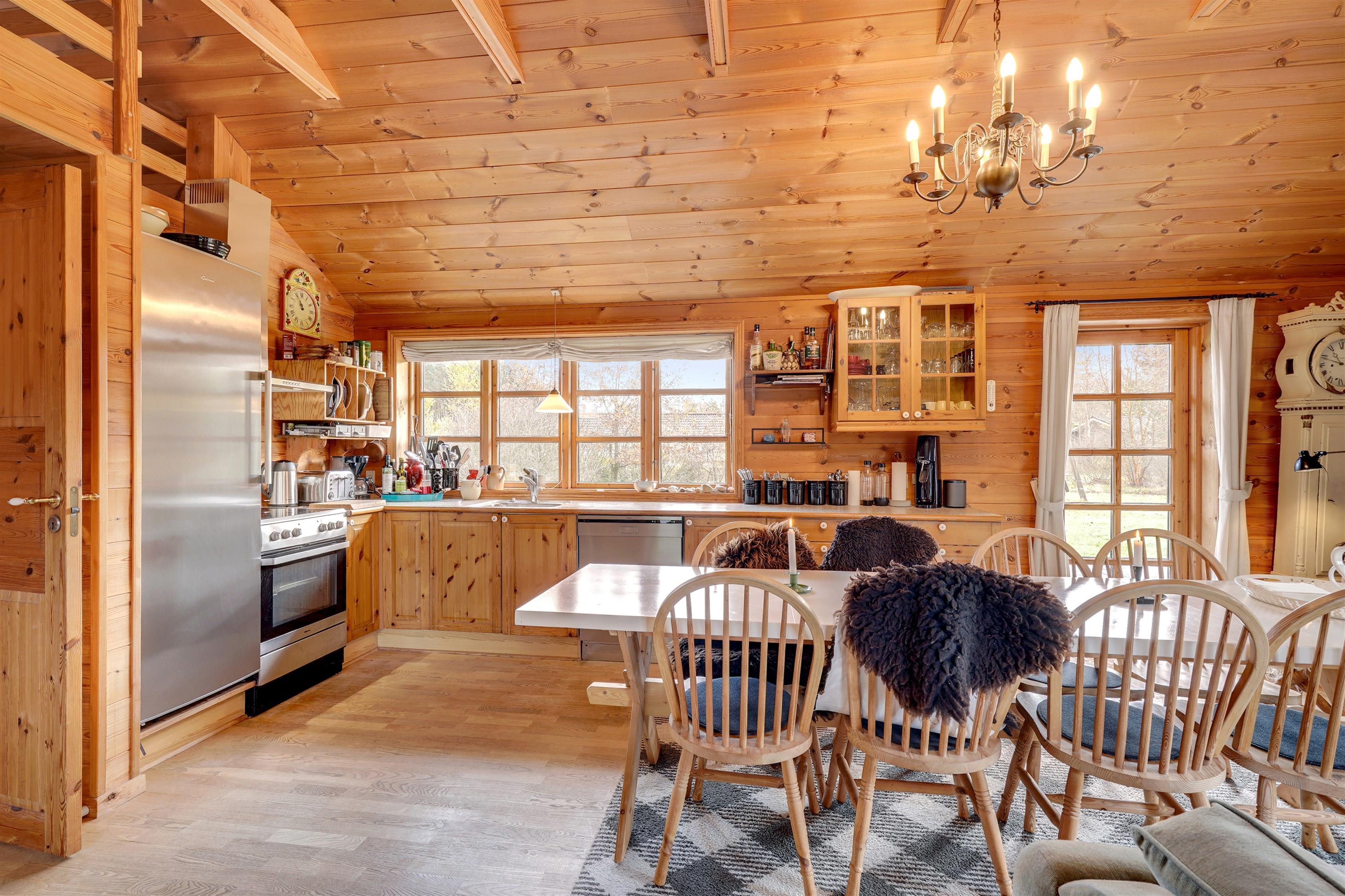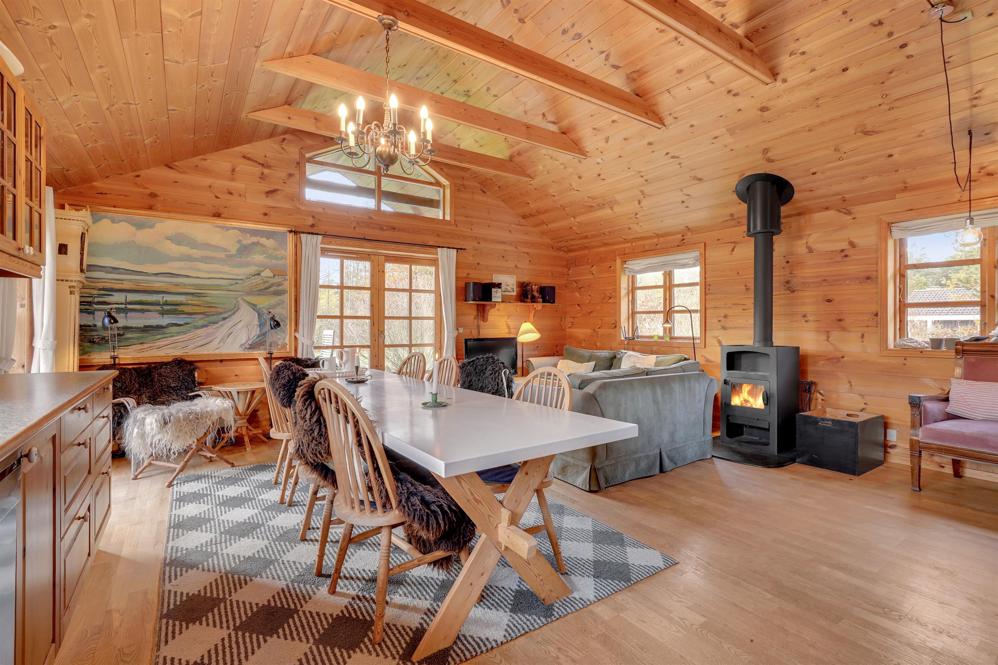 Im schönen Wohnbereich mit hohen Decken und viel natürlichem Holz könnt ihr es euch vor dem Fernseher bequem machen, während der Kaminofen für eine besonders behagliche Stimmung sorgt. Zusätzlich unterstützt euch eine energiesparende Wärmepumpe dabei, das Ferienhaus jederzeit angenehm zu temperieren.