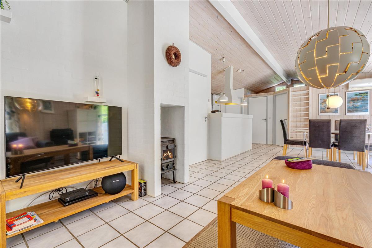 Inside the holiday home, you'll find an atmosphere that perfectly captures the typical Danish 'hygge' character. The spacious living area invites you to linger. Here you can come together, relax and enjoy time with one another. The wood-burning stove provides comfortable warmth and a cosy atmosphere on cooler days.