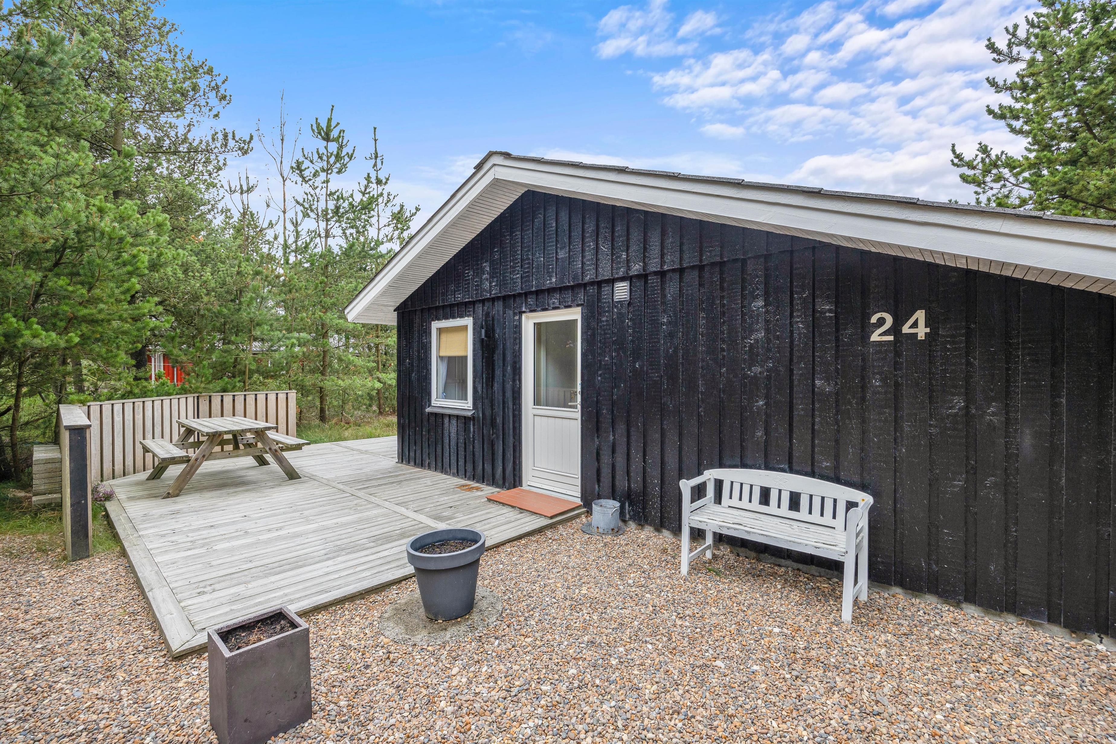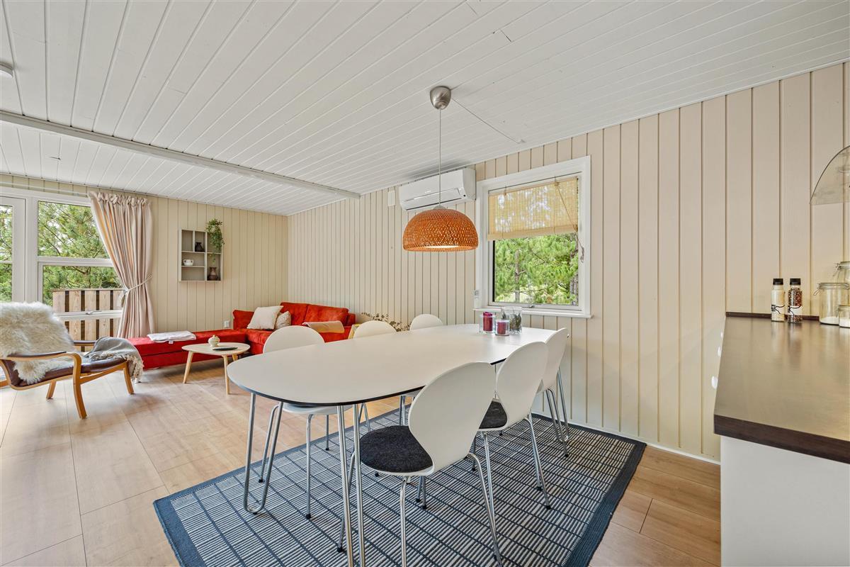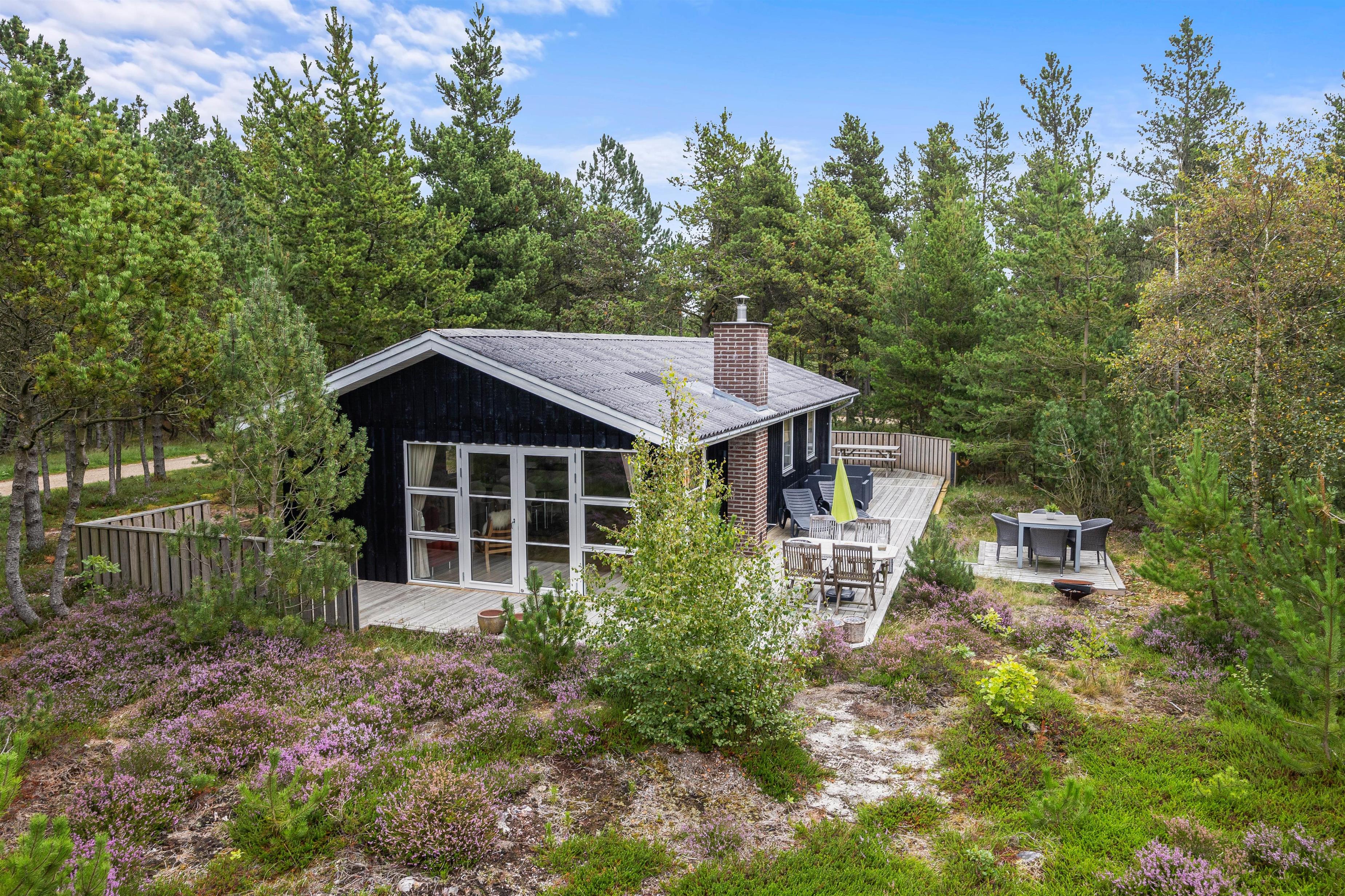 The holiday home sits on a beautiful natural plot, surrounded by tall trees and heather. Here you can enjoy peace and relaxation amidst nature. The large wooden terrace extends almost the entire length of the holiday home and offers several cosy seating areas where you can enjoy the sun from different spots. Treat yourself to a break on the sun loungers, close your eyes, take a deep breath and listen to the gentle rustling of trees and cheerful birdsong.