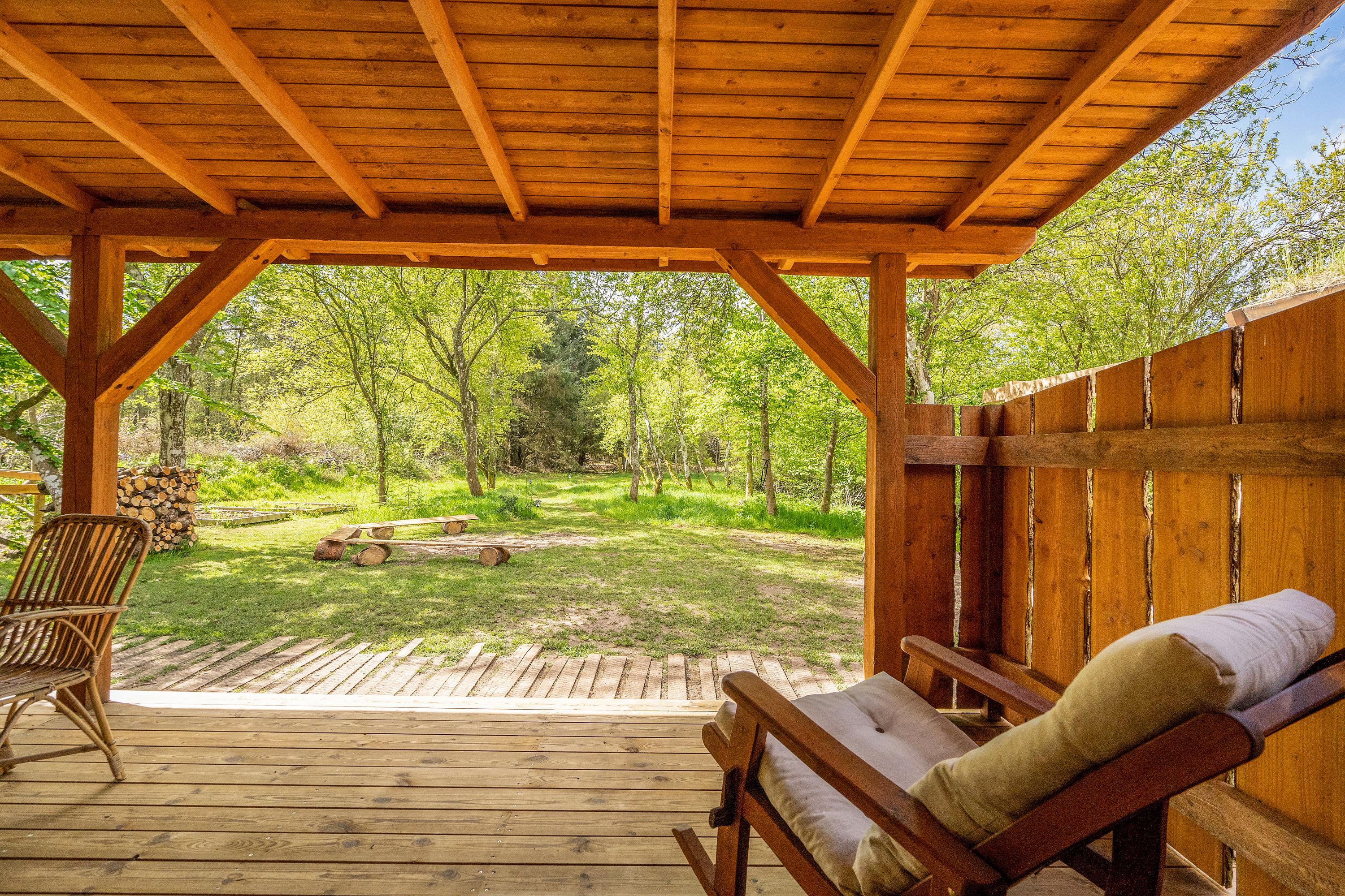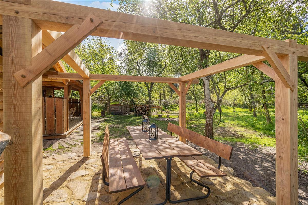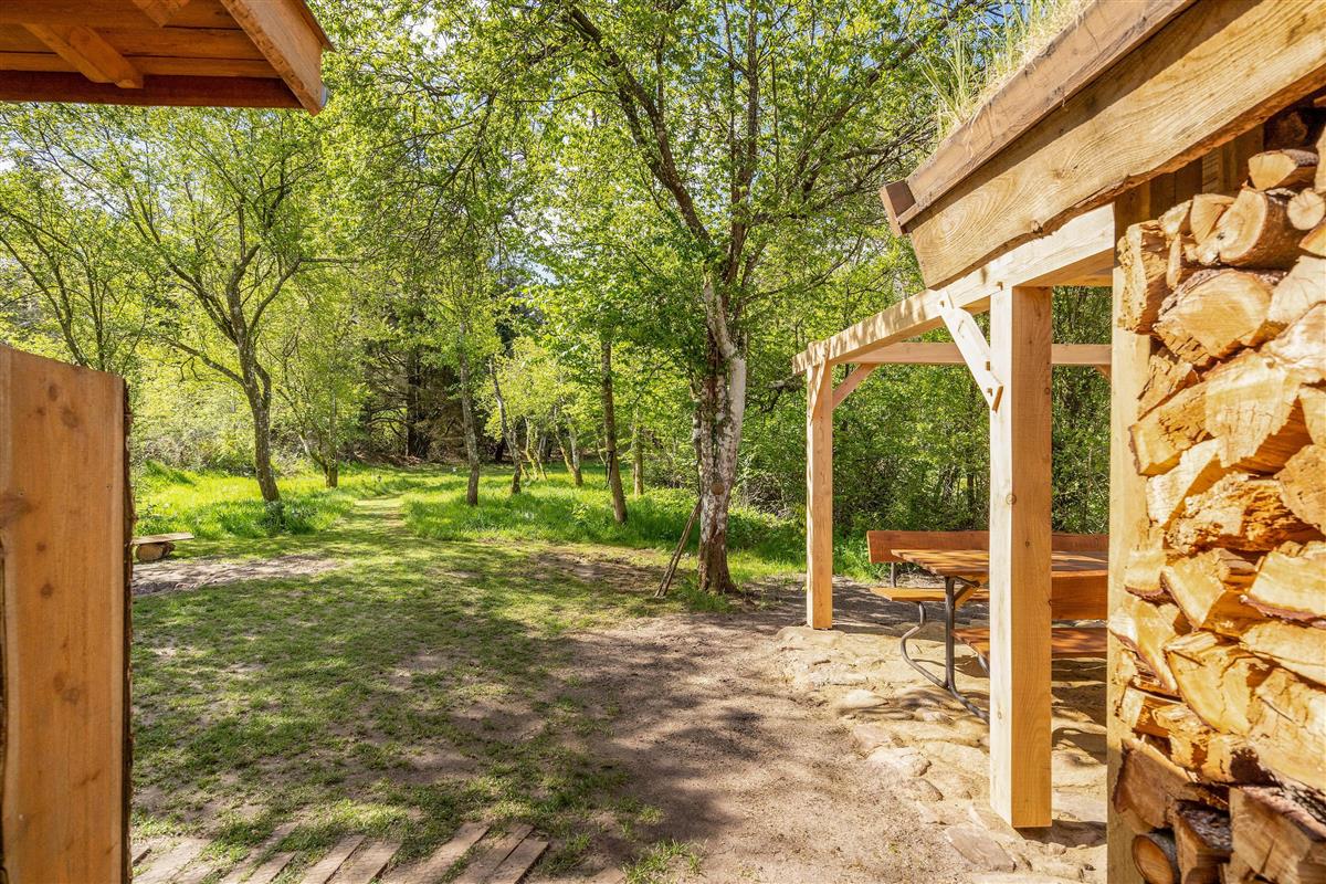 Several terraces surround the holiday home, including a large south-facing terrace with cover and screening. The grounds also feature a fire pit and a small, secure dog exercise area.