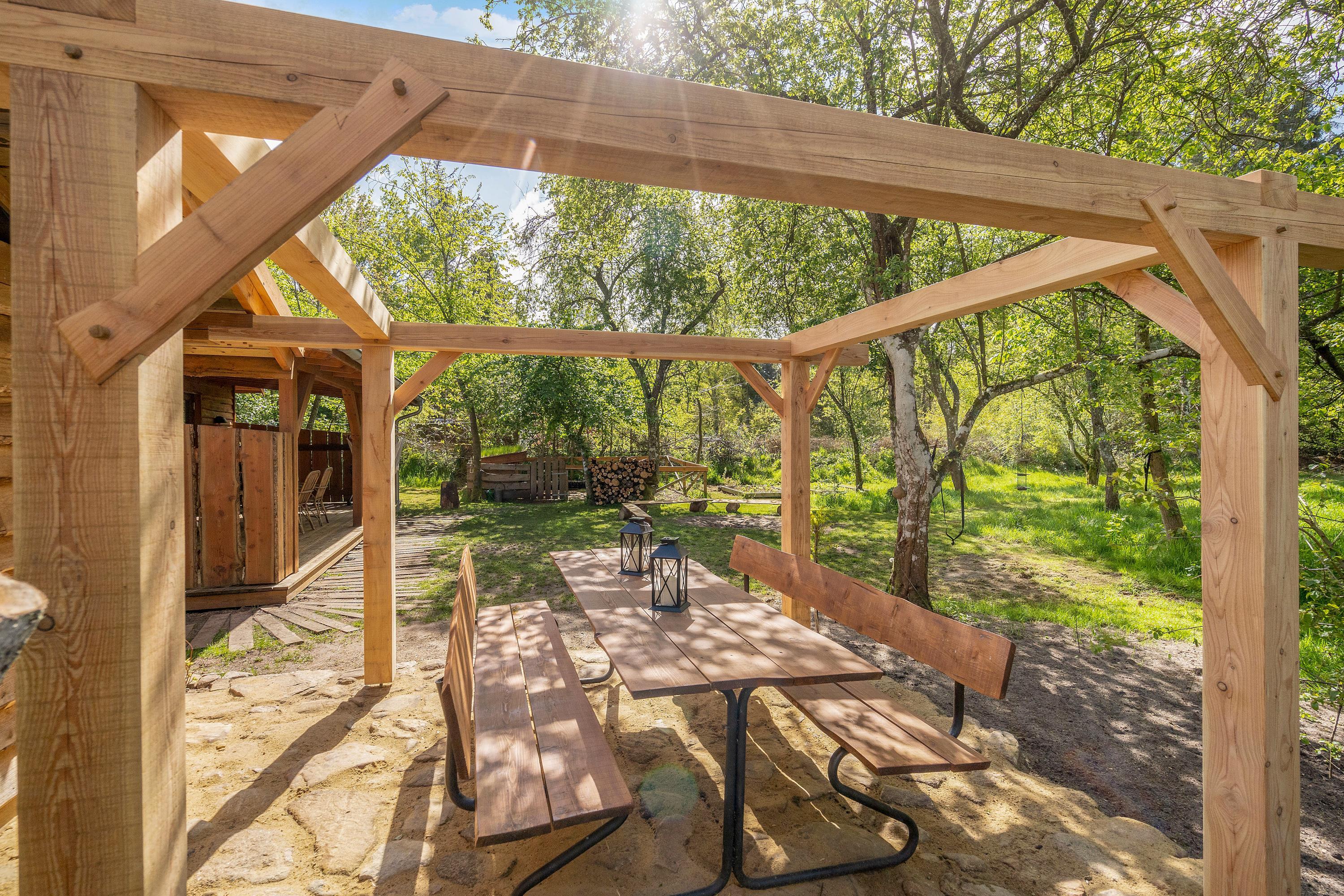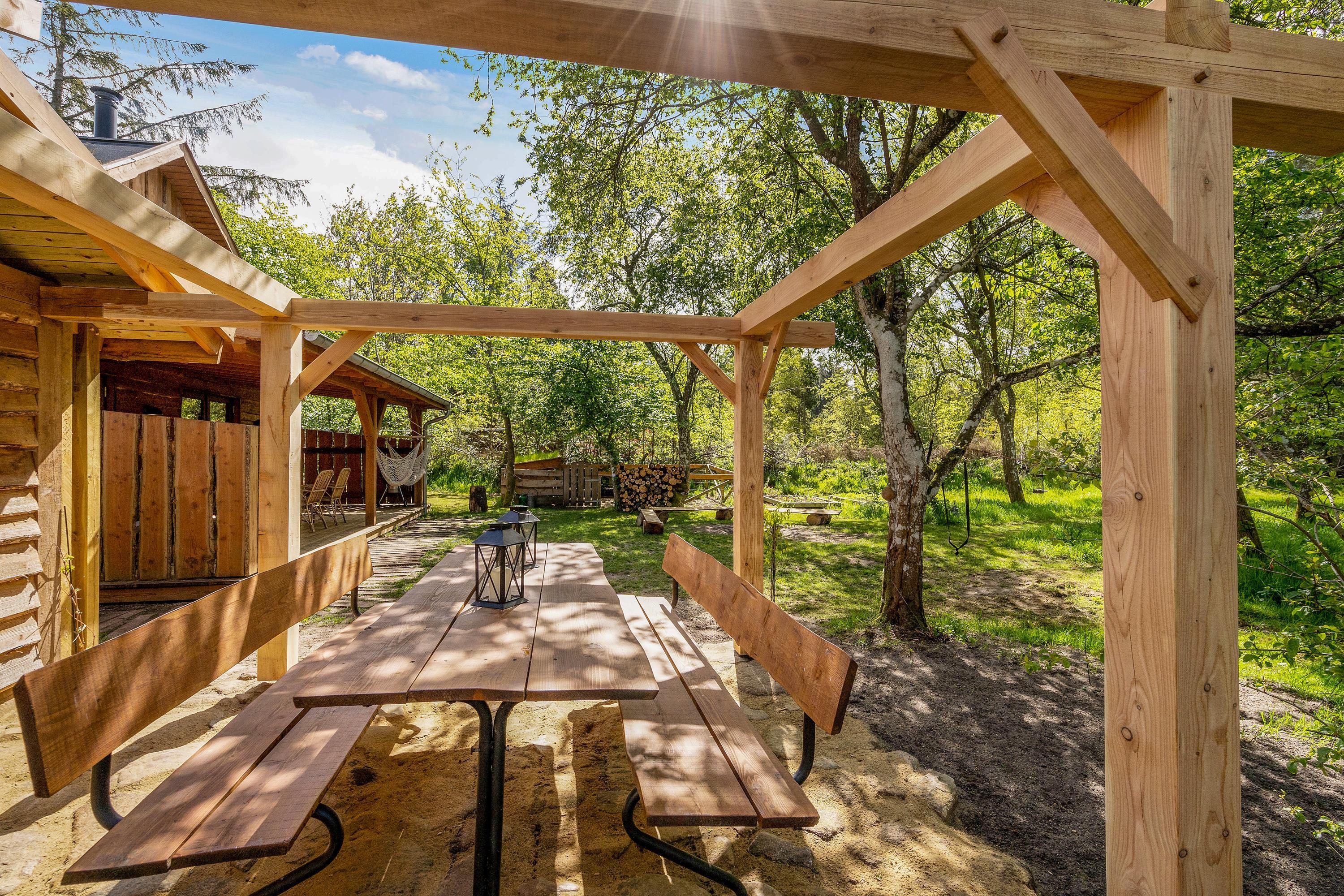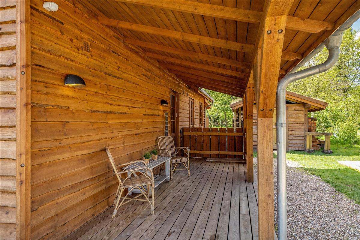 Several terraces surround the holiday home, including a large south-facing terrace with cover and screening. The grounds also feature a fire pit and a small, secure dog exercise area.