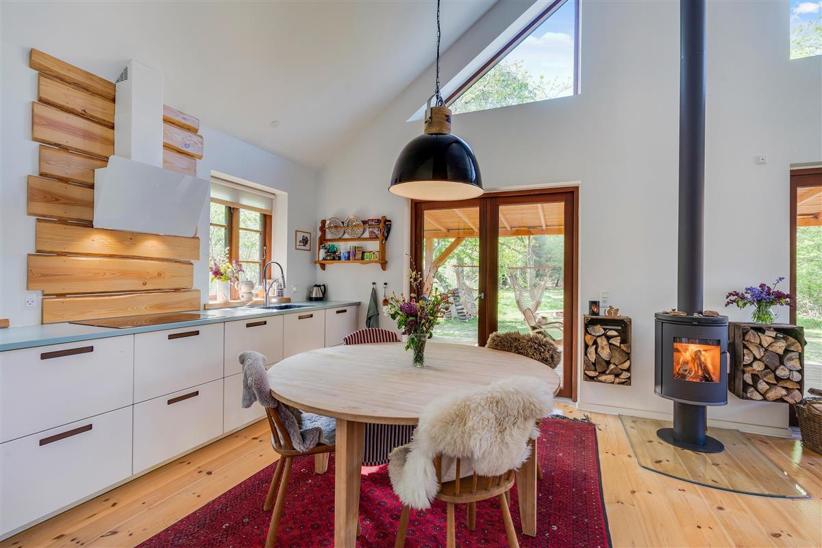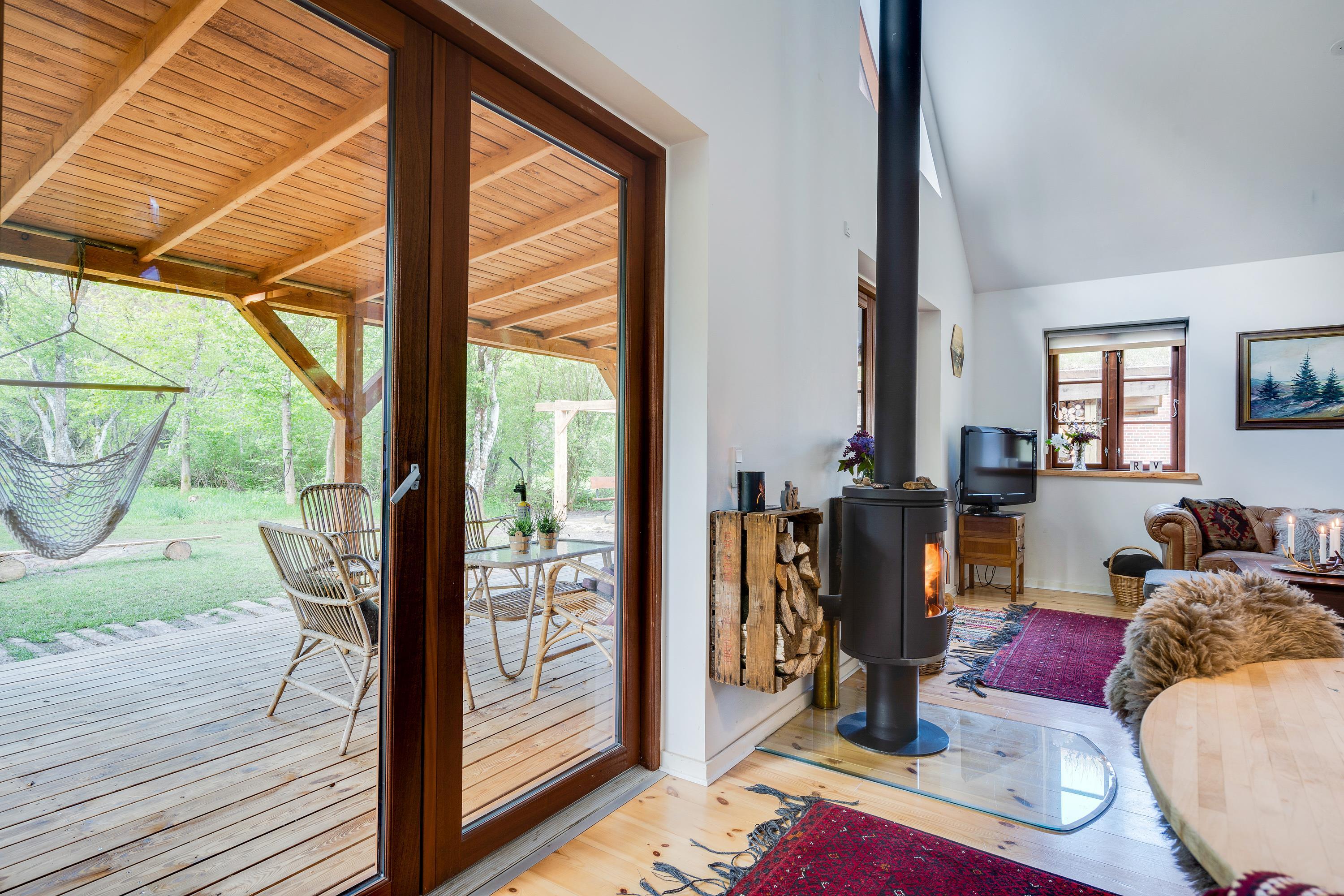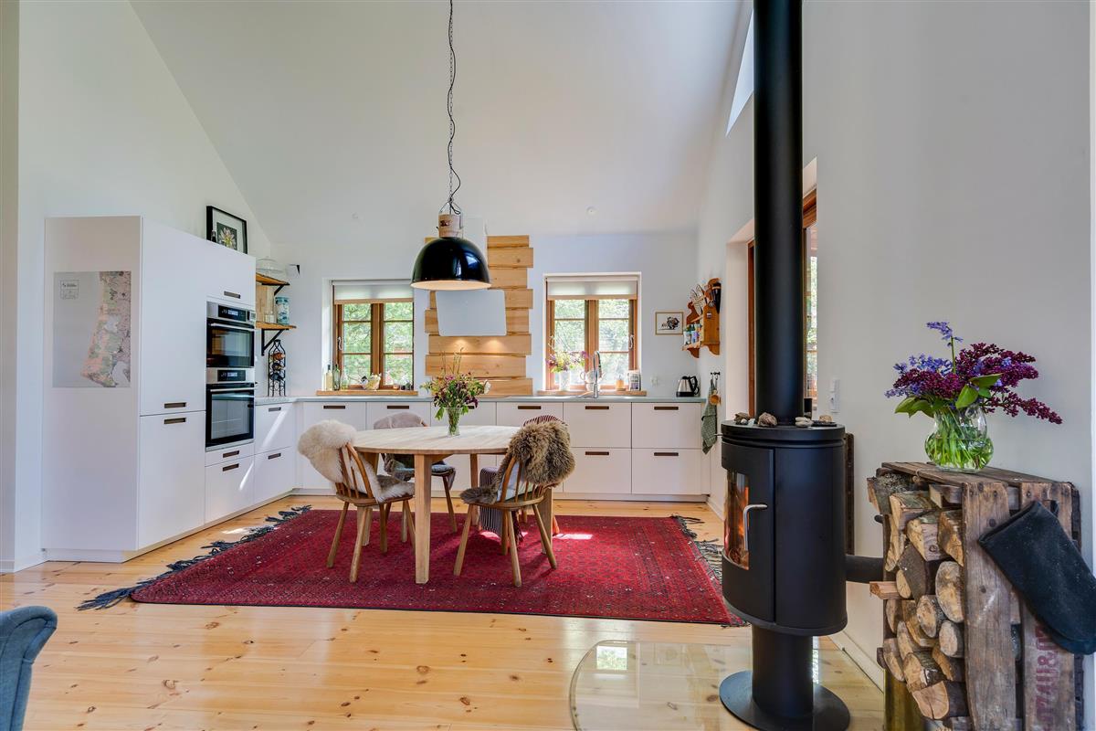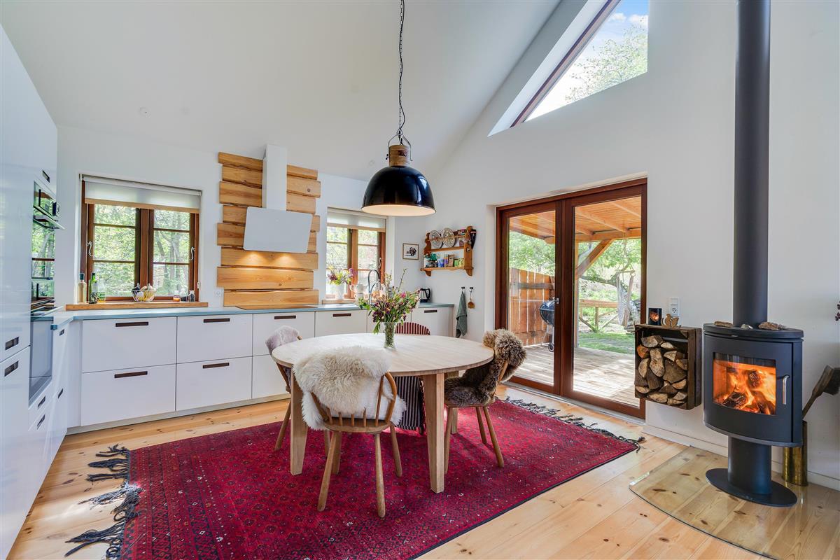 The heart of the holiday home is the open-plan living room with underfloor heating, where the living and kitchen areas combine in a single space. Here you'll find the wood-burning stove, creating a wonderful holiday atmosphere and providing cosy warmth on cooler days. Large windows in the living room offer beautiful views of the forest and green surroundings.