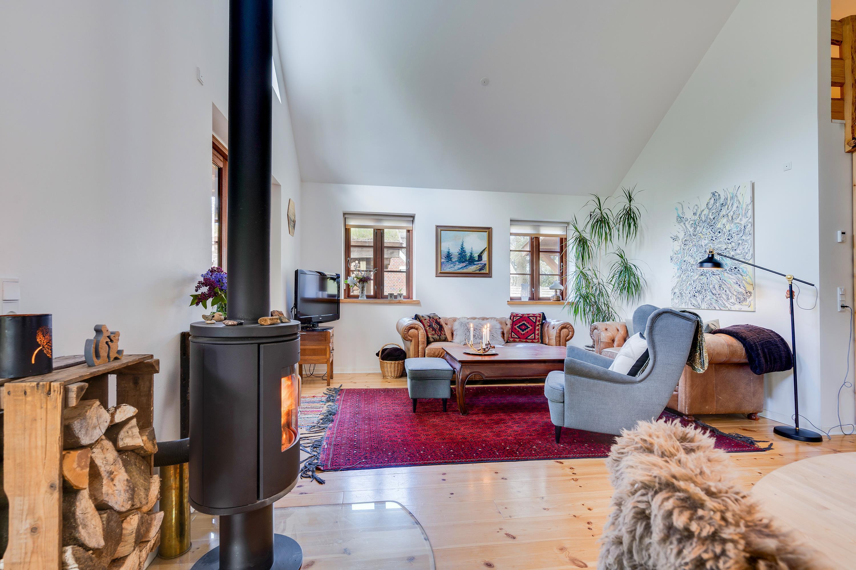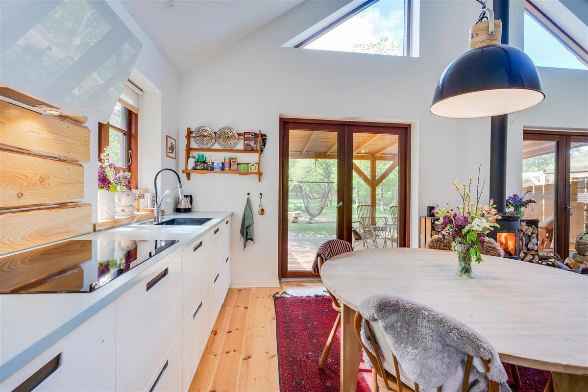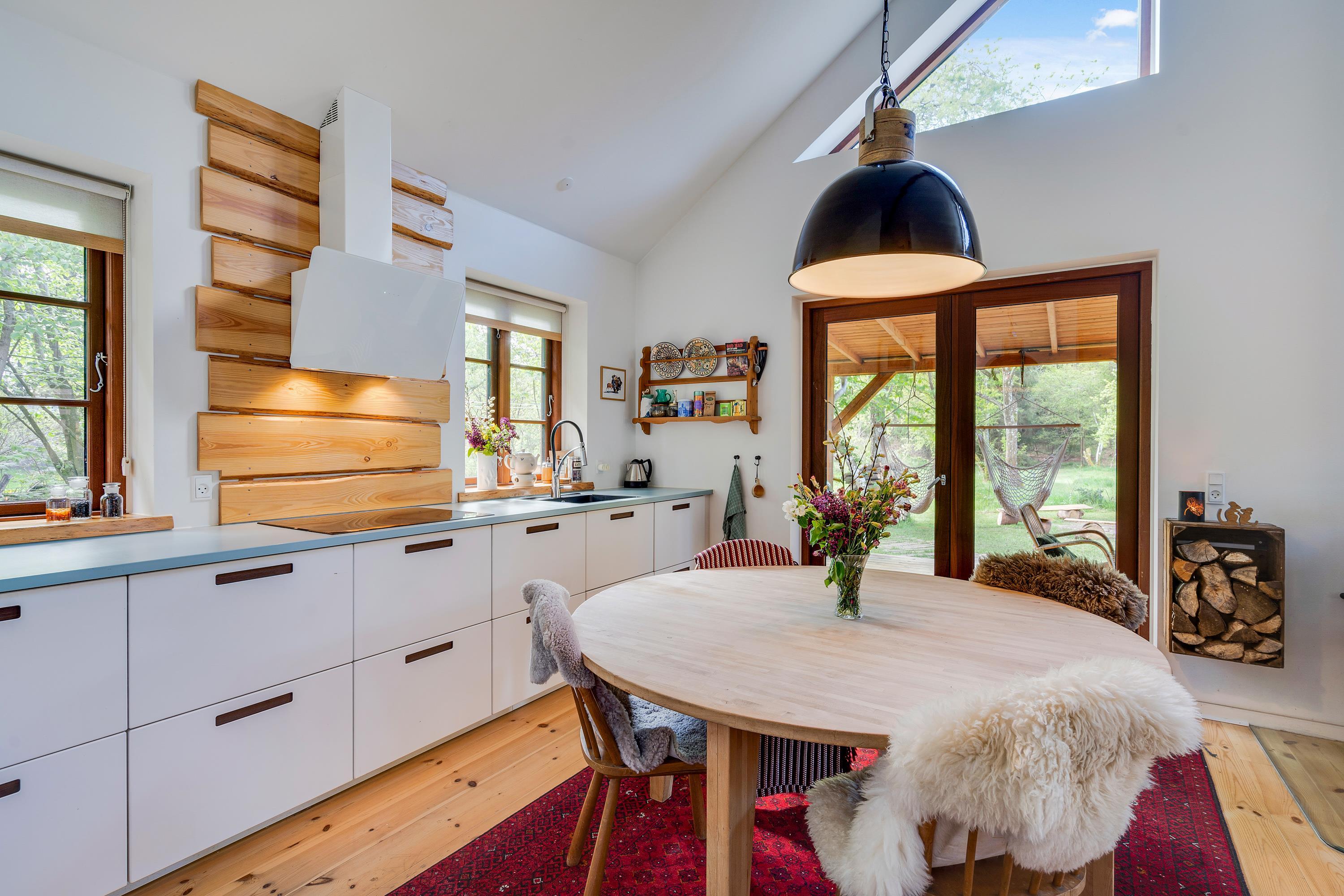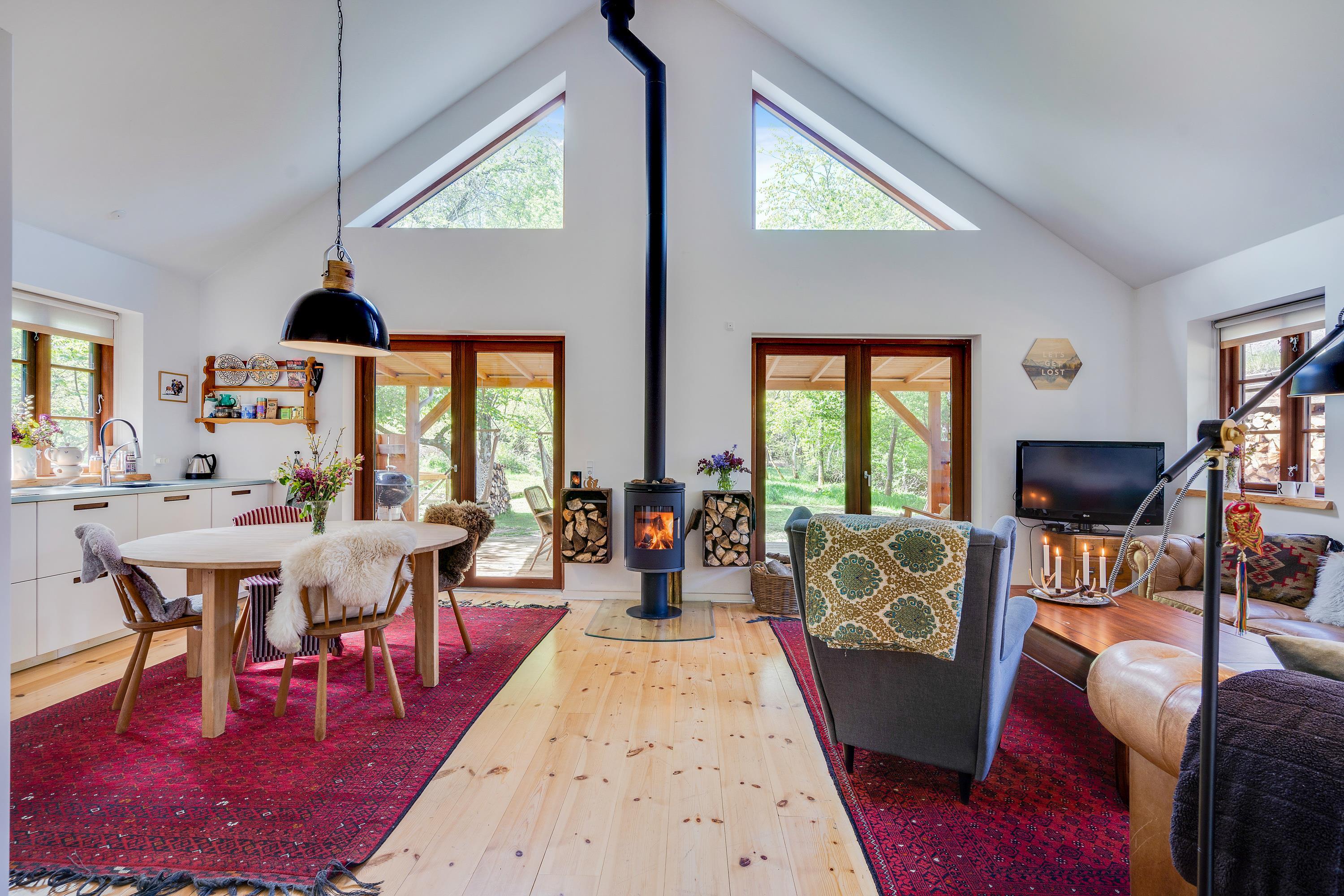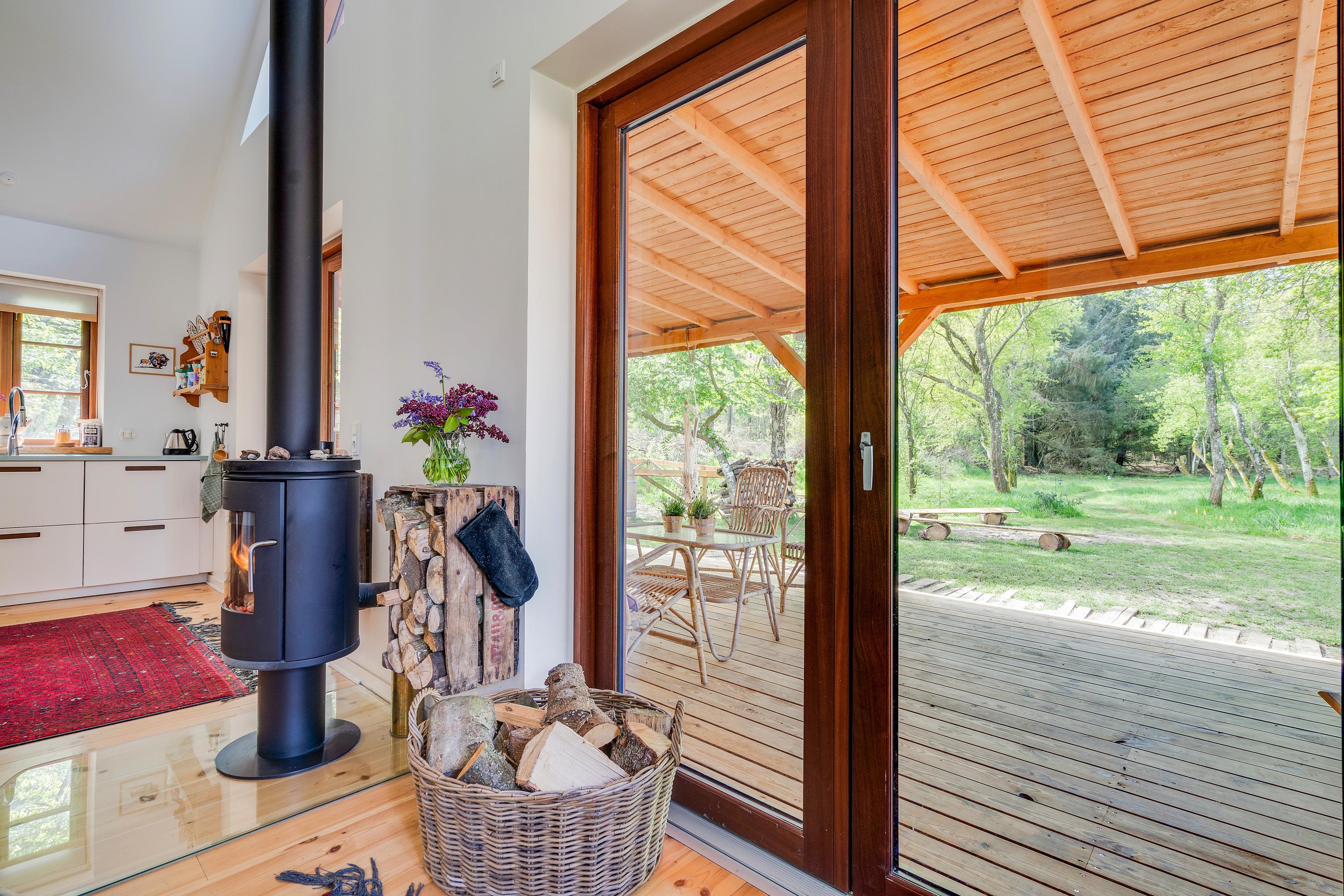 The heart of the holiday home is the open-plan living room with underfloor heating, where the living and kitchen areas combine in a single space. Here you'll find the wood-burning stove, creating a wonderful holiday atmosphere and providing cosy warmth on cooler days. Large windows in the living room offer beautiful views of the forest and green surroundings.