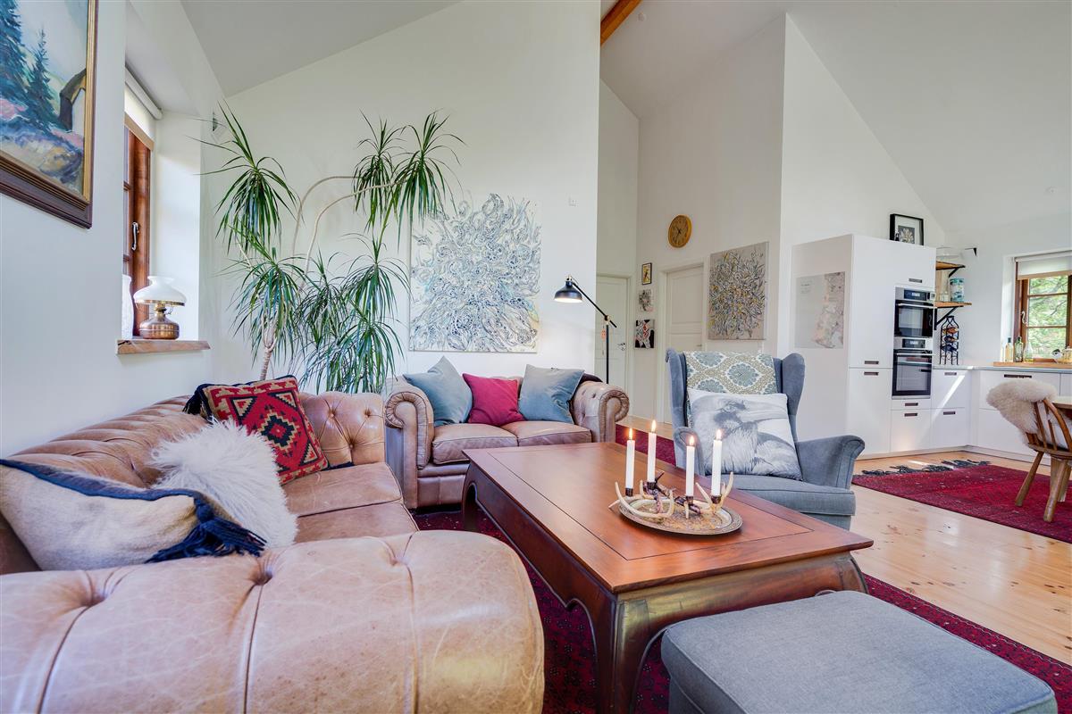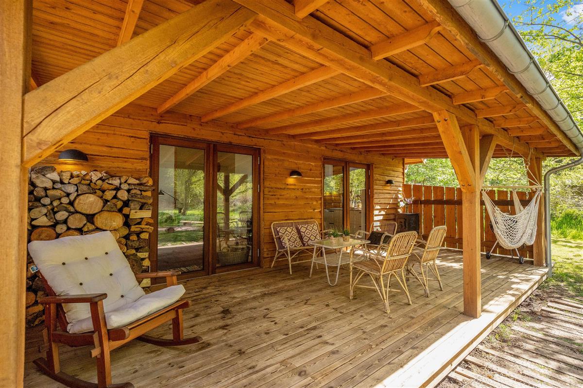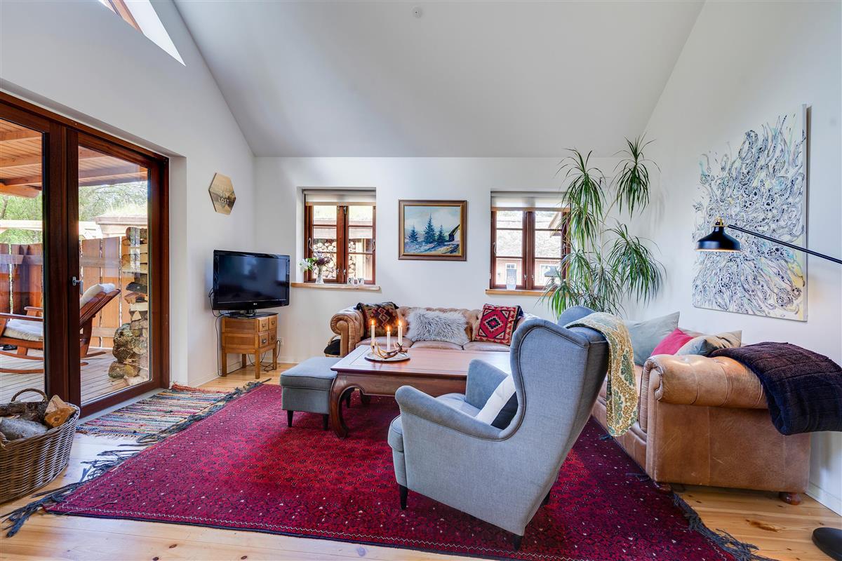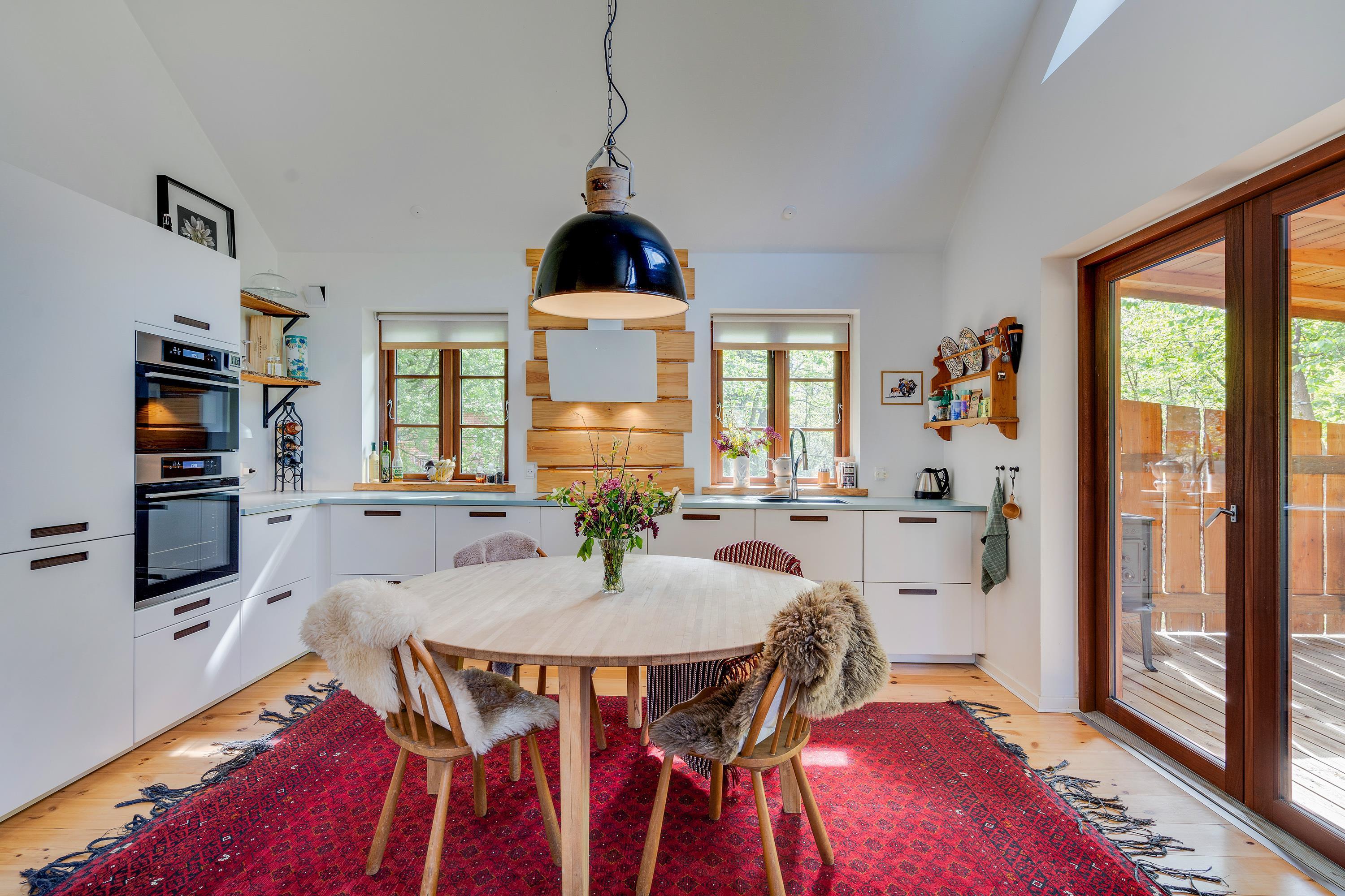 The heart of the holiday home is the open-plan living room with underfloor heating, where the living and kitchen areas combine in a single space. Here you'll find the wood-burning stove, creating a wonderful holiday atmosphere and providing cosy warmth on cooler days. Large windows in the living room offer beautiful views of the forest and green surroundings.