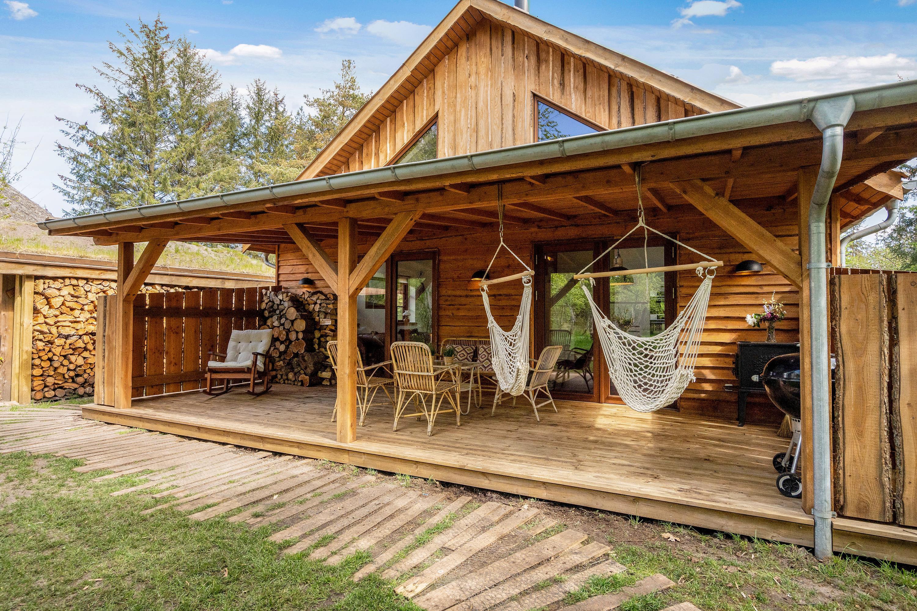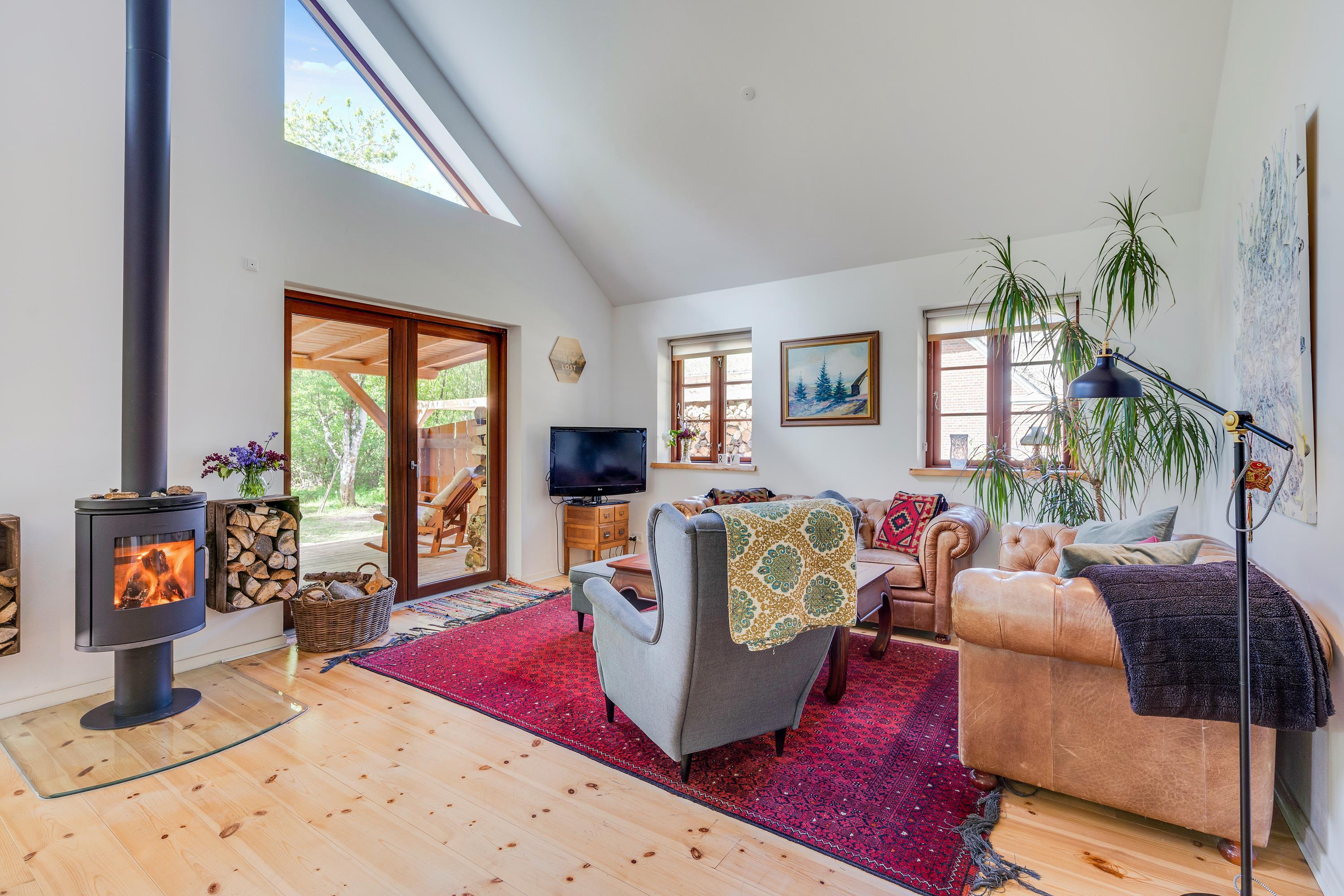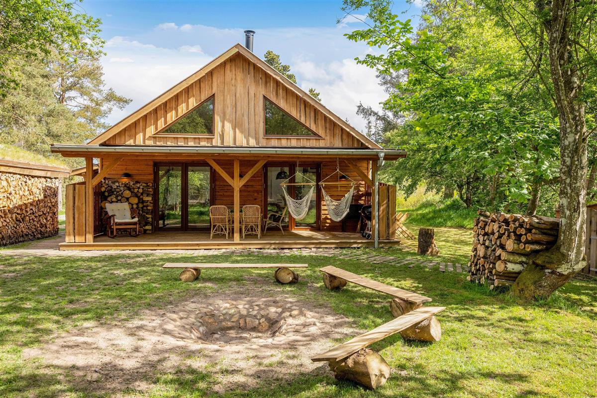 Then this unique holiday home in Houstrup is definitely worth a closer look. This spacious wooden house accommodates up to 5 people and 2 dogs. Located right next to the forest, it offers a fantastic outdoor area with beautiful terraces, your own fire pit, and a secure, fenced dog exercise area.