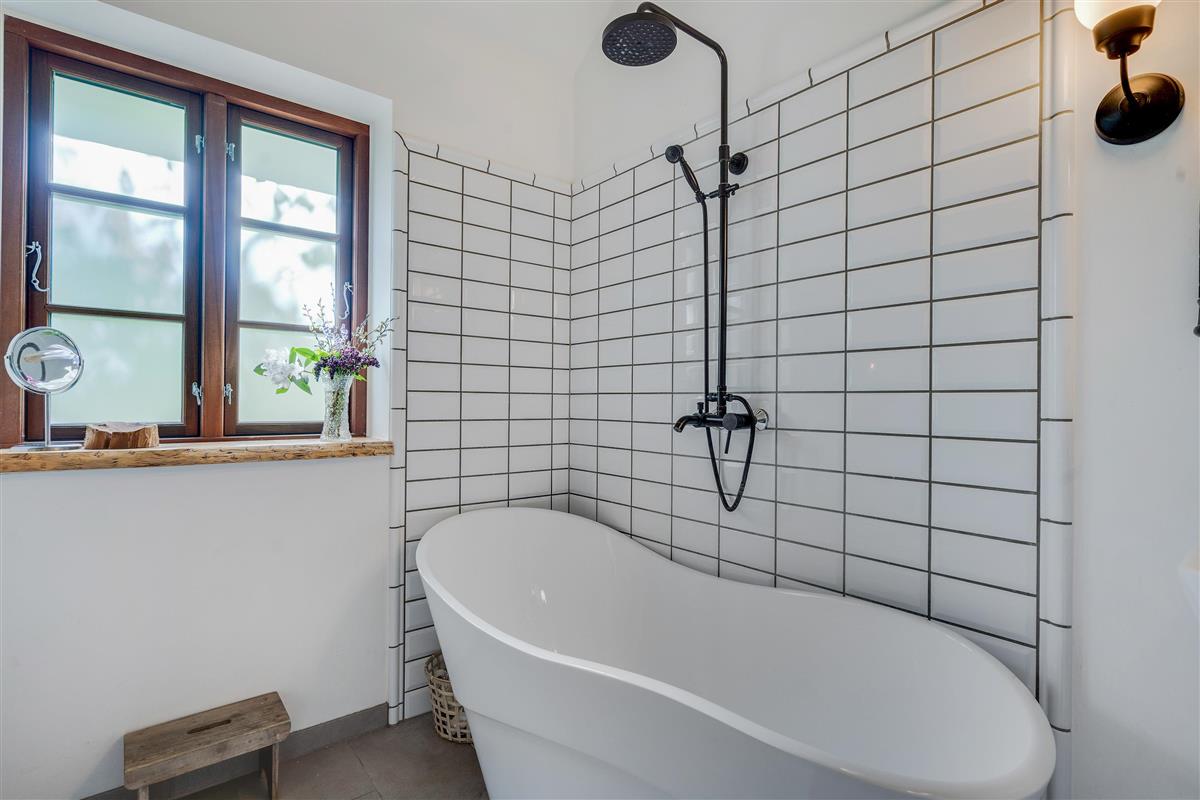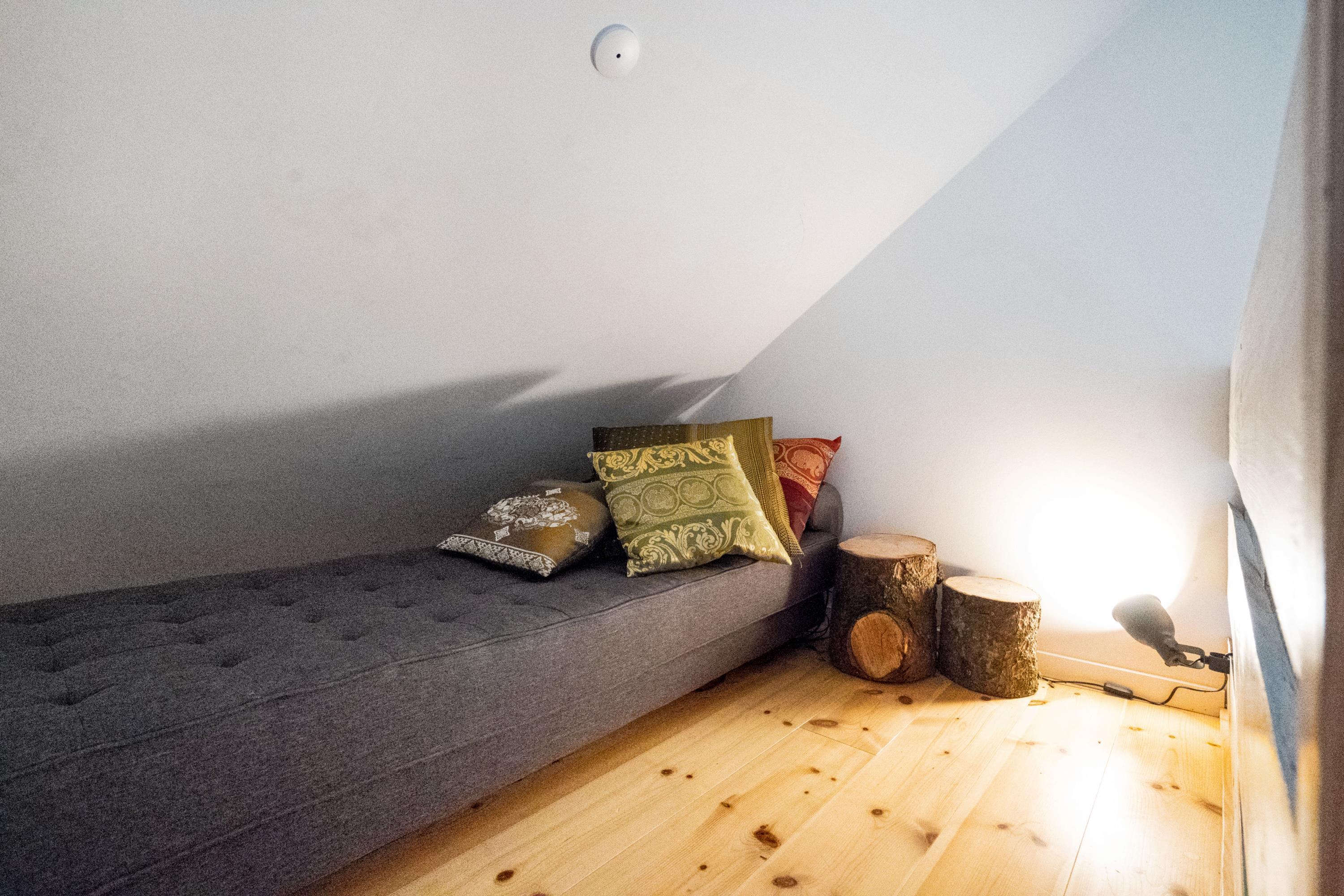 Cosy, open-plan living with wood-burning stove, bath and mezzanine