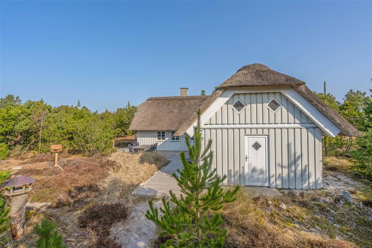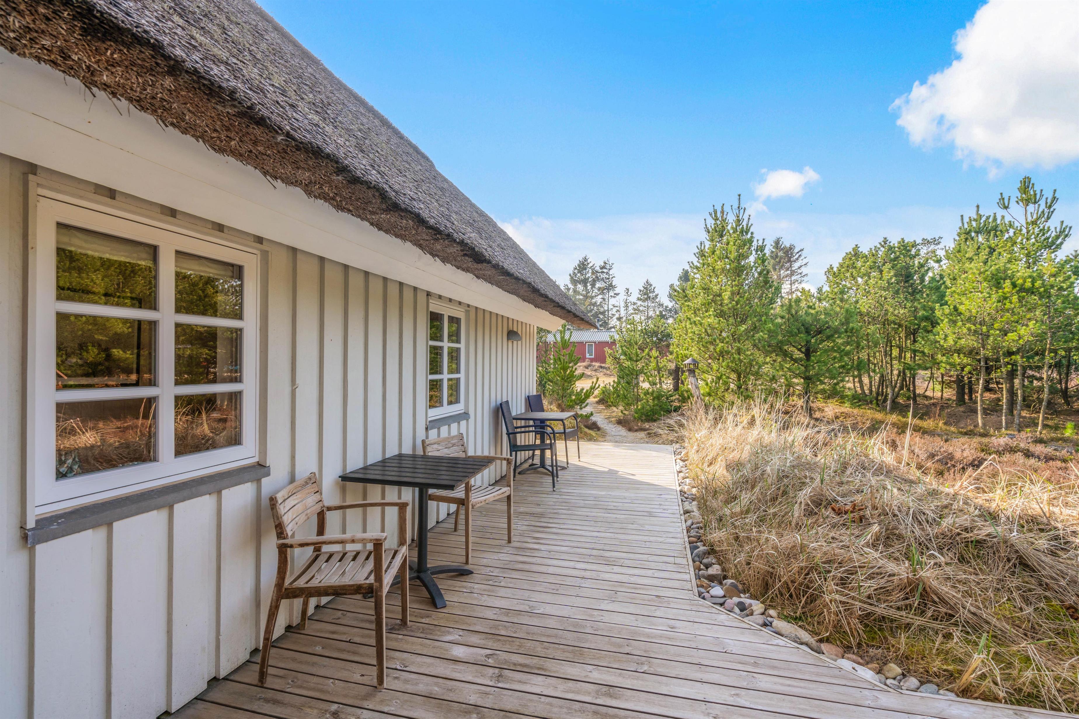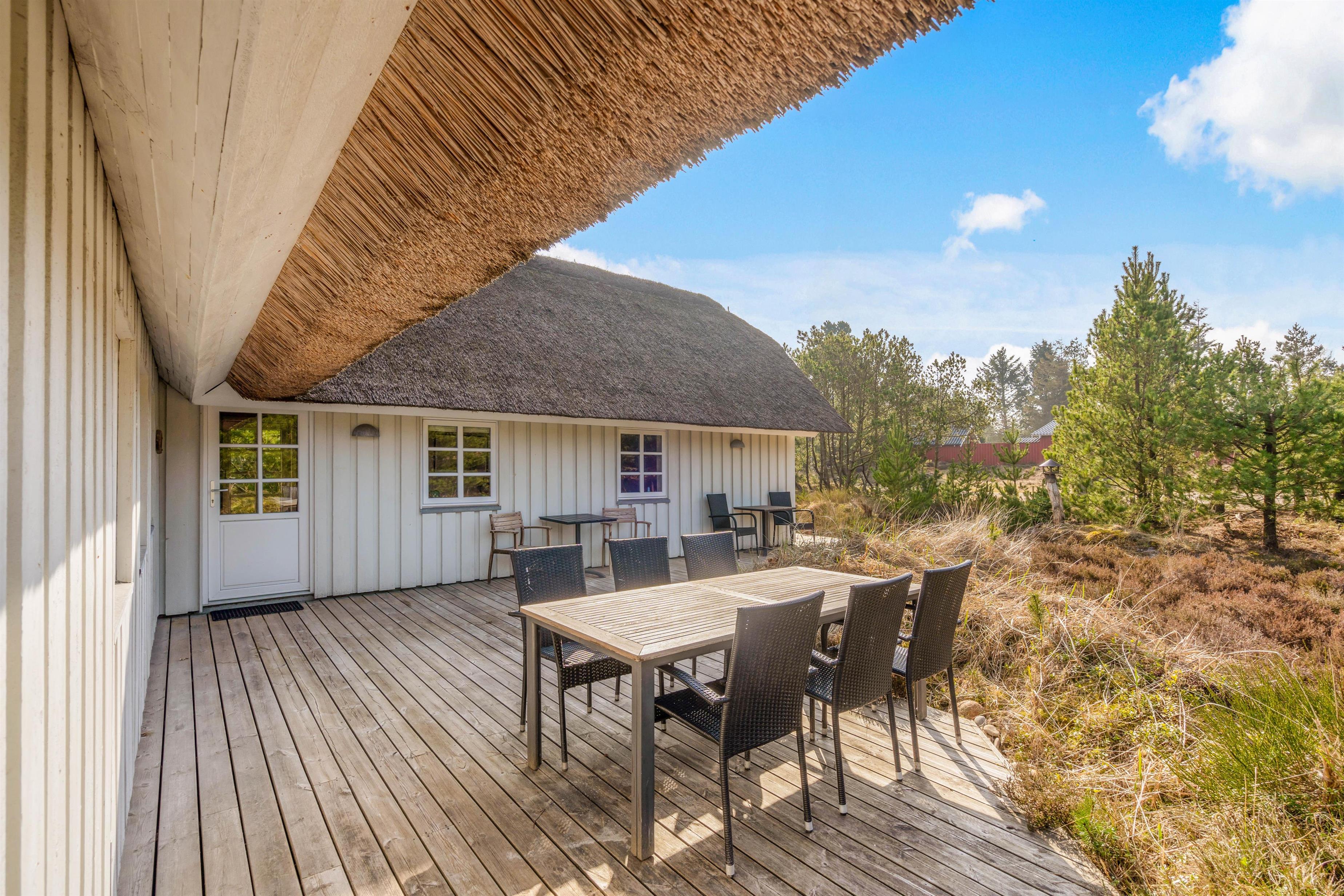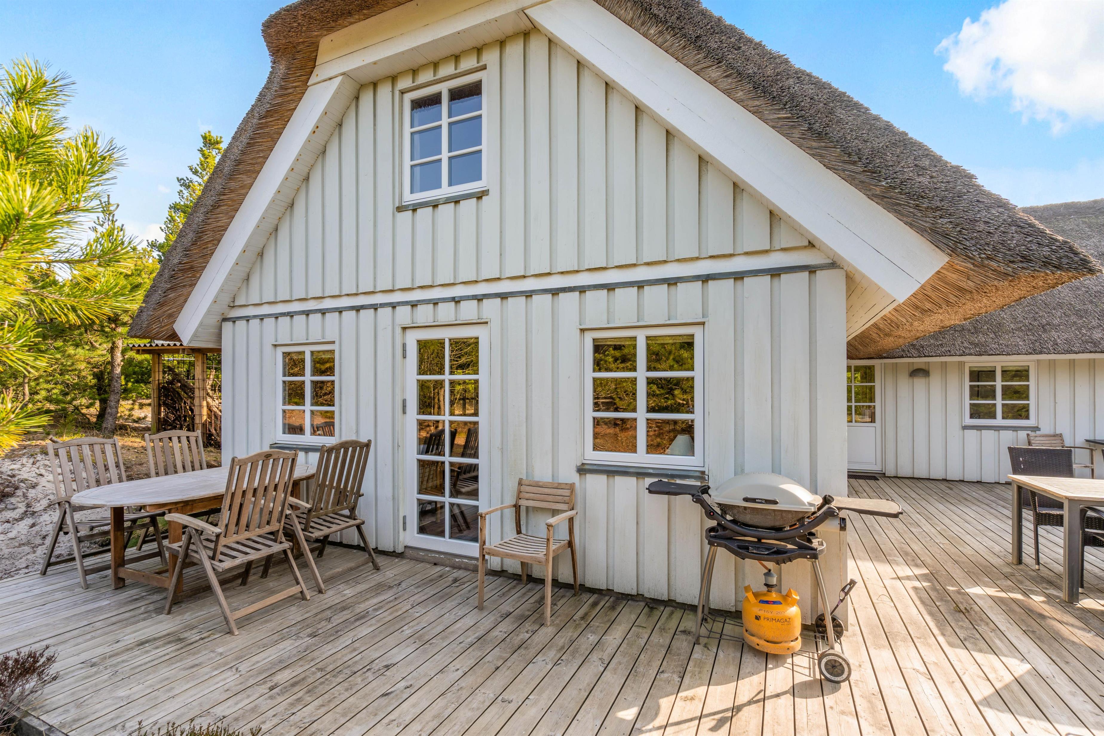 This charming thatched holiday home in Houstrup, located at Jeppesvej 21, offers 130 square metres of space for up to 8 people. Lovingly renovated in 2021, its furnishings create an elegant beach hotel atmosphere. The peaceful location, practically next to an extensive plantation, is ideal for relaxing walks and exploring the beautiful natural surroundings – a perfect base for your restful stay.