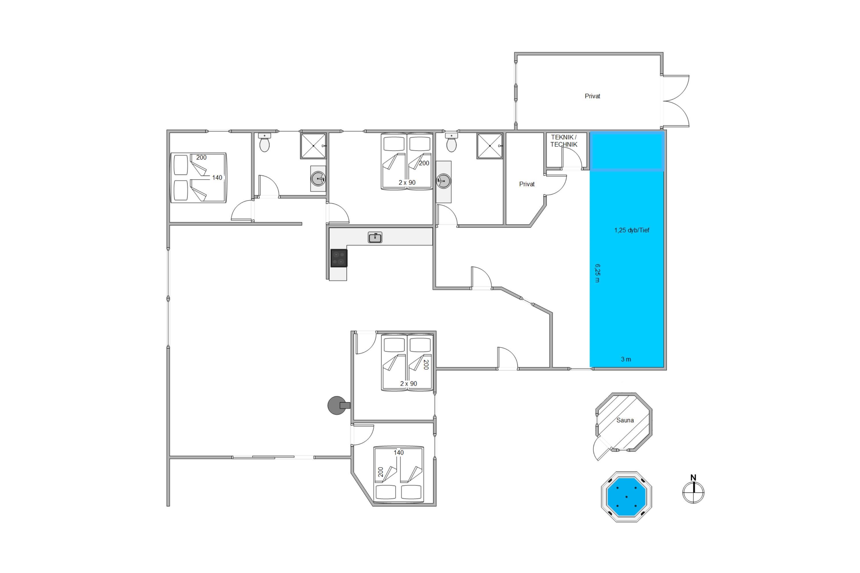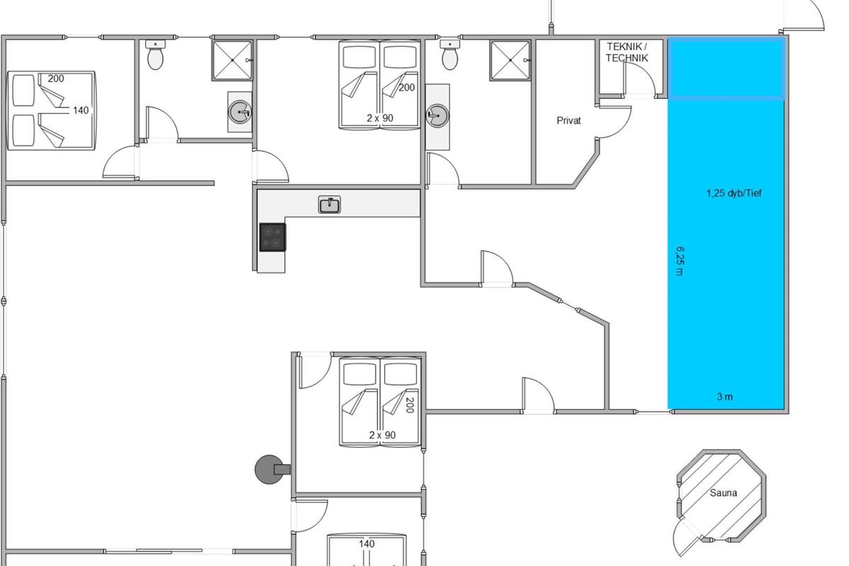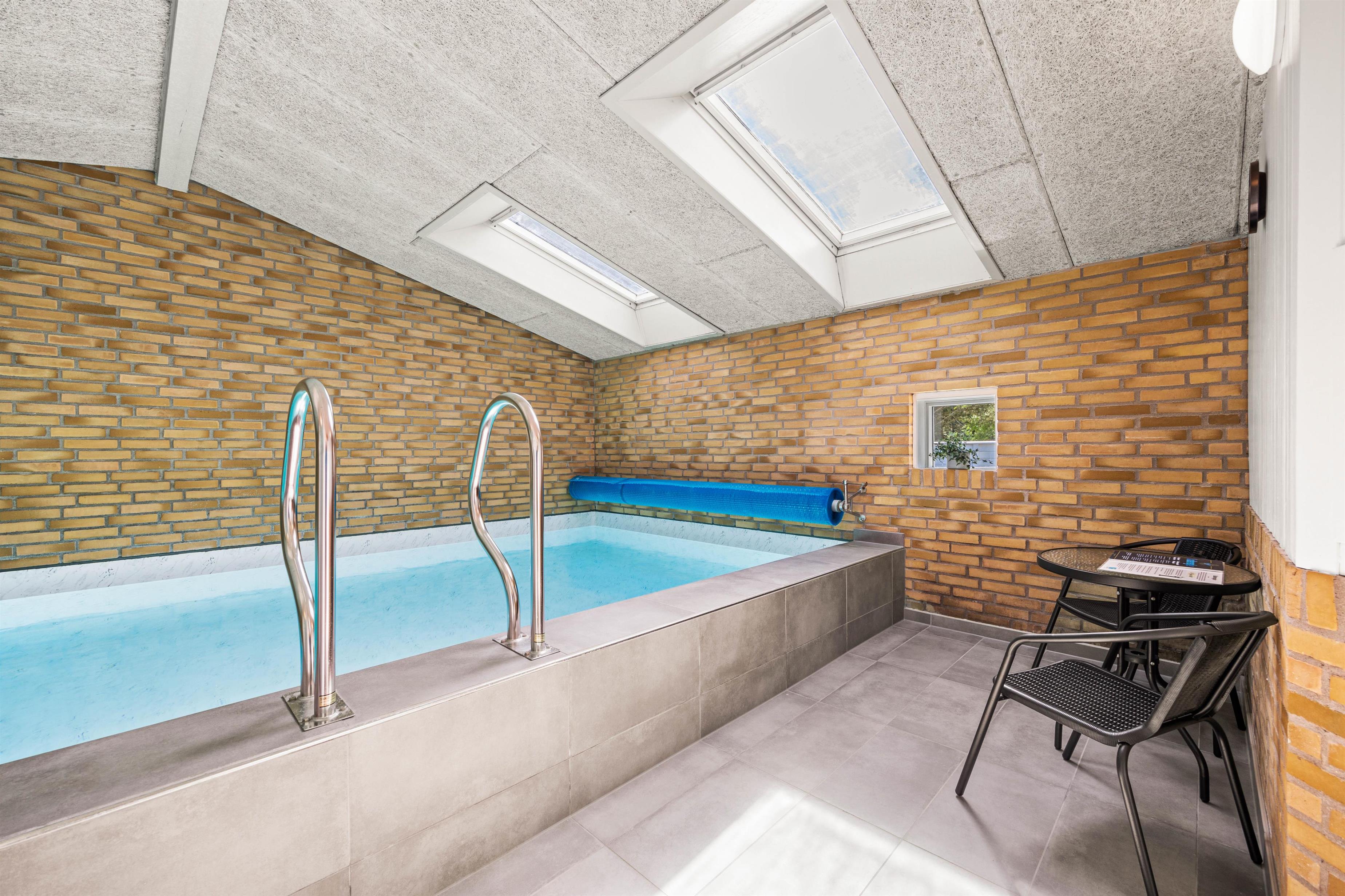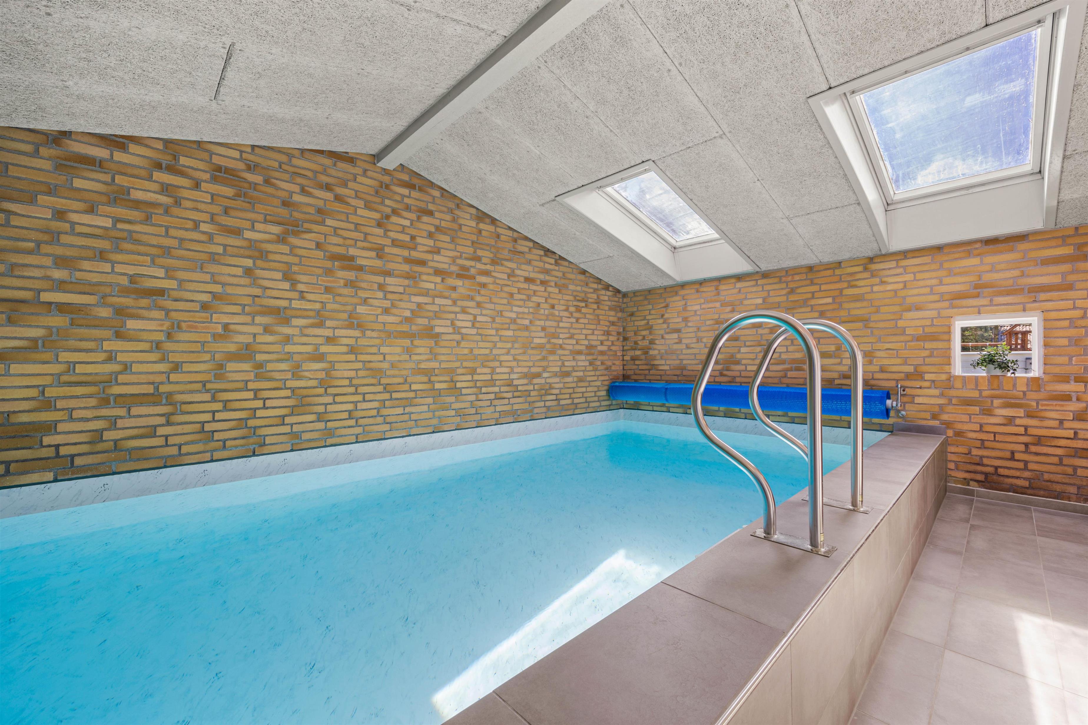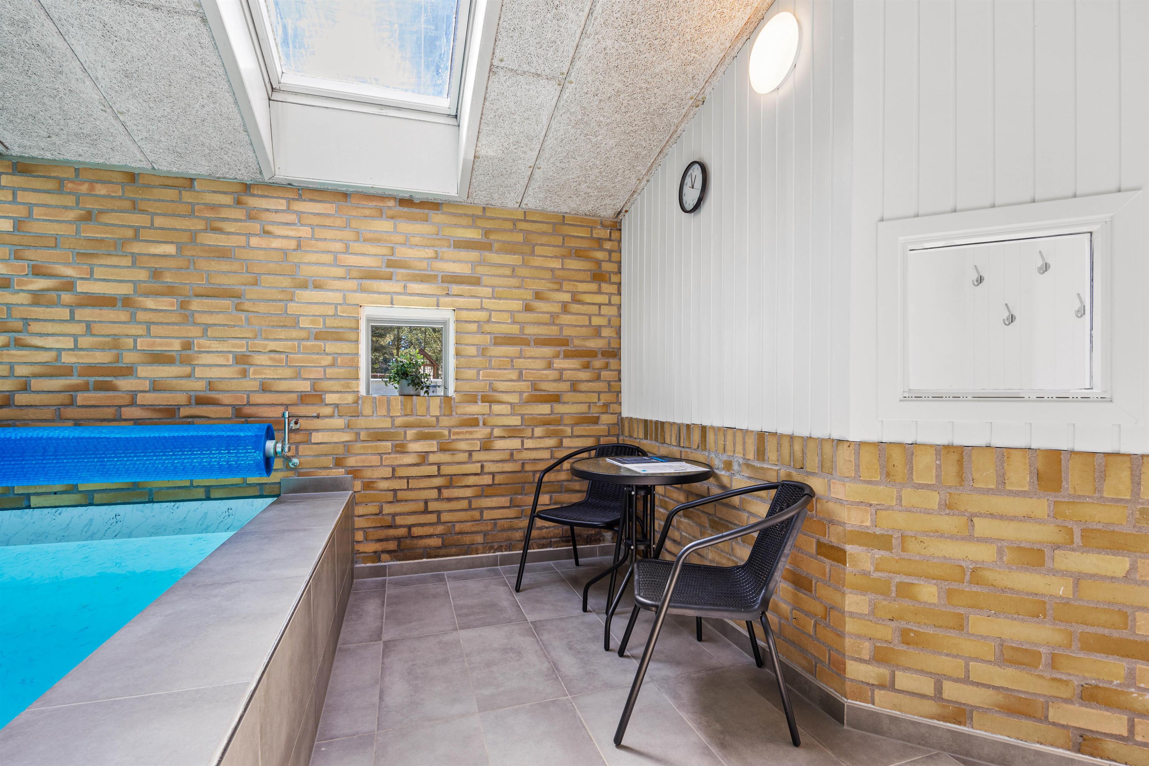 The pool room, featuring an approximately 21 square metre pool and a whirlpool, is located in the eastern part of the house and is separated from the living room and bedrooms by a hallway. This allows everyone to enjoy their holiday as they wish.