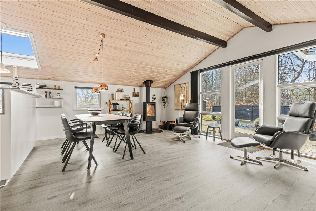 The living room features a central wood-burning stove, perfect for creating a warm and inviting atmosphere. Here you can unwind and spend your evenings in comfort. The kitchen comes equipped with a dishwasher to make cleaning up easier, allowing more time for relaxation, while the open-plan dining area creates a sociable space for enjoying time with family or friends.