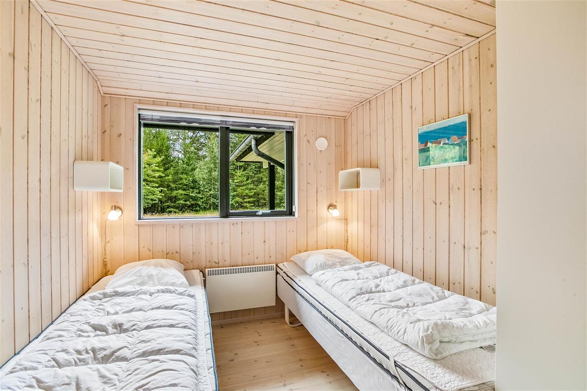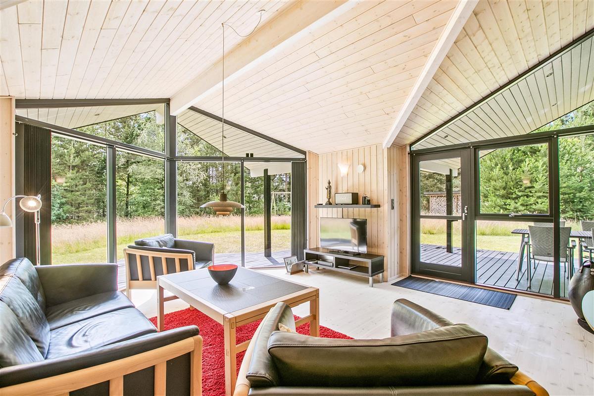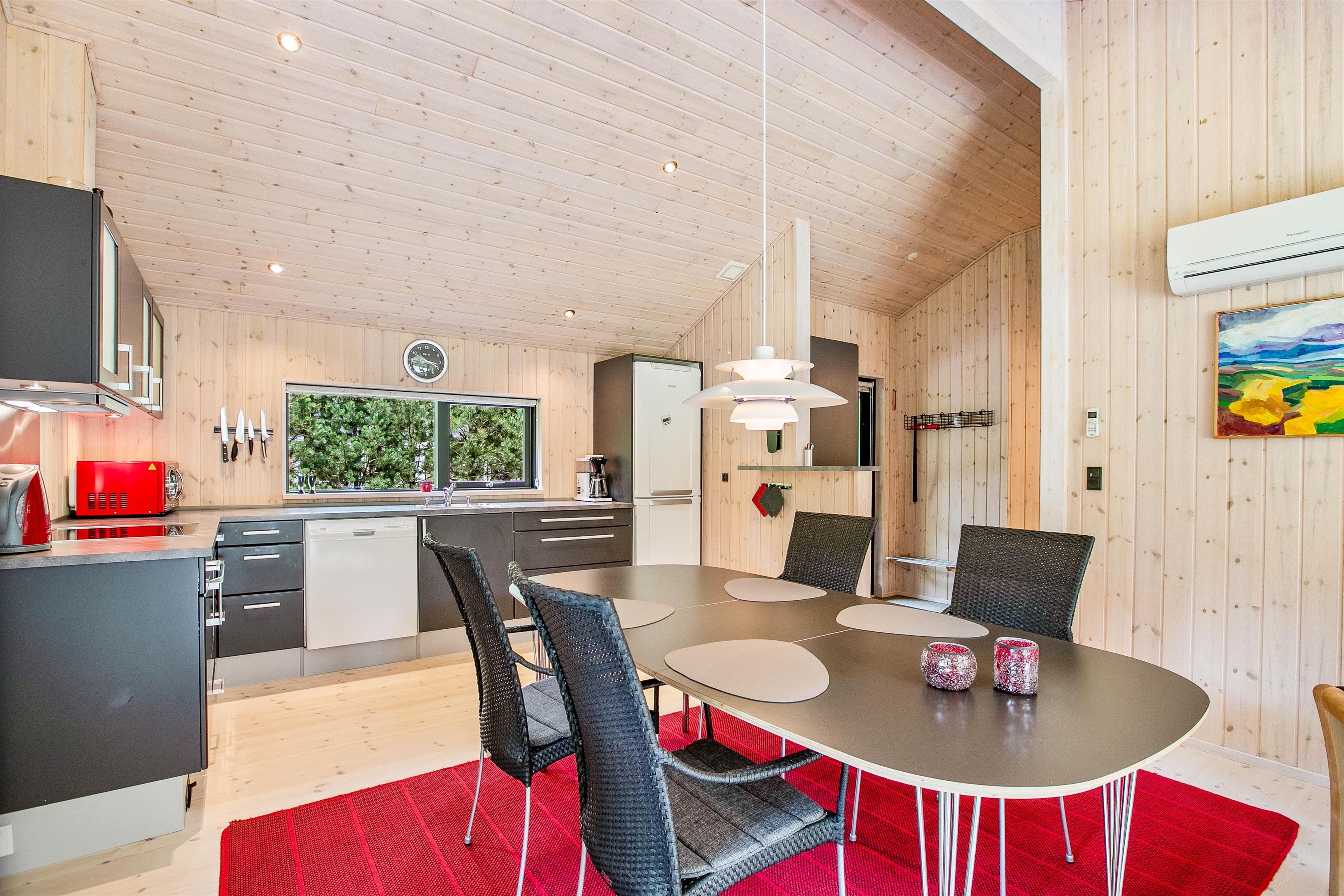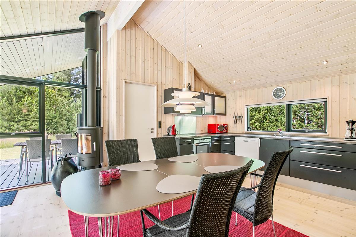 The living room is the heart of this holiday home at Sivvejen 22, featuring a cosy wood-burning stove that creates a homely atmosphere on cooler evenings. Here you can relax on comfortable seating, read books or enjoy films via Google Chromecast. Large windows flood the space with natural light and offer views of the green surroundings. The modern kitchen is well-equipped with everything you might need. A dishwasher makes cleaning up easier, leaving you more time to relax. The adjacent dining area provides space for shared meals with family or friends.