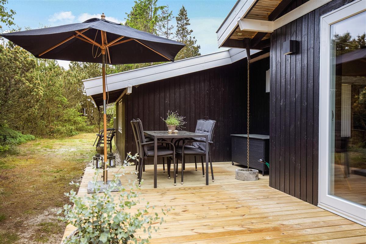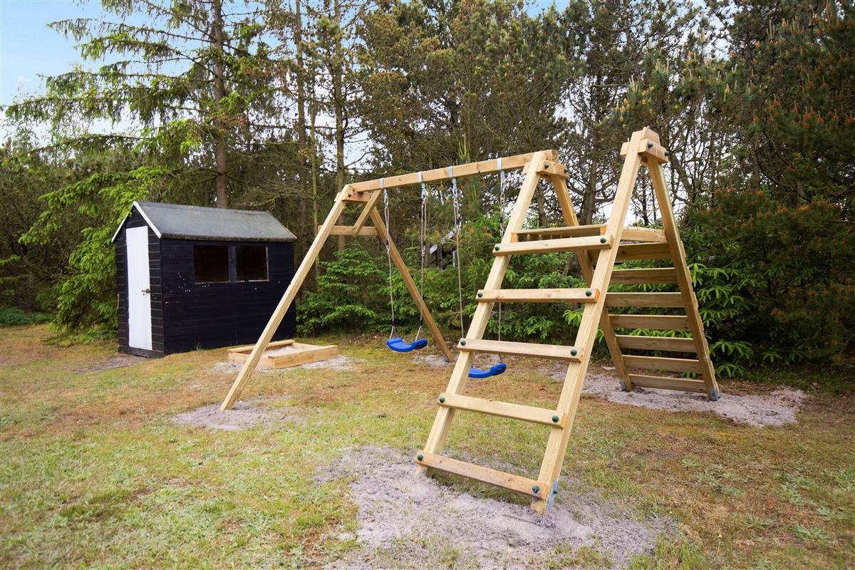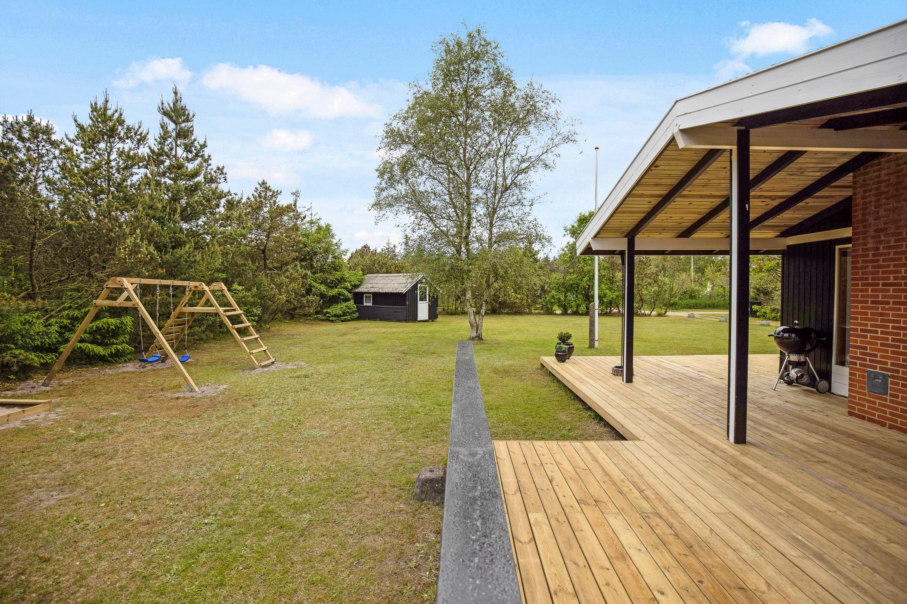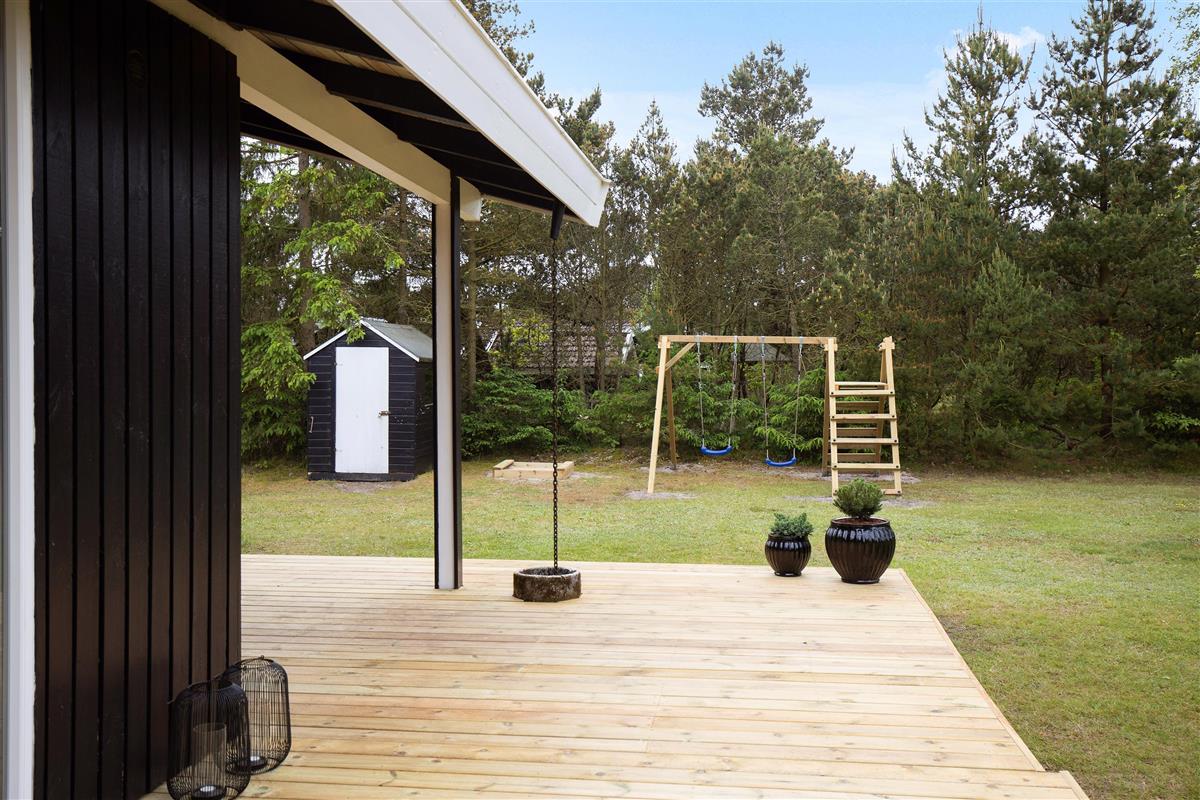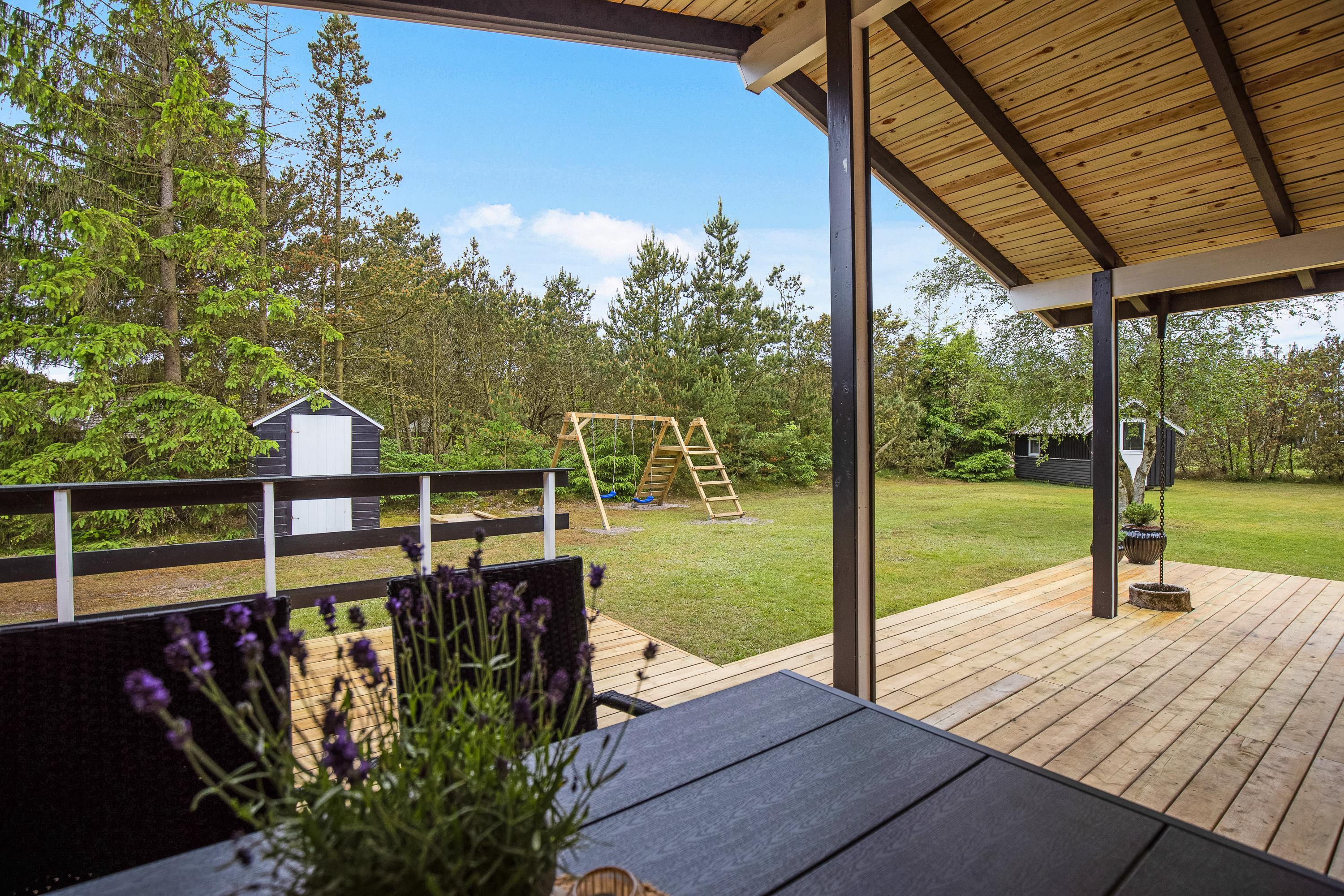 Both the bedroom and living room offer direct access to the large wooden terrace. The terrace extends along the entire south and west sides of the house, with partial covering. You can easily spend the whole day here - there's quality garden furniture, a barbecue and sun loungers. For those feeling energetic, children can enjoy the swings, discover their inner child in the playhouse, or perhaps have a kickabout on the natural lawn.