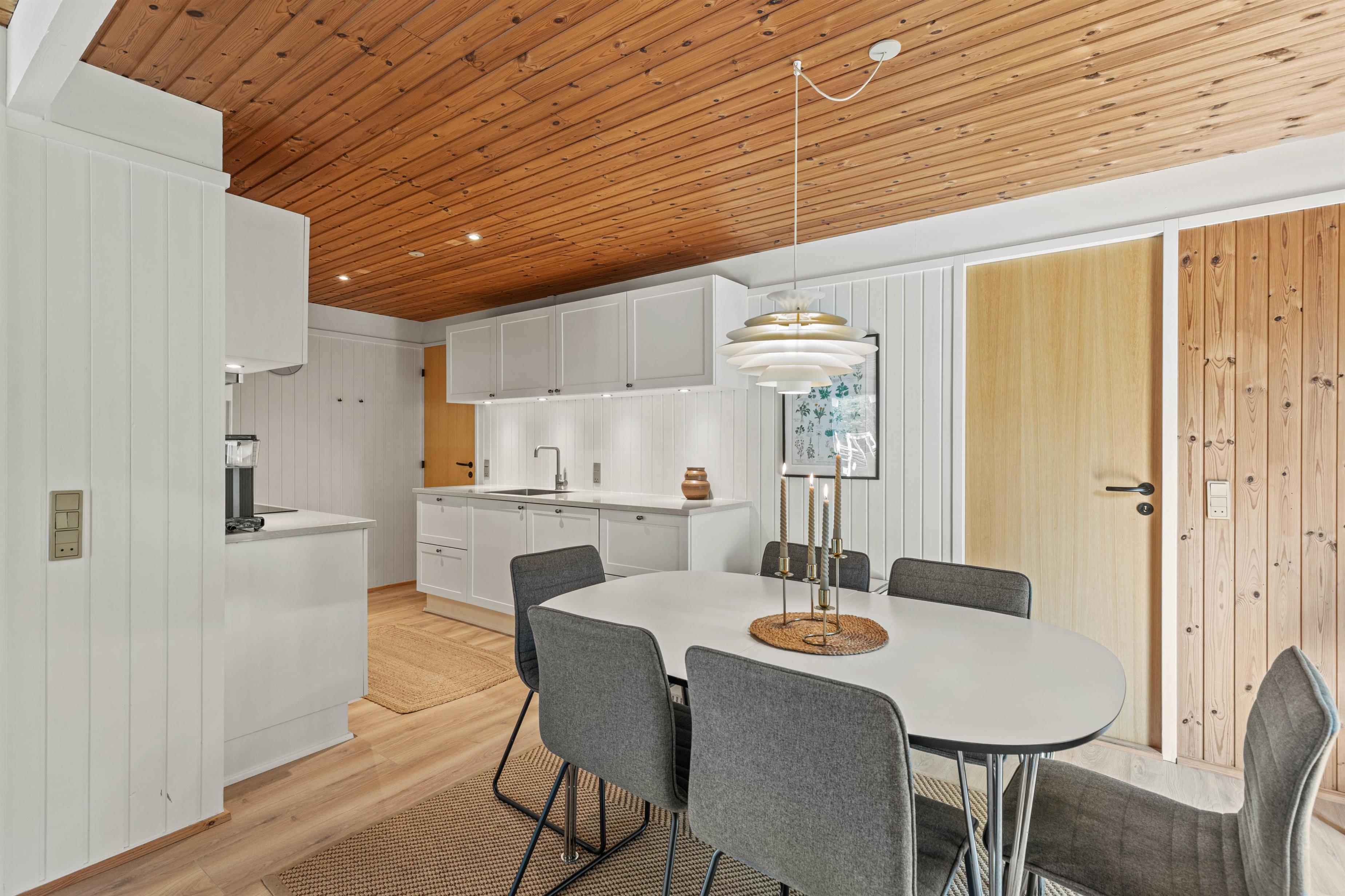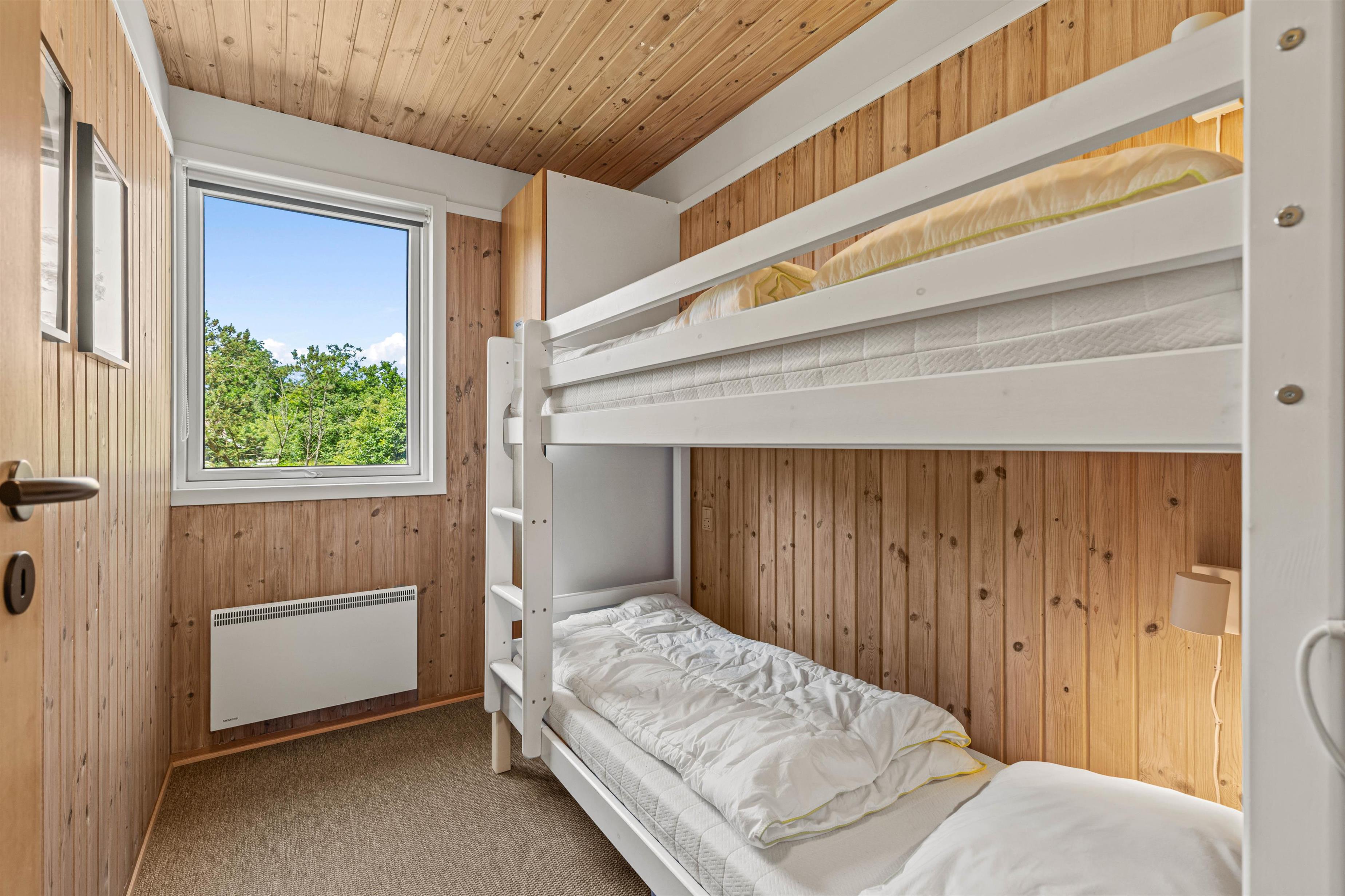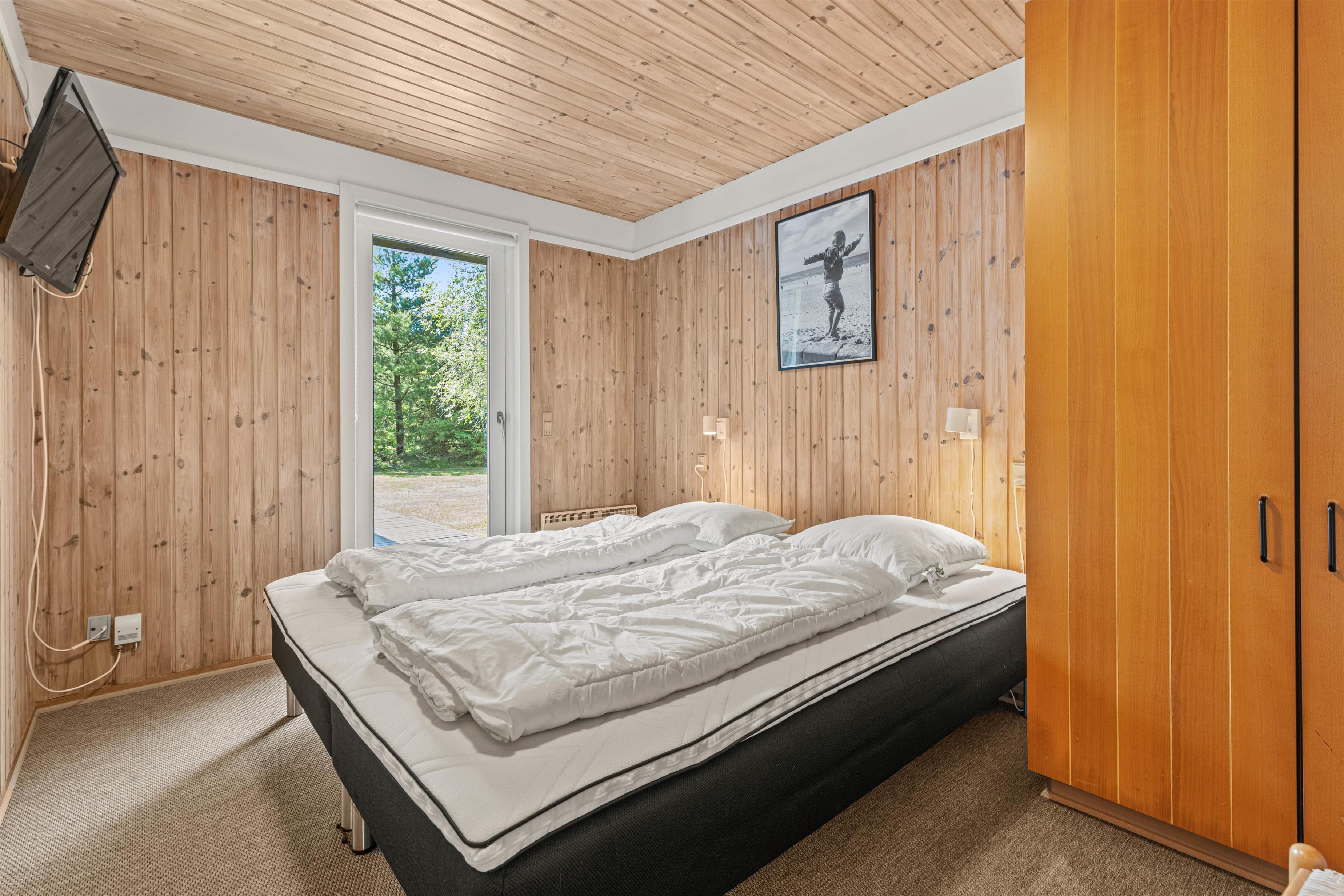 Welcome to a beautiful holiday home with authentic charm! The holiday home is cosily furnished with comfortable furniture, quality beds and delightful wood panelling on walls and ceilings. There's space for extended family or holidays with friends, with sleeping arrangements for 8 people across 4 bedrooms - one single room with bunk beds and three rooms with double beds. One double bedroom features its own terrace access and a large wall-mounted television.