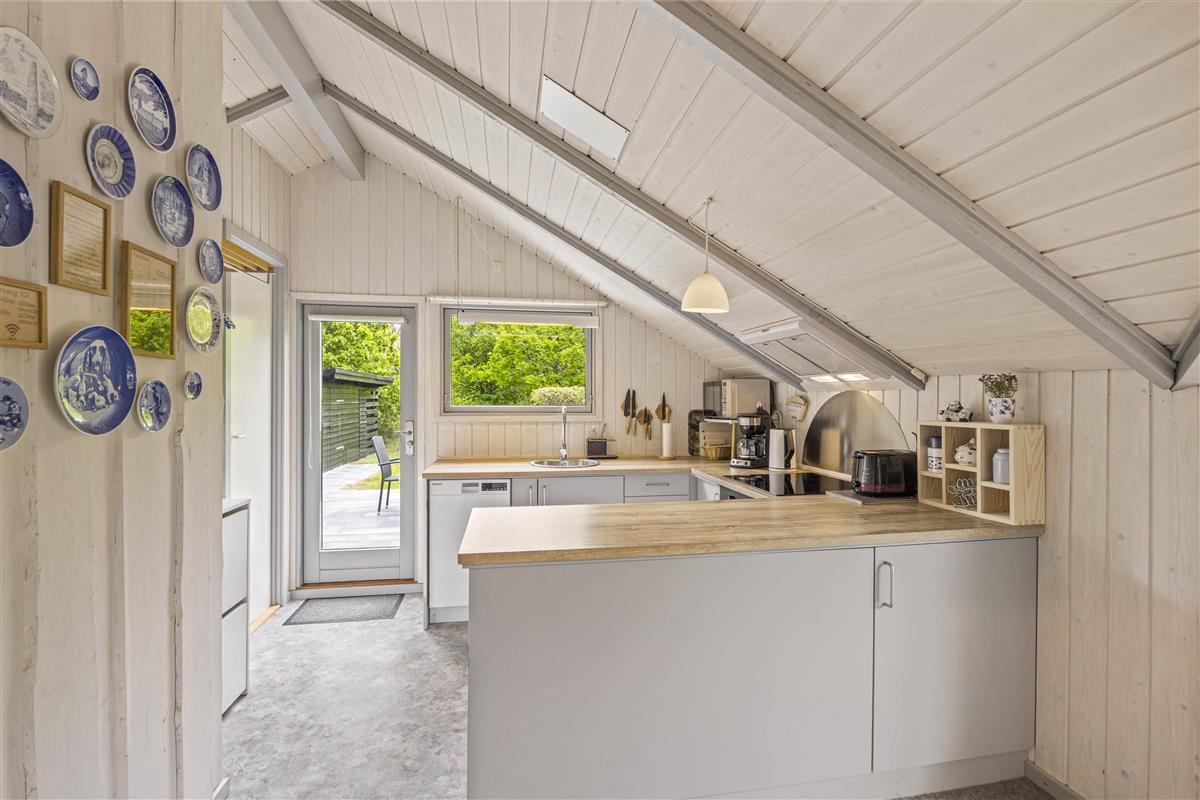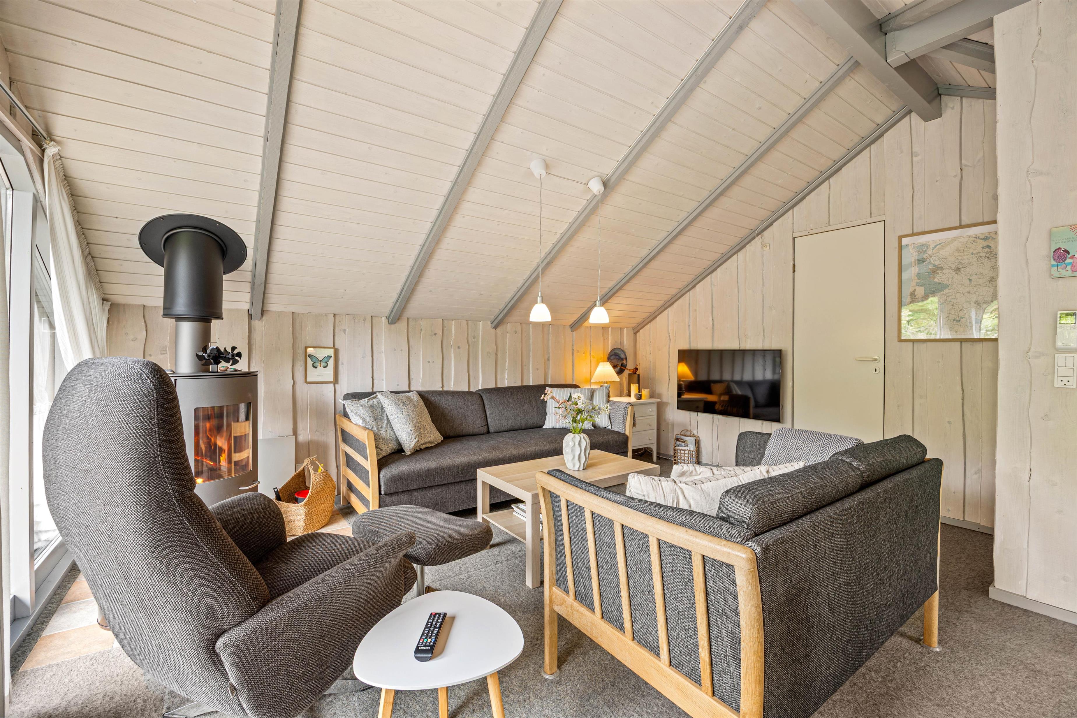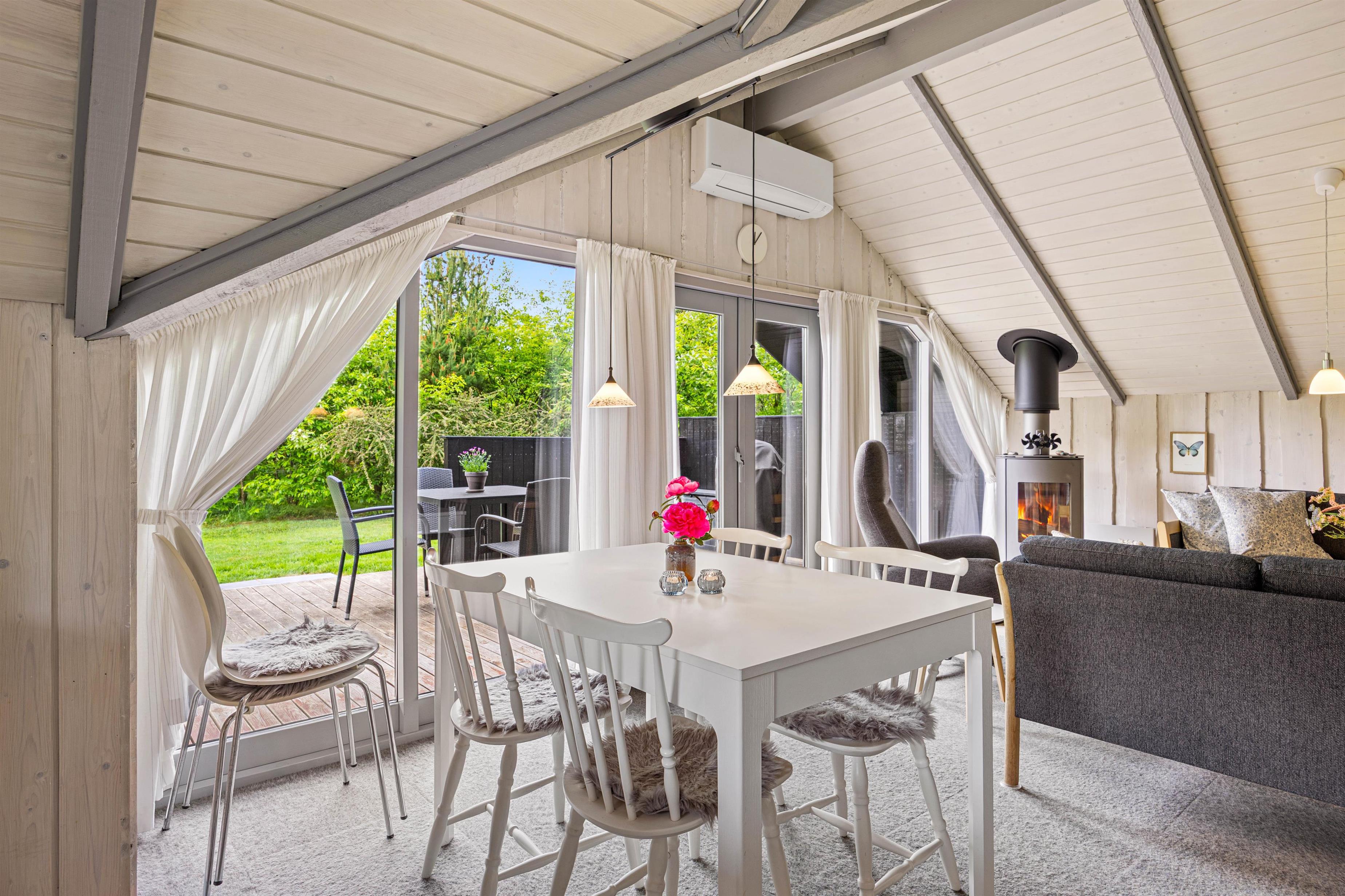 The interior of your holiday home in Houstrup wonderfully combines functionality with comfort. As you enter, you'll be welcomed by a light-filled living area that invites relaxation. The wood-burning stove forms the heart of the room, creating a particularly cosy atmosphere during the cooler months.