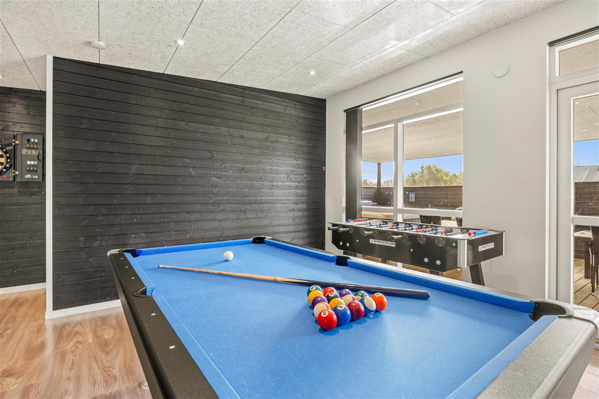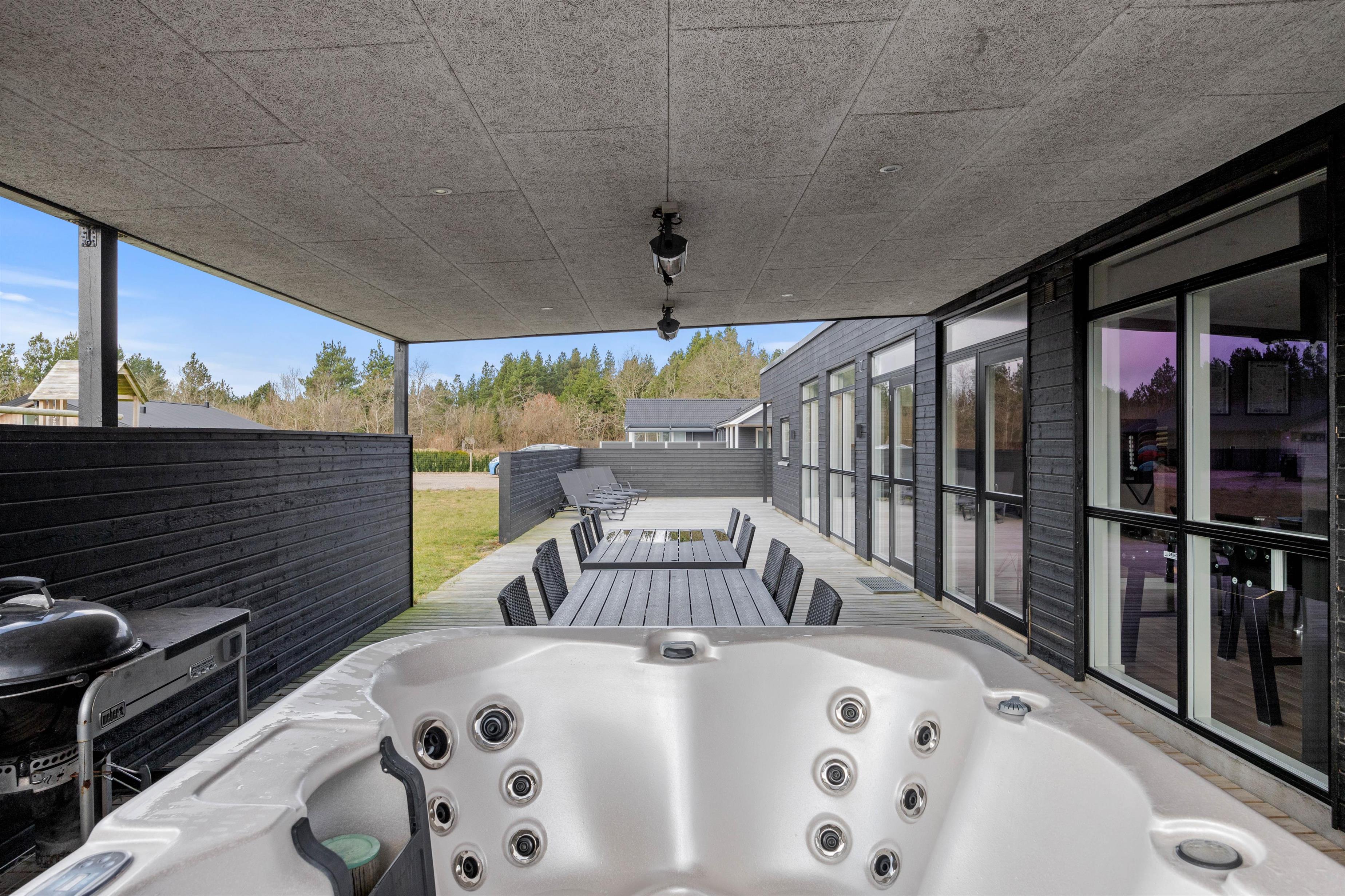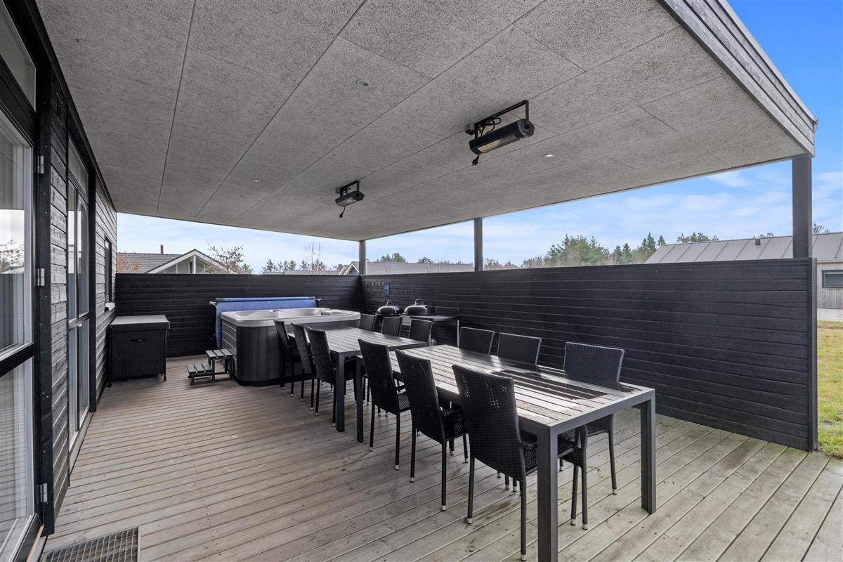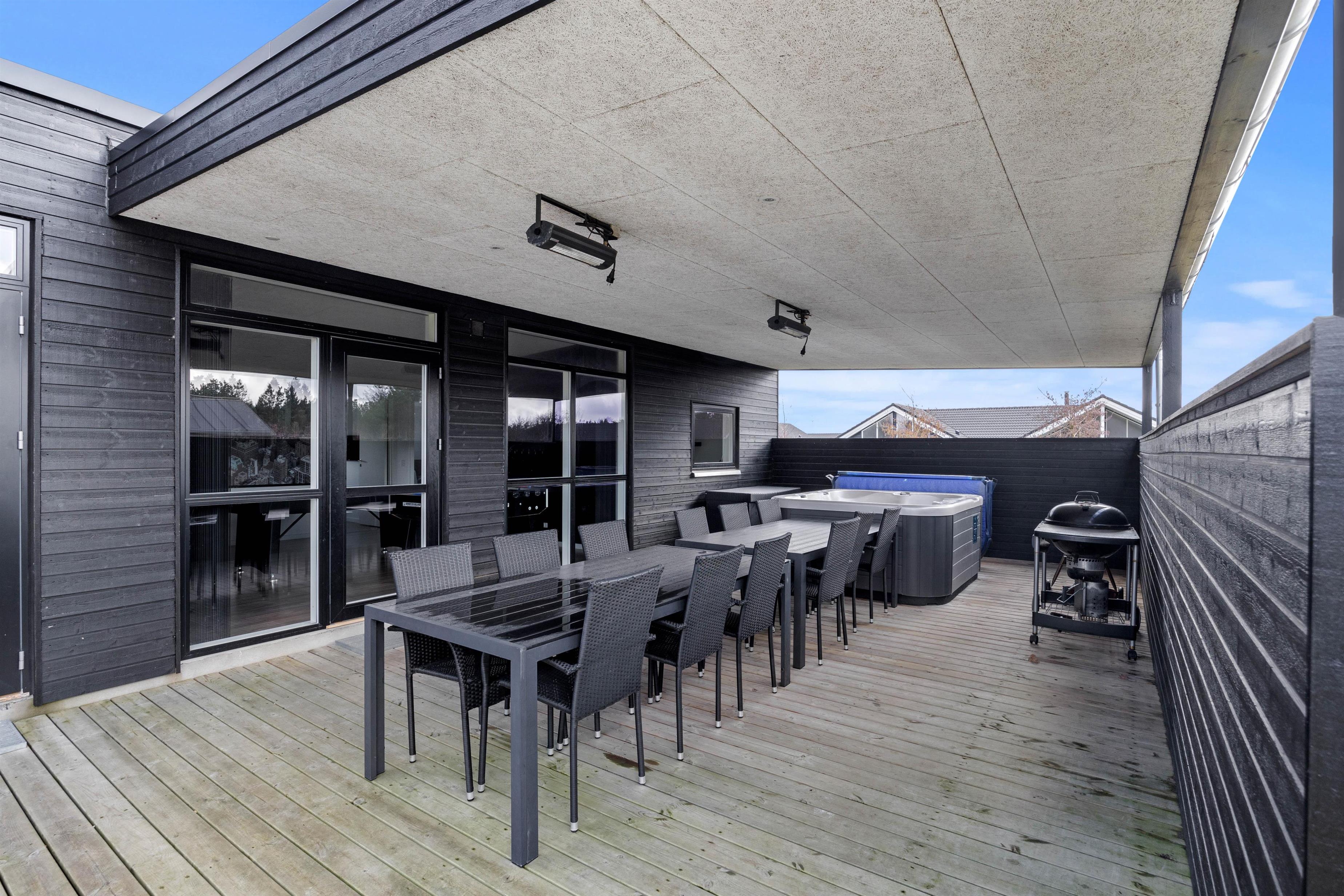The five bedrooms with double beds provide personal space for all guests. Two modern bathrooms with underfloor heating offer the perfect start to your day, and the private sauna invites relaxation after an eventful day. A special highlight of this Houstrup holiday home is its wellness area, featuring both an bathtub and an outdoor hot tub on the covered terrace, perfect for a relaxing soak under the open sky.
