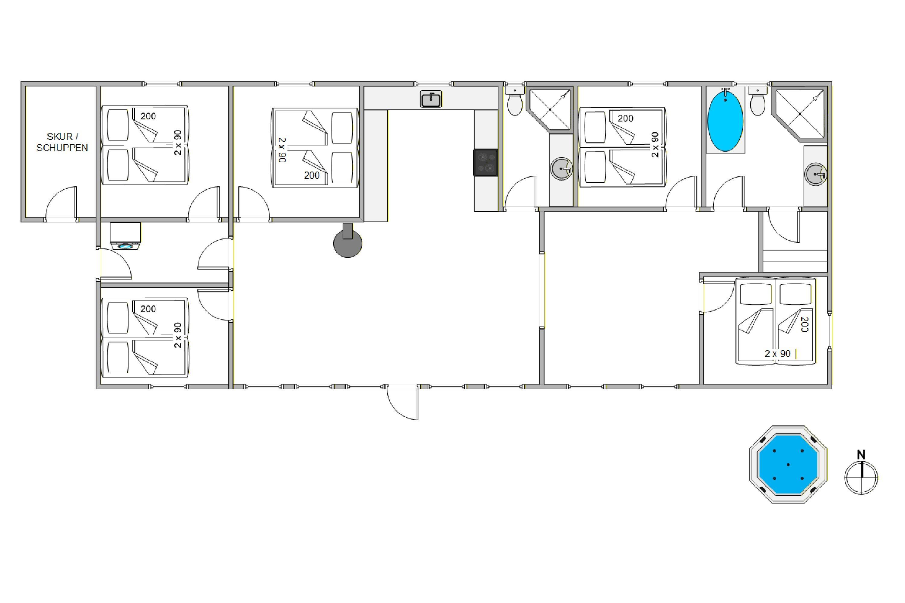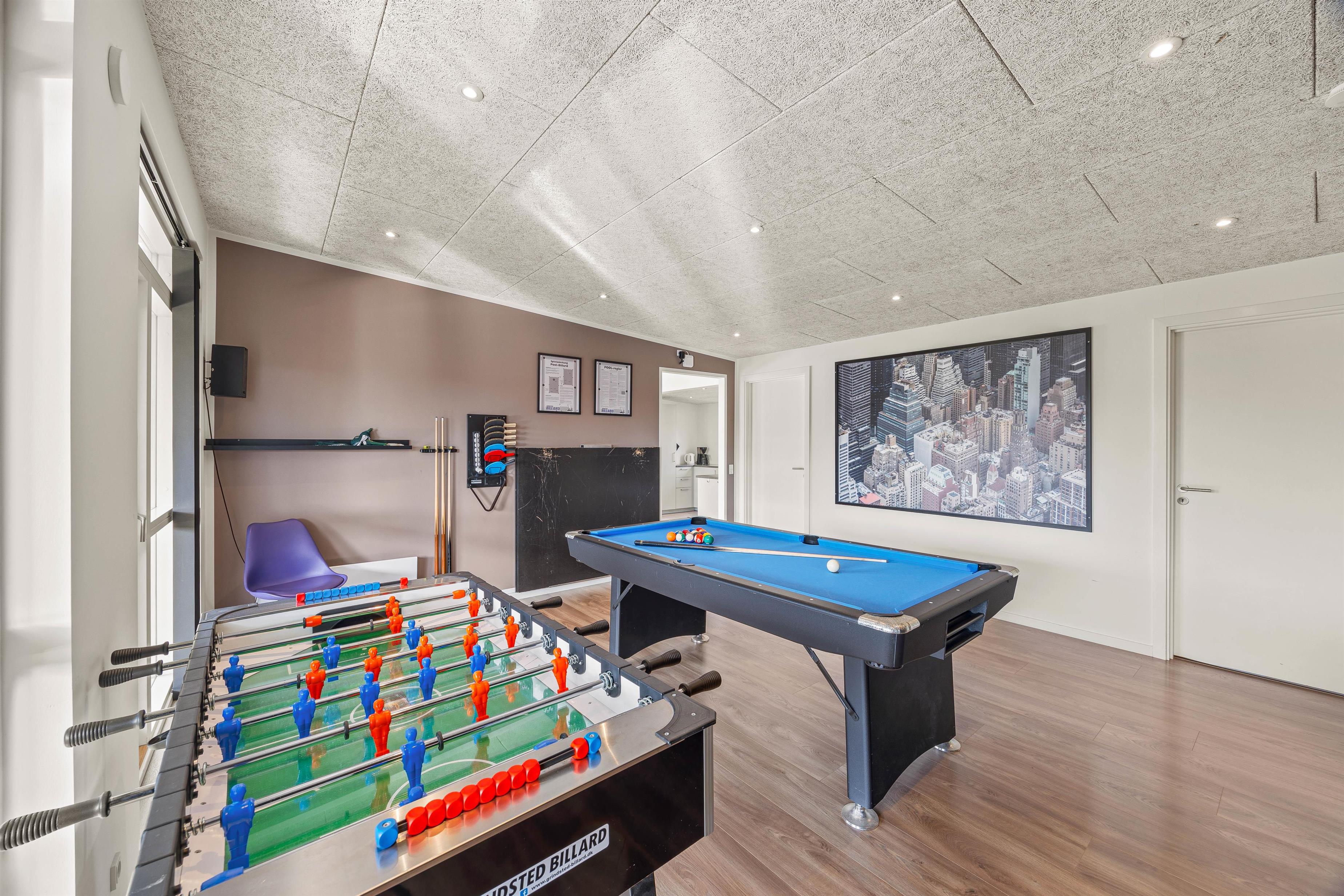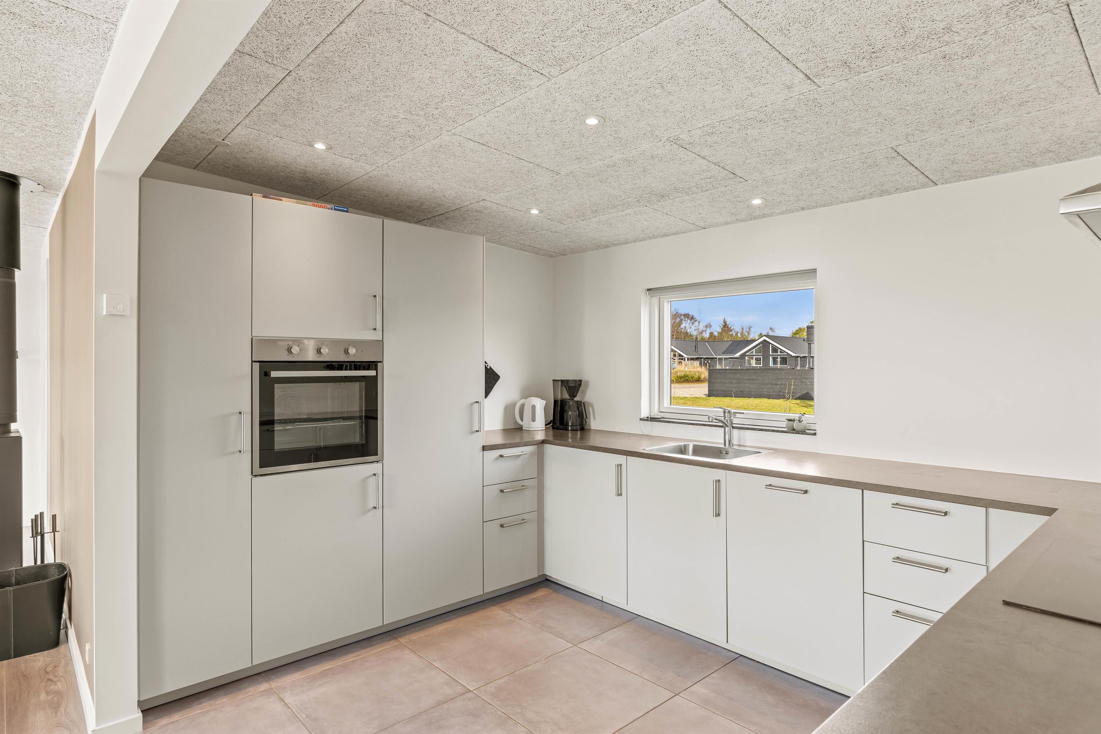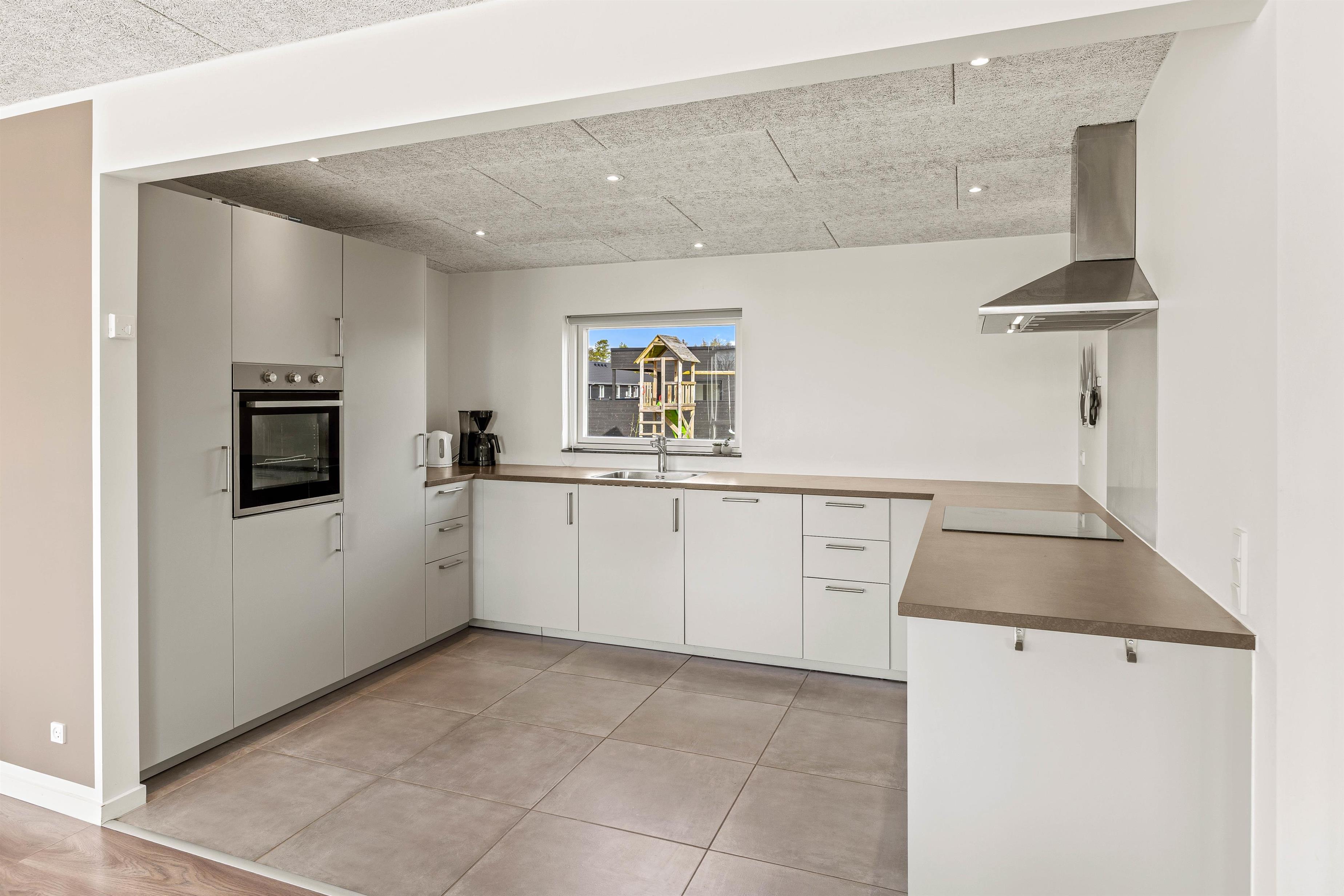The five bedrooms with double beds provide personal space for all guests. Two modern bathrooms with underfloor heating offer the perfect start to your day, and the private sauna invites relaxation after an eventful day. A special highlight of this Houstrup holiday home is its wellness area, featuring both an bathtub and an outdoor hot tub on the covered terrace, perfect for a relaxing soak under the open sky.