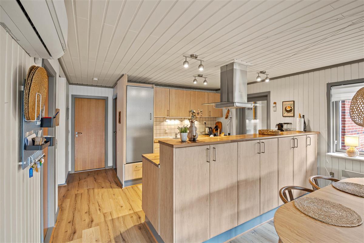 Der praktische Eingangsbereich des Ferienhauses heißt euch willkommen und bietet ausreichend Platz für eure Jacken und Schuhe. Der angrenzende Wohnbereich ist im typisch skandinavischen Stil eingerichtet und zeichnet sich durch seine gemütlichen Sitzmöbel aus, die zum Verweilen vor dem Kaminofen einladen. Viele kleine Dekorationselemente erwecken das Ferienhaus zum Leben und verleihen ihm eine einladende Atmosphäre.