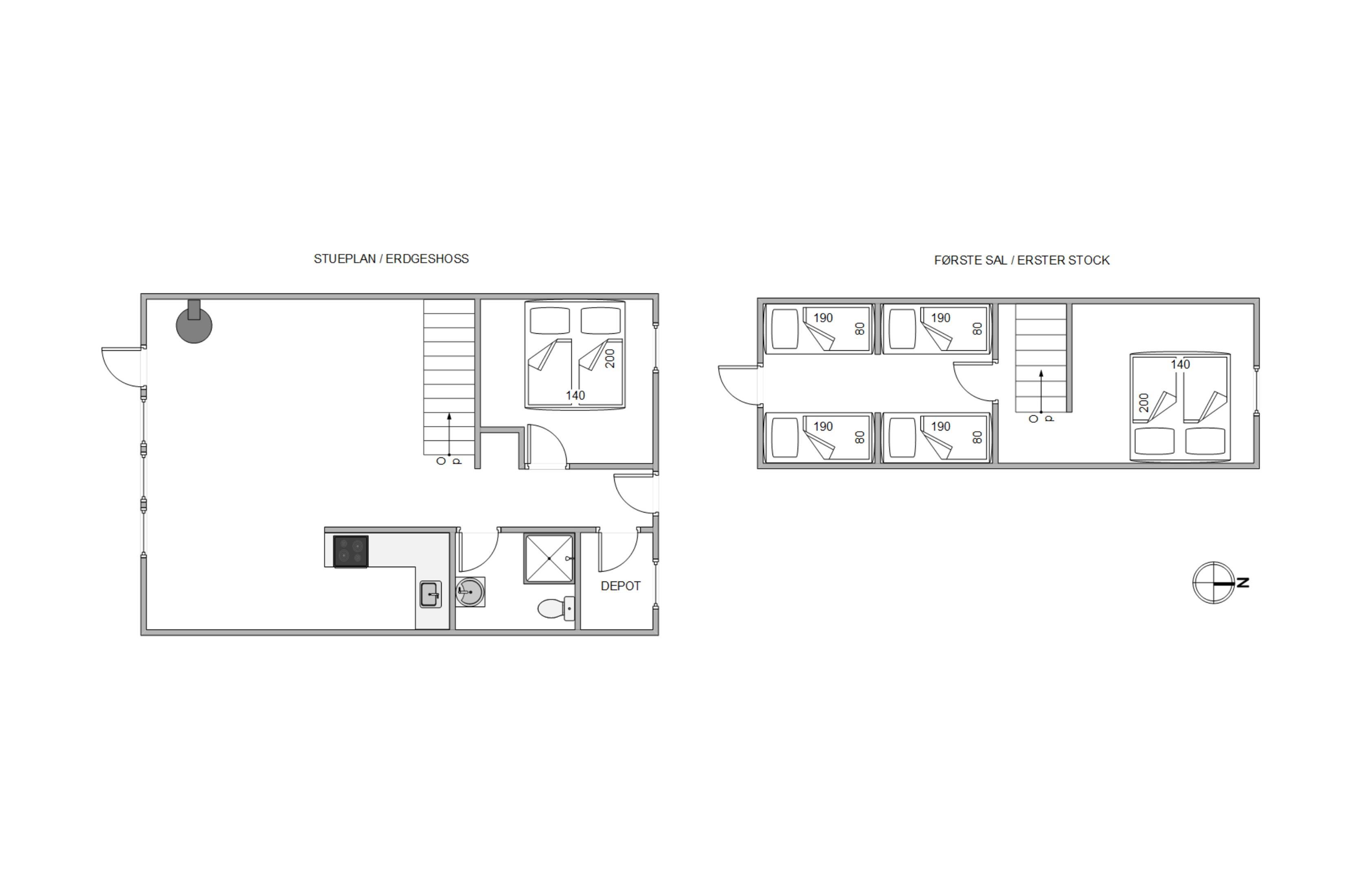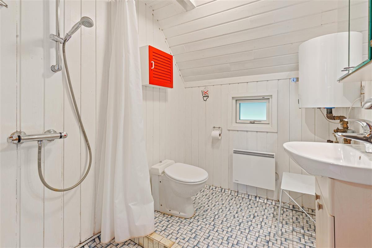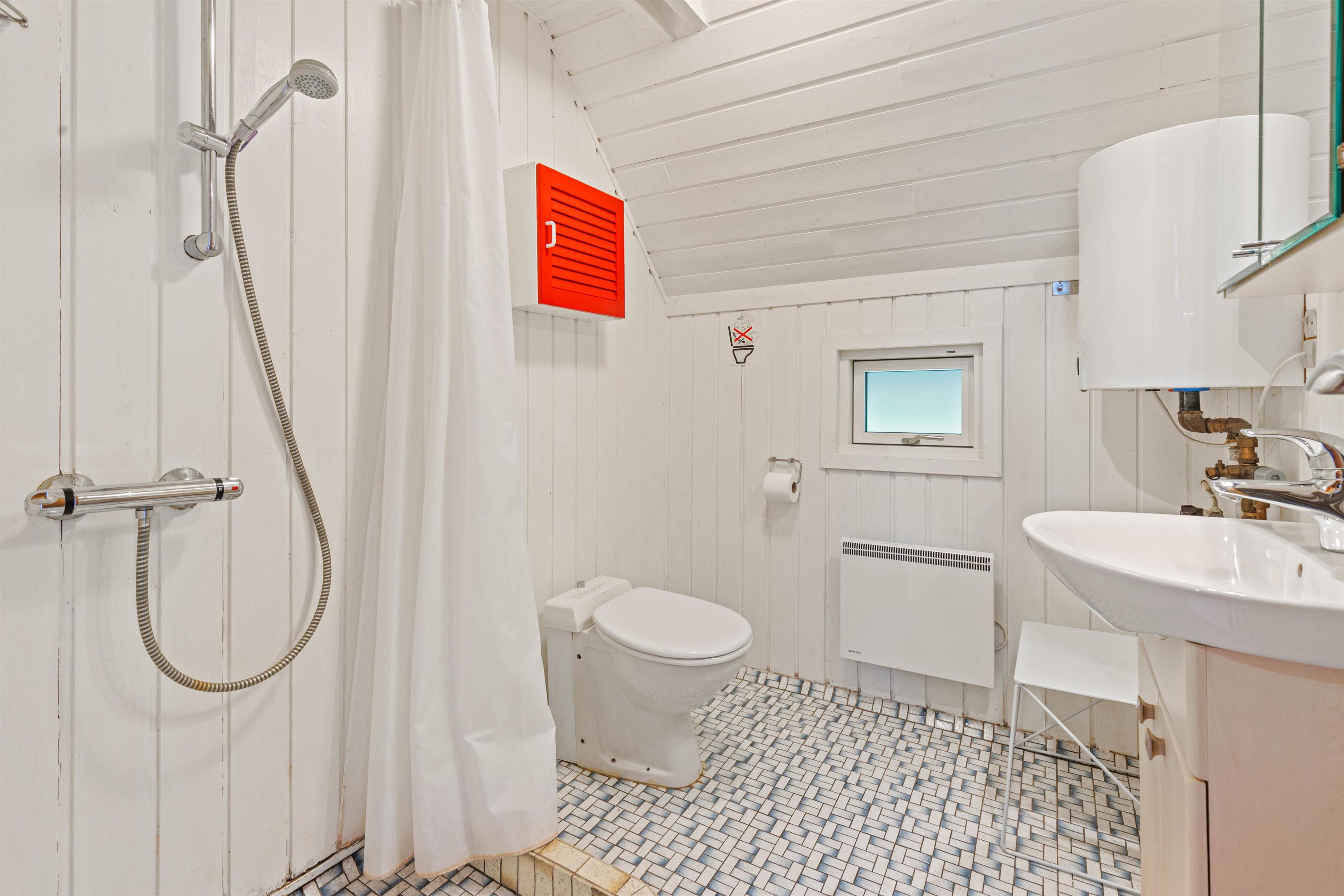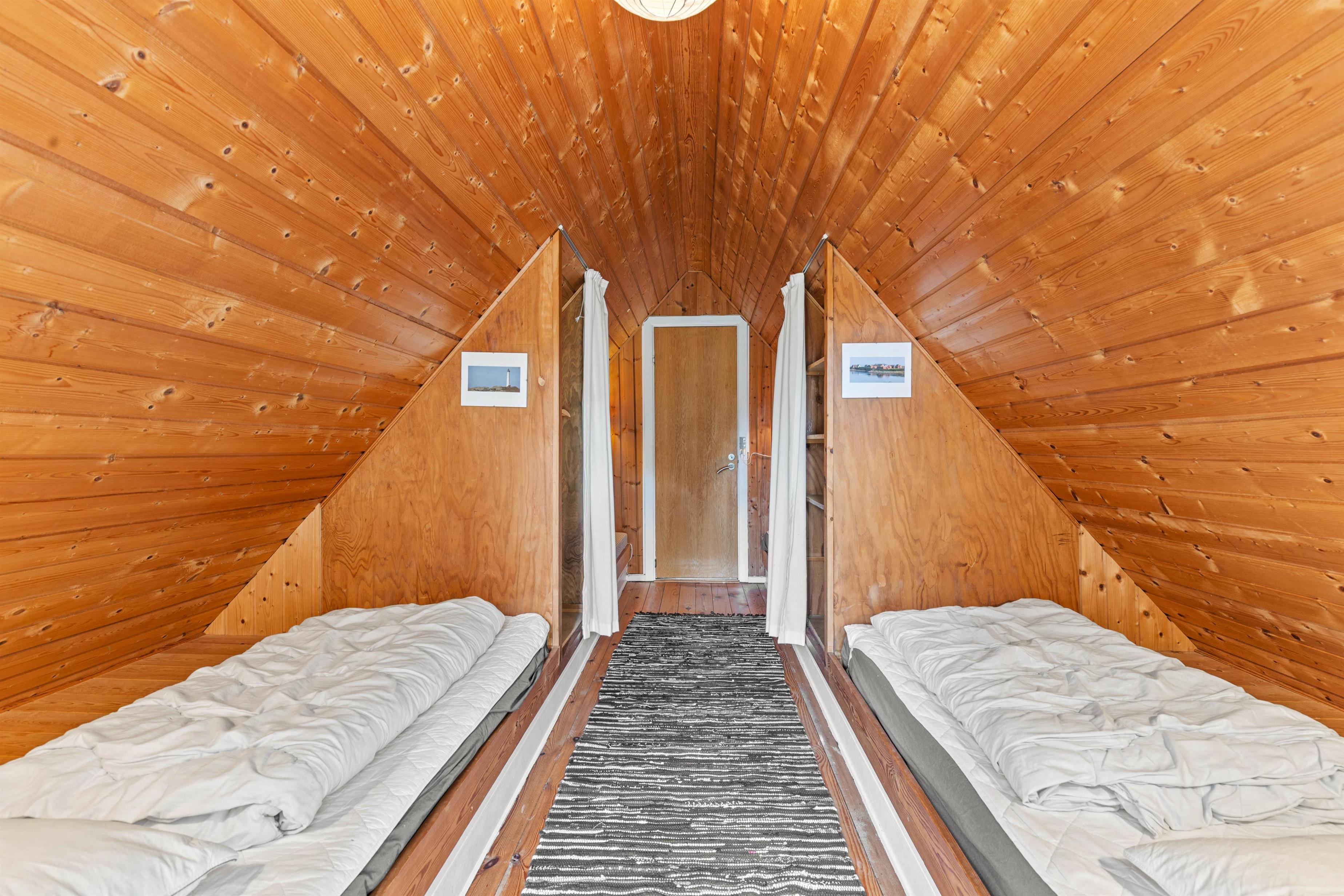 The house sleeps up to 6 people. There are 3 bedrooms: one downstairs with a double bed and two upstairs with sloping walls. One features a double bed, while the other has twin beds and access to a small balcony. The bright bathroom is practically equipped for holiday living with WC, shower cubicle and small storage cabinet.