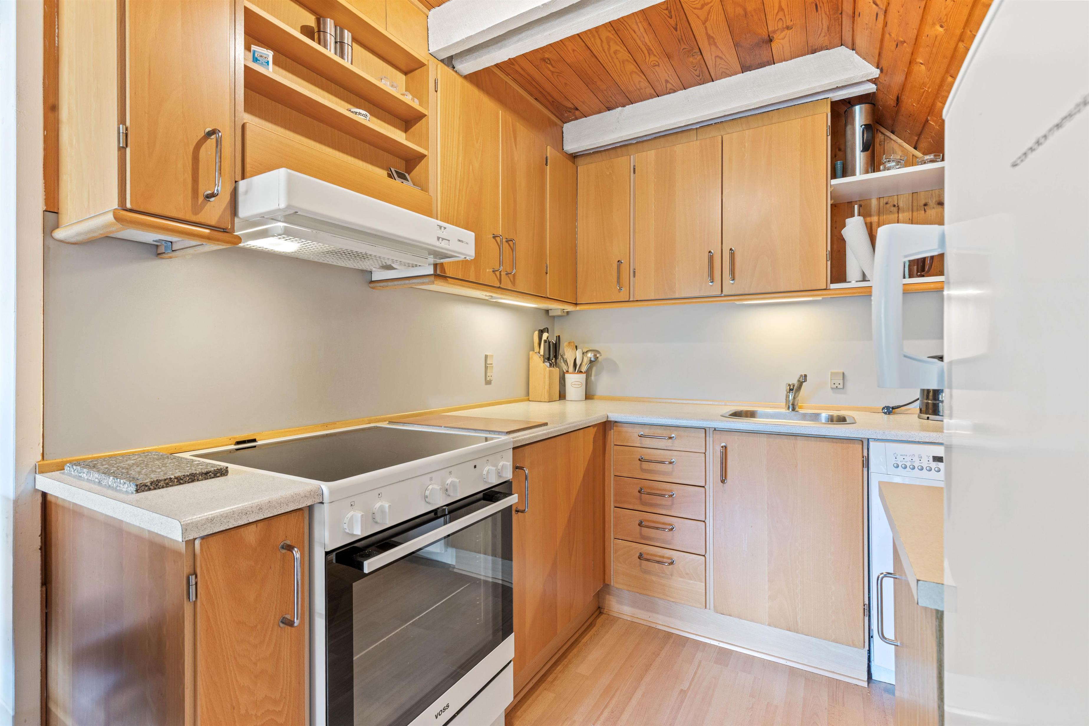 The open-plan living area combines kitchen, dining space and living room. Everything is very inviting and welcoming. The stylish sofa group in front of the TV and fireplace is perfect for cosy evenings. Here you can read a good book while listening to music or enjoy a warm cocoa watching an exciting film on the flat-screen TV. The exposed roof beams, which contrast beautifully with the light wood, give the living space a particularly special charm.