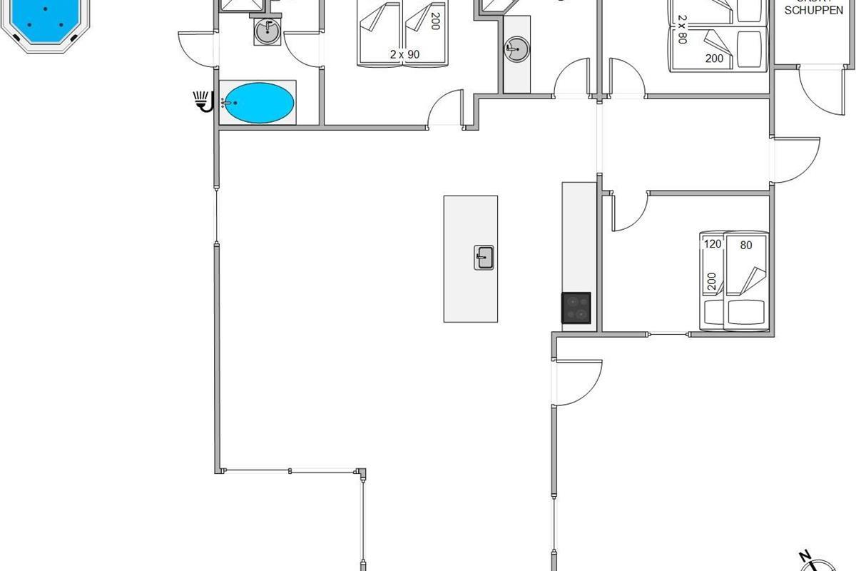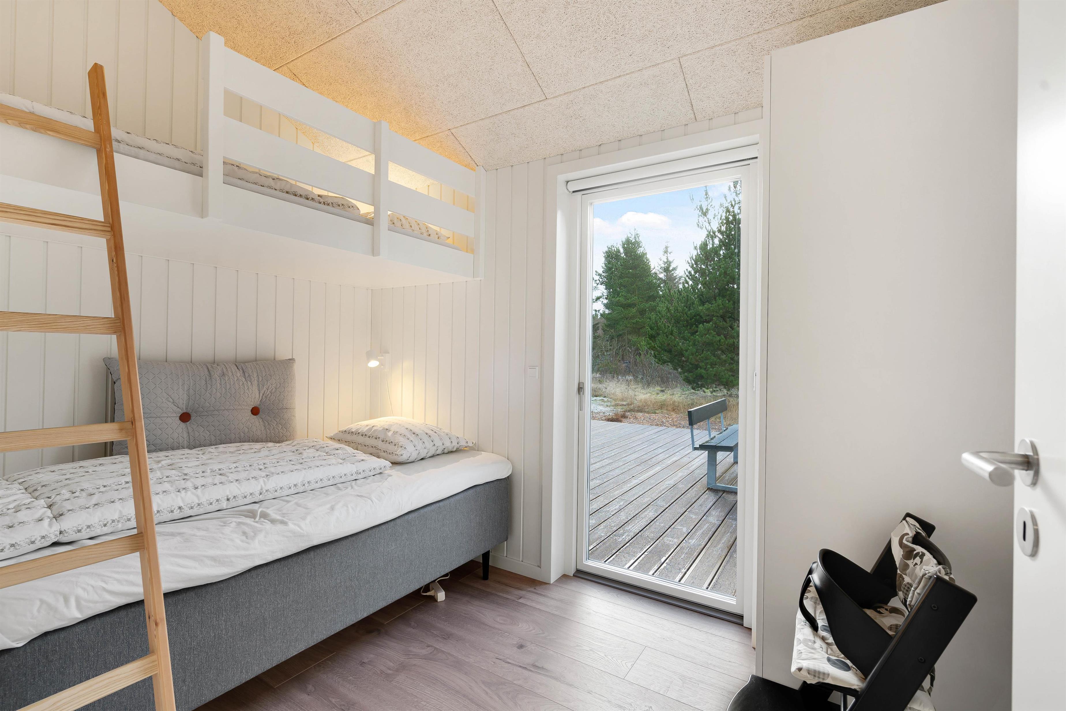 The 110 square metres of this holiday home are well utilised. You'll find two bedrooms with double beds and one room with twin beds. One of the rooms features a mezzanine level. The heart of the house is the open-plan living area with integrated kitchen, where you can spend many pleasant holiday hours - whether cooking together or streaming your favourite films.