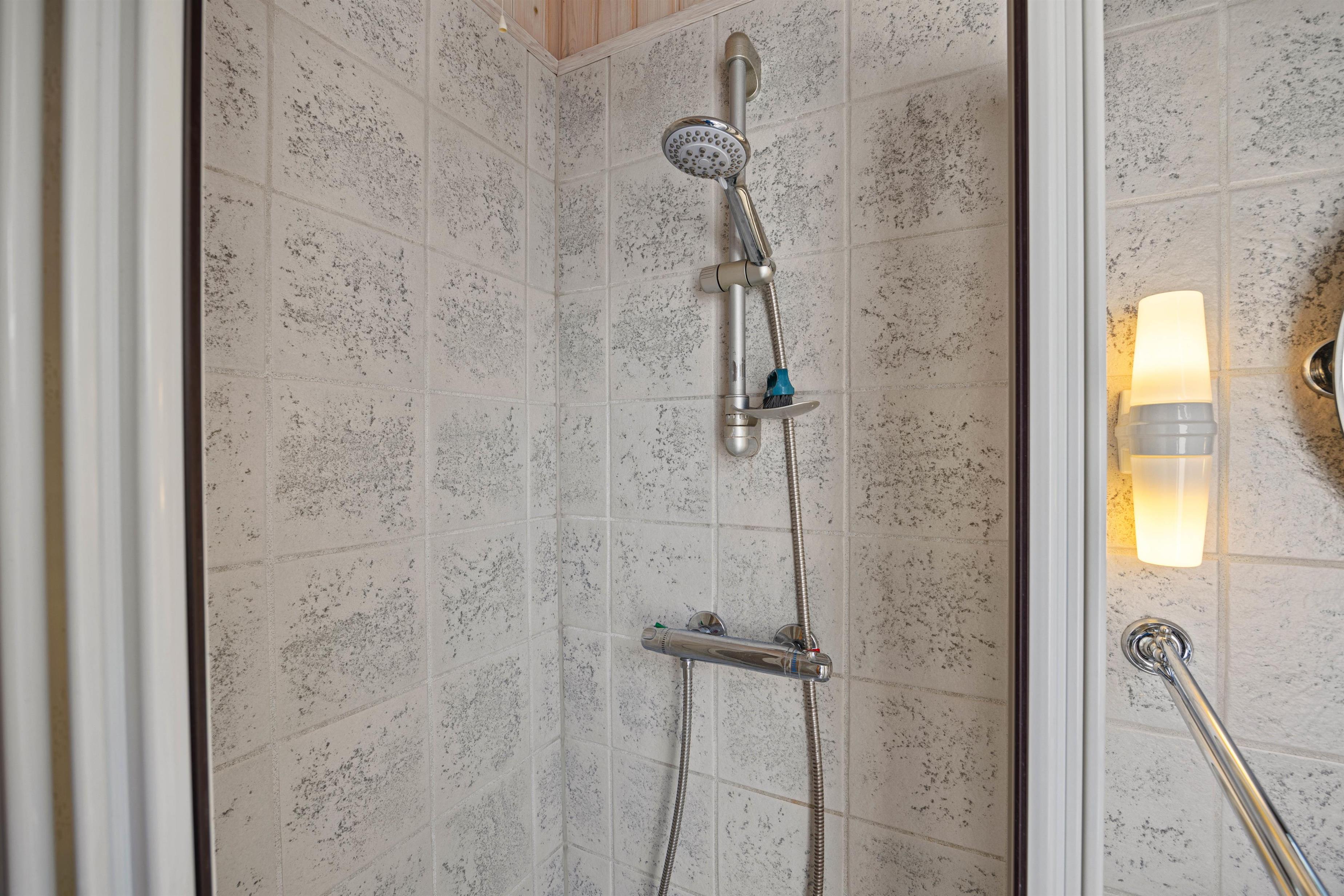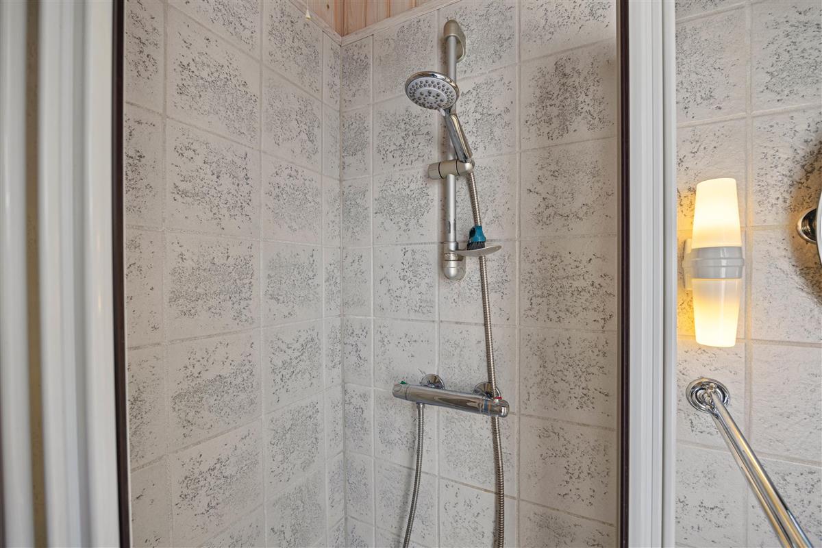 Three bedrooms ensure restful nights. The main bedroom features a double bed, whilst the other two bedrooms offer two single beds and one bunk bed. The modern bathroom provides extra comfort with underfloor heating.