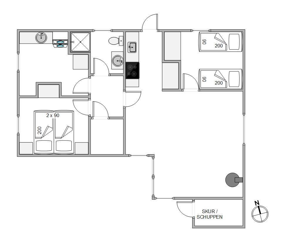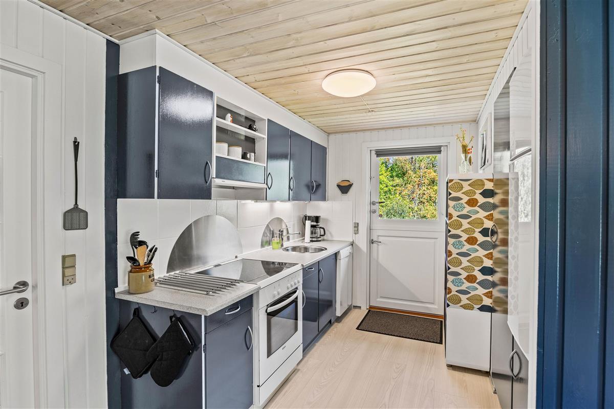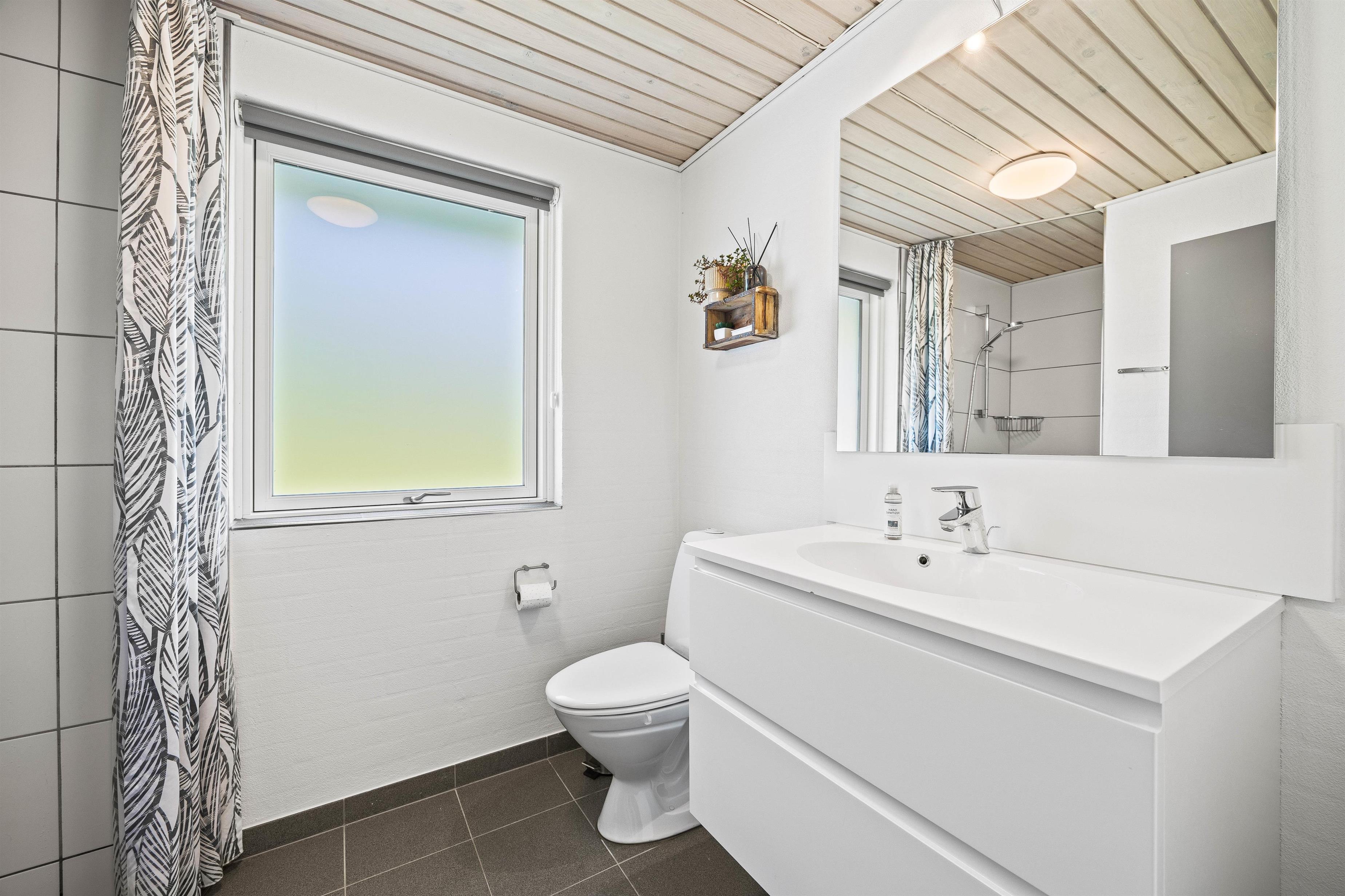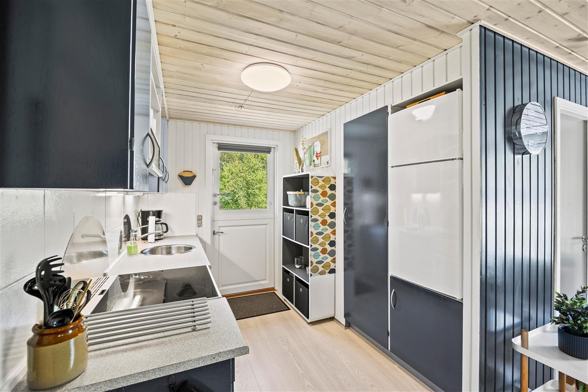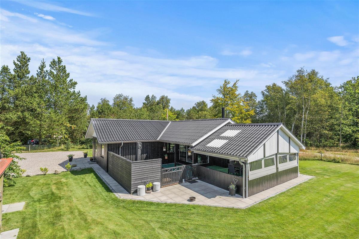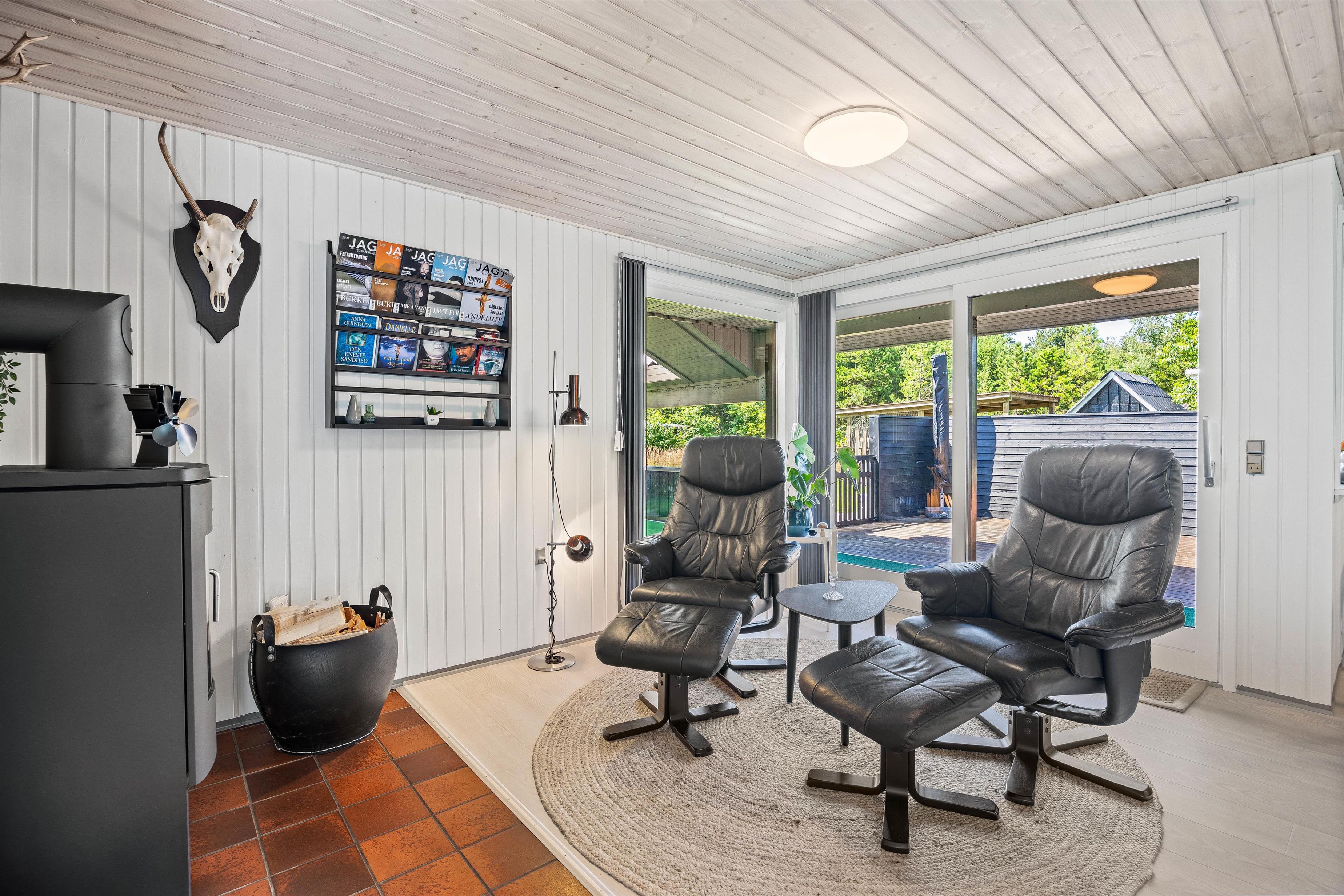 The main entrance leads directly into the functionally designed kitchen with dishwasher. The kitchen opens onto the open-plan dining and living area. Here the whole family can relax, either in the comfortable armchair by the wood-burning stove or in the traditional Danish TV corner. The floor-to-ceiling windows in the living area offer beautiful views of nature, or simply slide open the large patio doors to let in the scent of forest and heather.