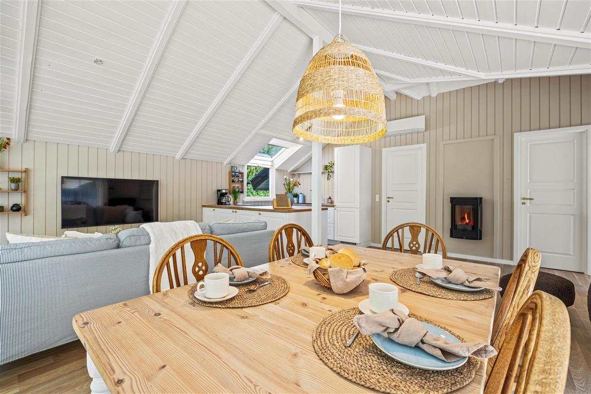 The living area is the heart of Peder Larsensvej 11, perfect for cosy evenings together. Make yourself comfortable and enjoy the warmth of the wood-burning stove while reading a good book or watching a film – the perfect place to unwind.
