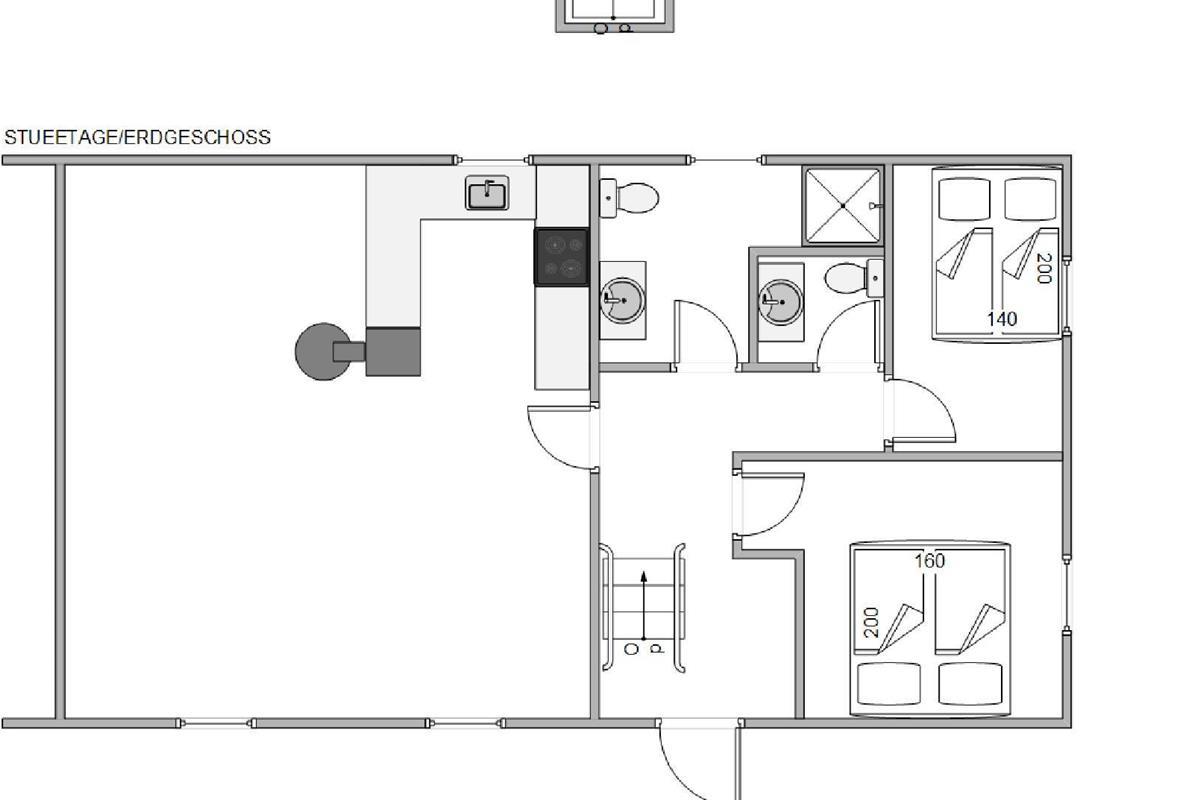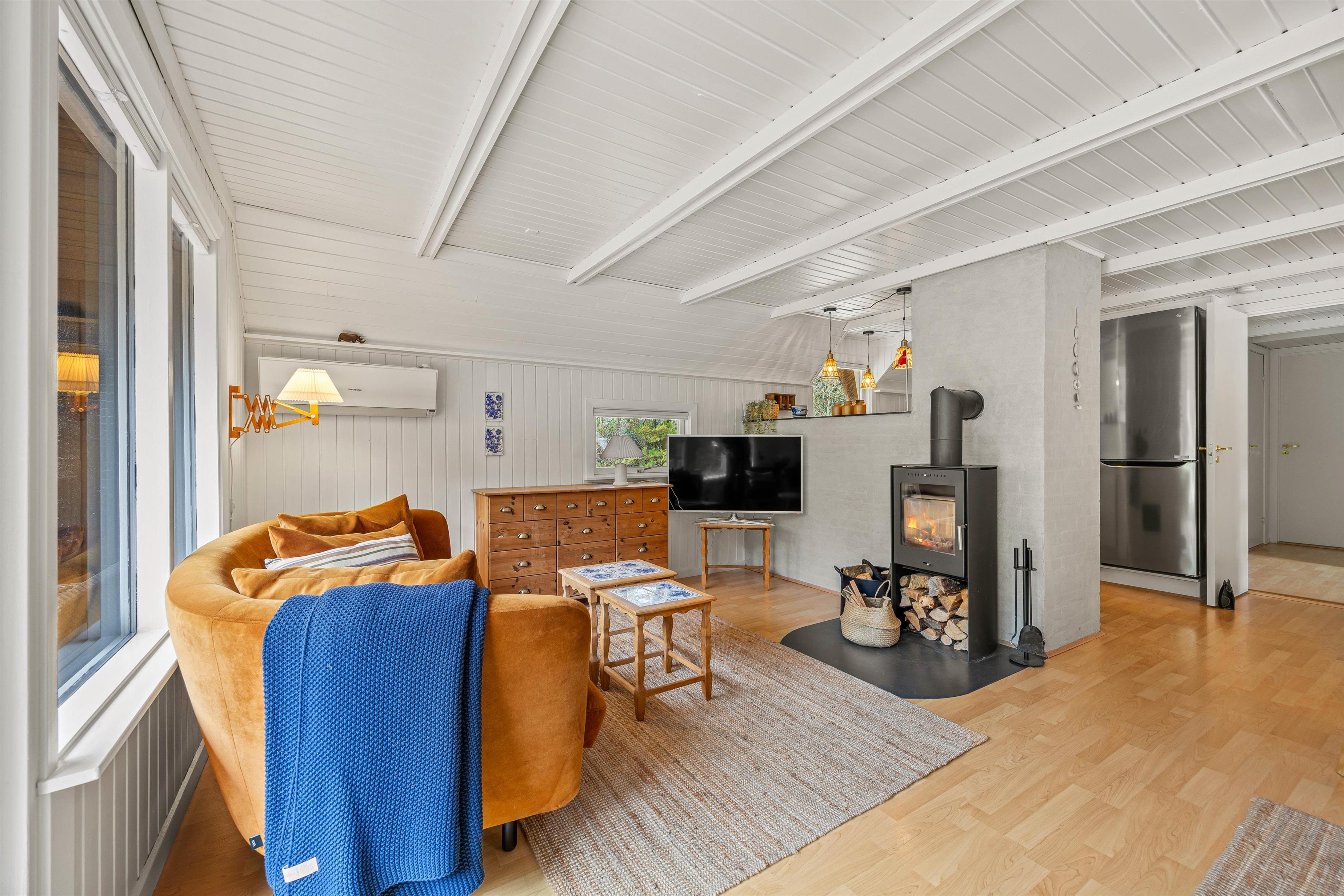 The living room is the heart of the holiday home, offering a comfortable space for sociable evenings. A wood-burning stove provides warmth and creates a cosy atmosphere, particularly inviting on cooler days. The holiday home also features an energy-efficient air-to-air heat pump.