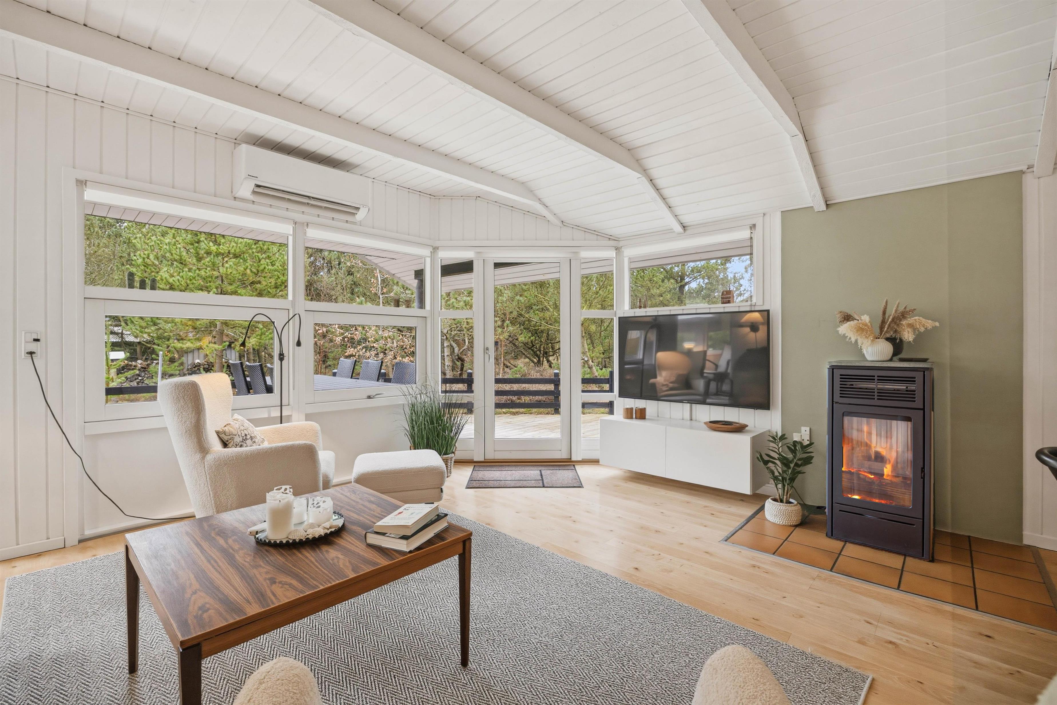 The open-plan living area radiates a welcoming atmosphere, providing the perfect space for spending time with family and friends. Make yourself comfortable on the sofa while the pellet stove provides warming comfort on cooler evenings, creating a relaxed ambiance. With Google Chromecast, you can easily stream your favourite films or series whenever you fancy some entertainment.