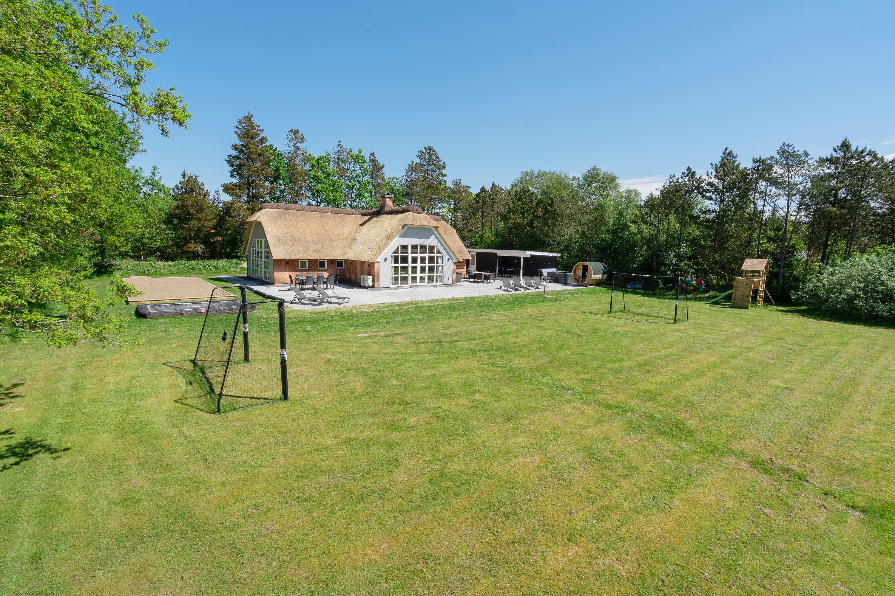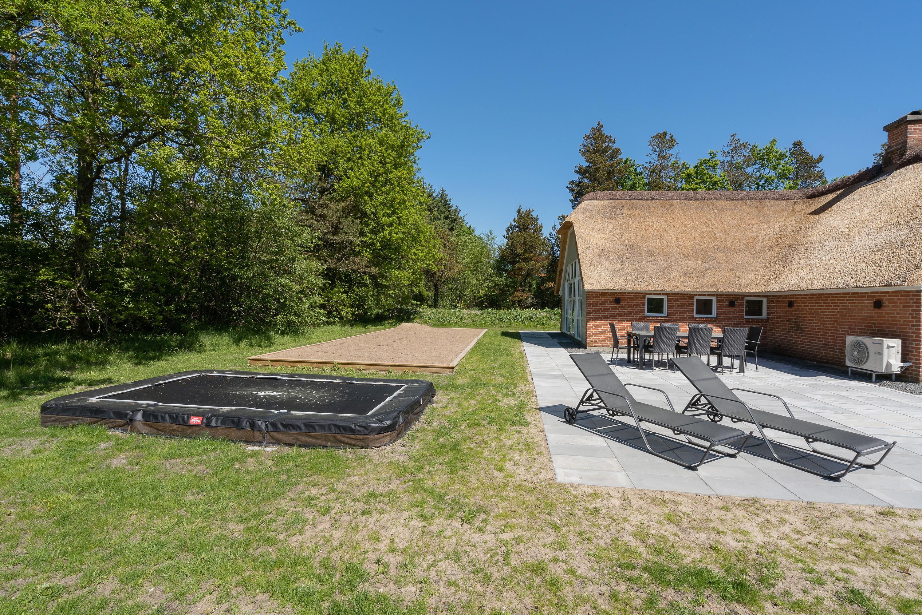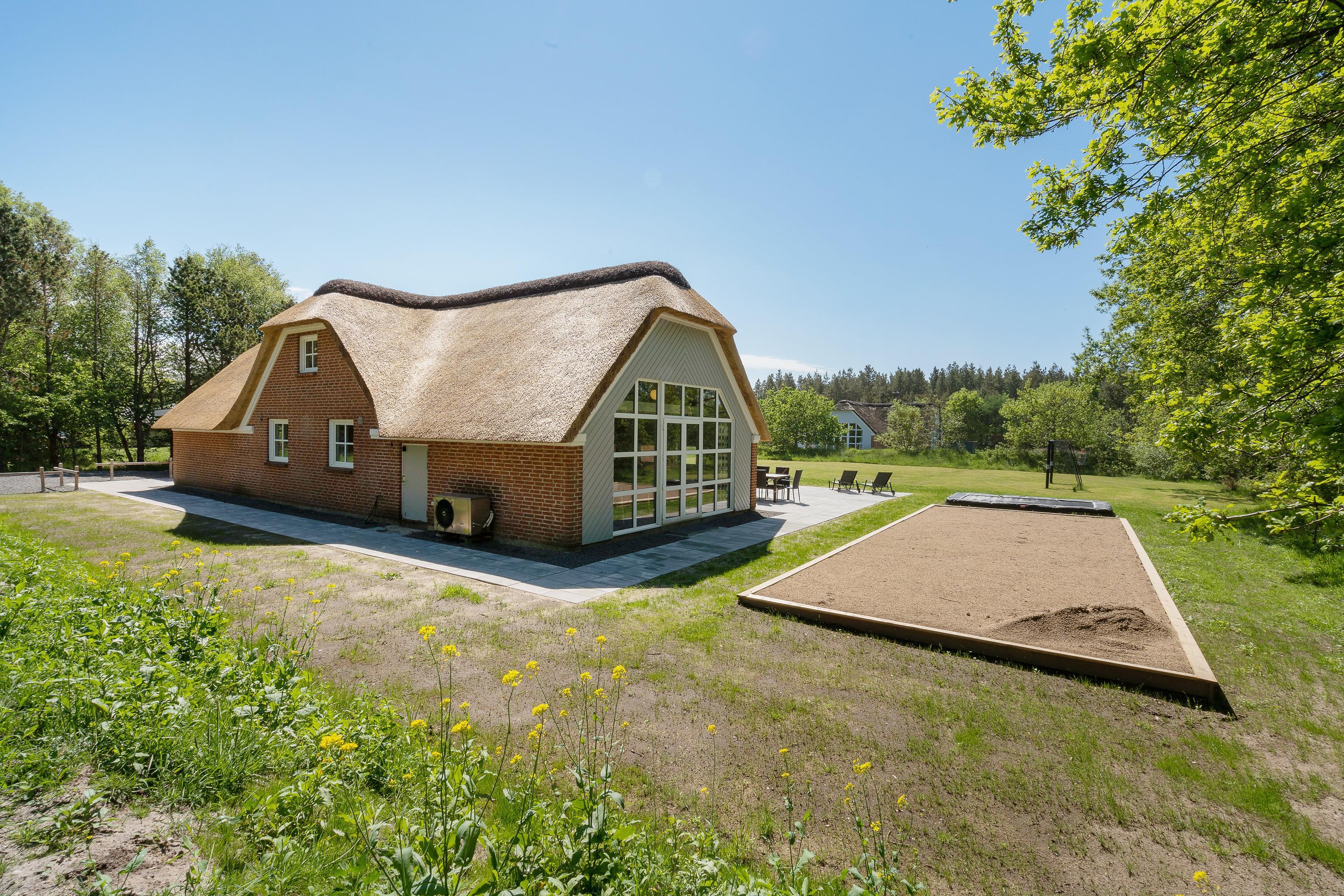 This attractive thatched roof holiday home offers plenty of space for up to two families (nine people total) and your dog, with some fantastic extras! Features include an indoor pool area with whirlpool, superb outdoor grounds with playground equipment (swing, slide), trampoline, beach volleyball court, outdoor sauna, hot tub, and a lovely covered terrace - all in a beautiful location in Houstrup! Welcome to Hedevang 75 - get ready for an unforgettable Danish holiday.
