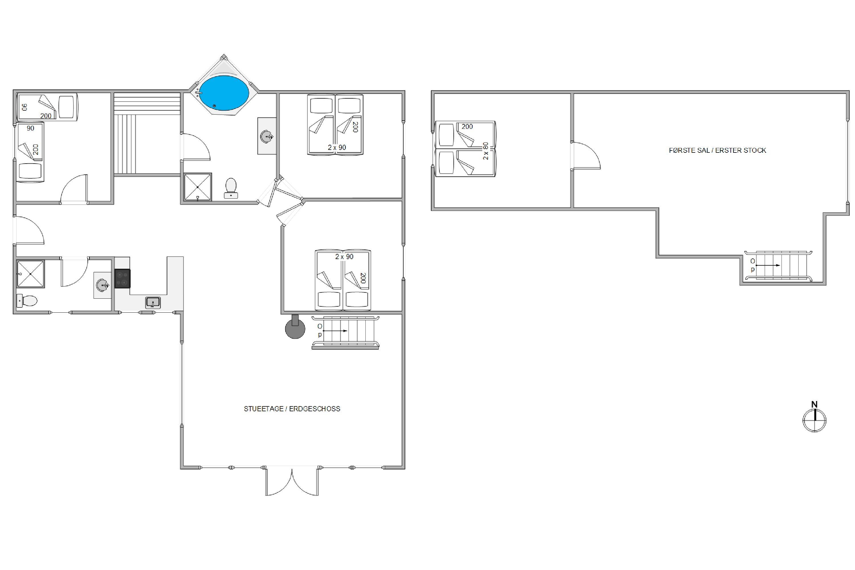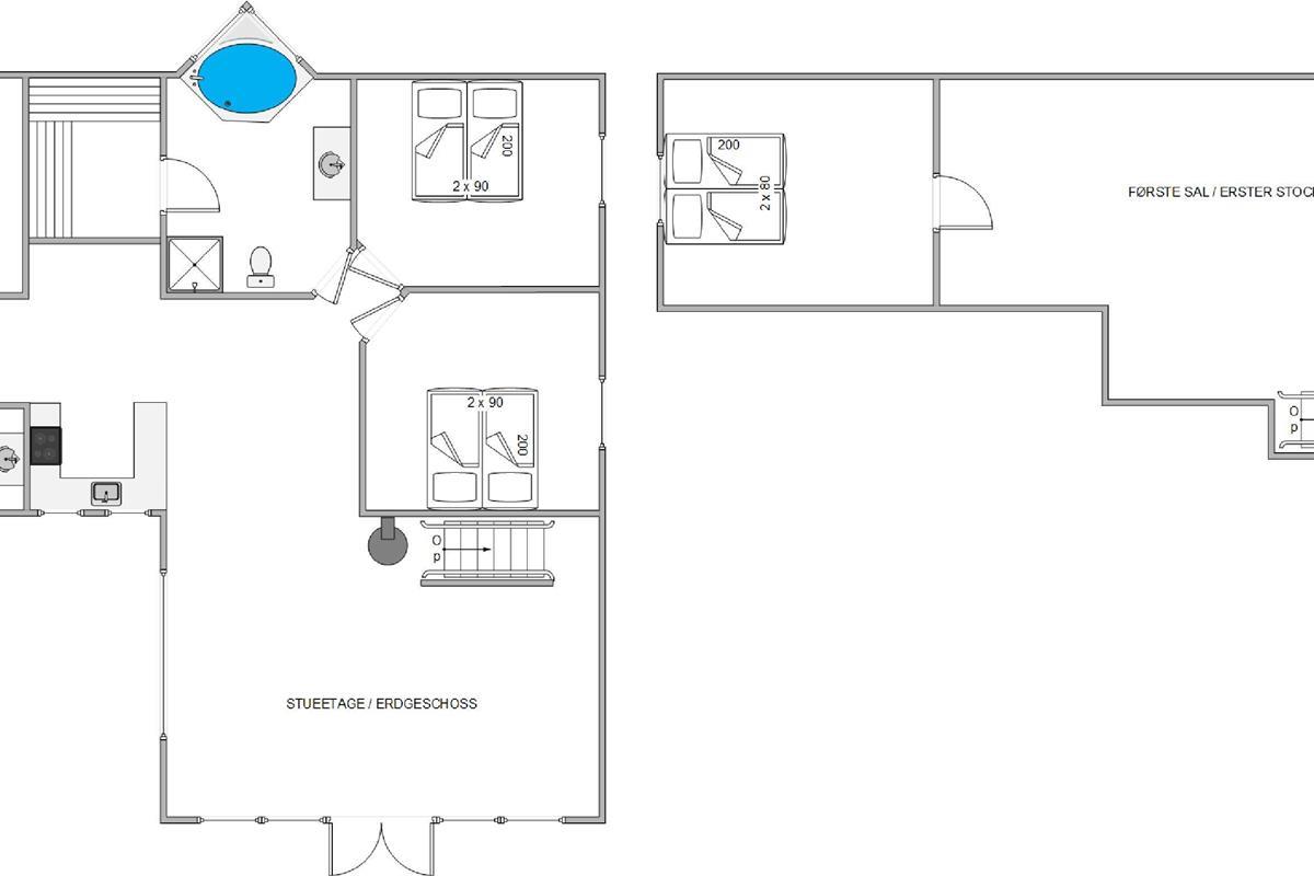 There are 4 bedrooms in total. Three bedrooms feature double beds, while the fourth offers twin beds. This layout makes the holiday home particularly suitable for families or groups of friends travelling together.