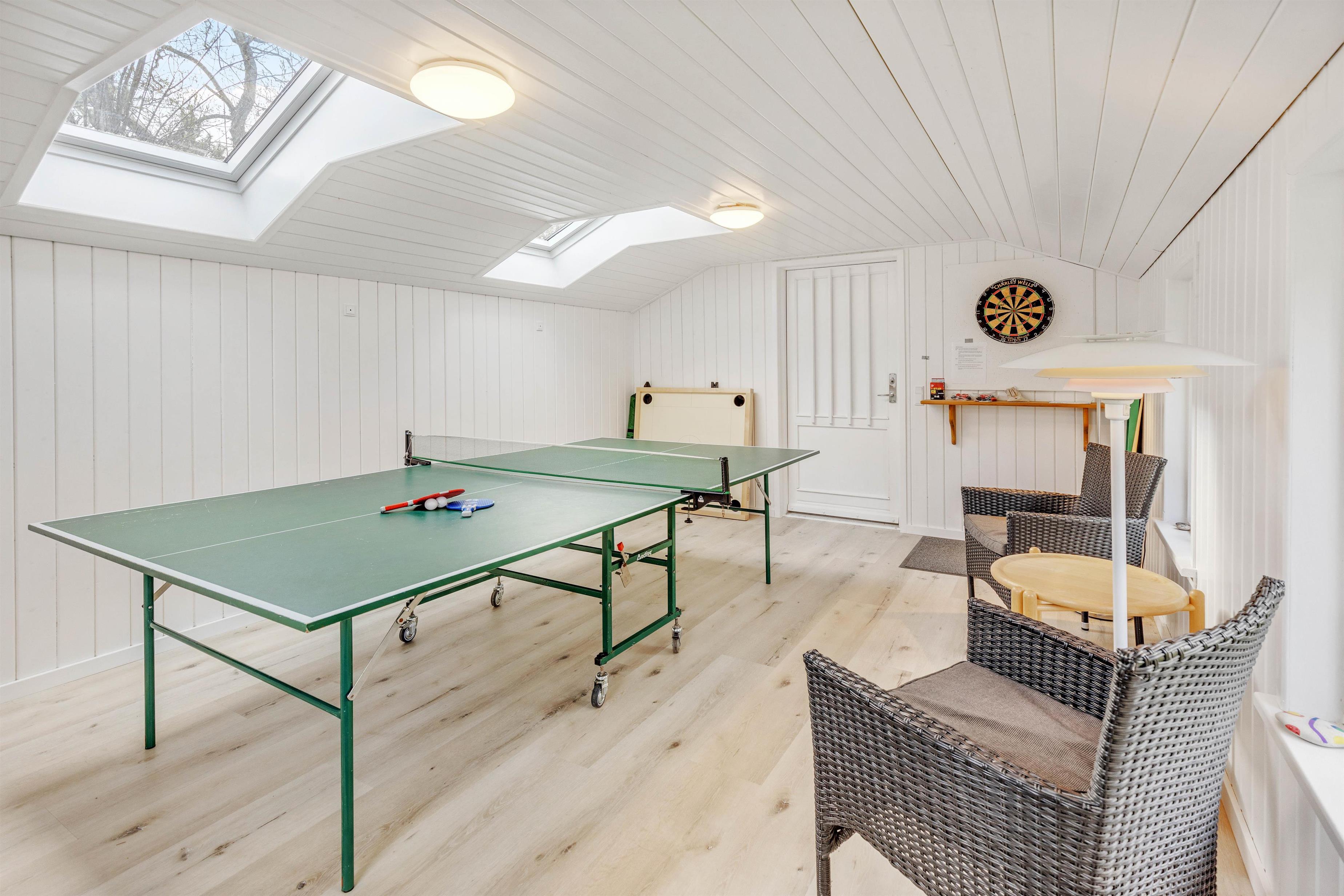 Another highlight awaits in the bathroom. Not only does it feature underfloor heating, but it also provides access to the holiday home's private sauna. This is the perfect spot to unwind and recharge after an invigorating walk in Houstrup's picturesque surroundings. Active holidaymakers can enjoy the games room located in the garage - you'll certainly spend many hours here!