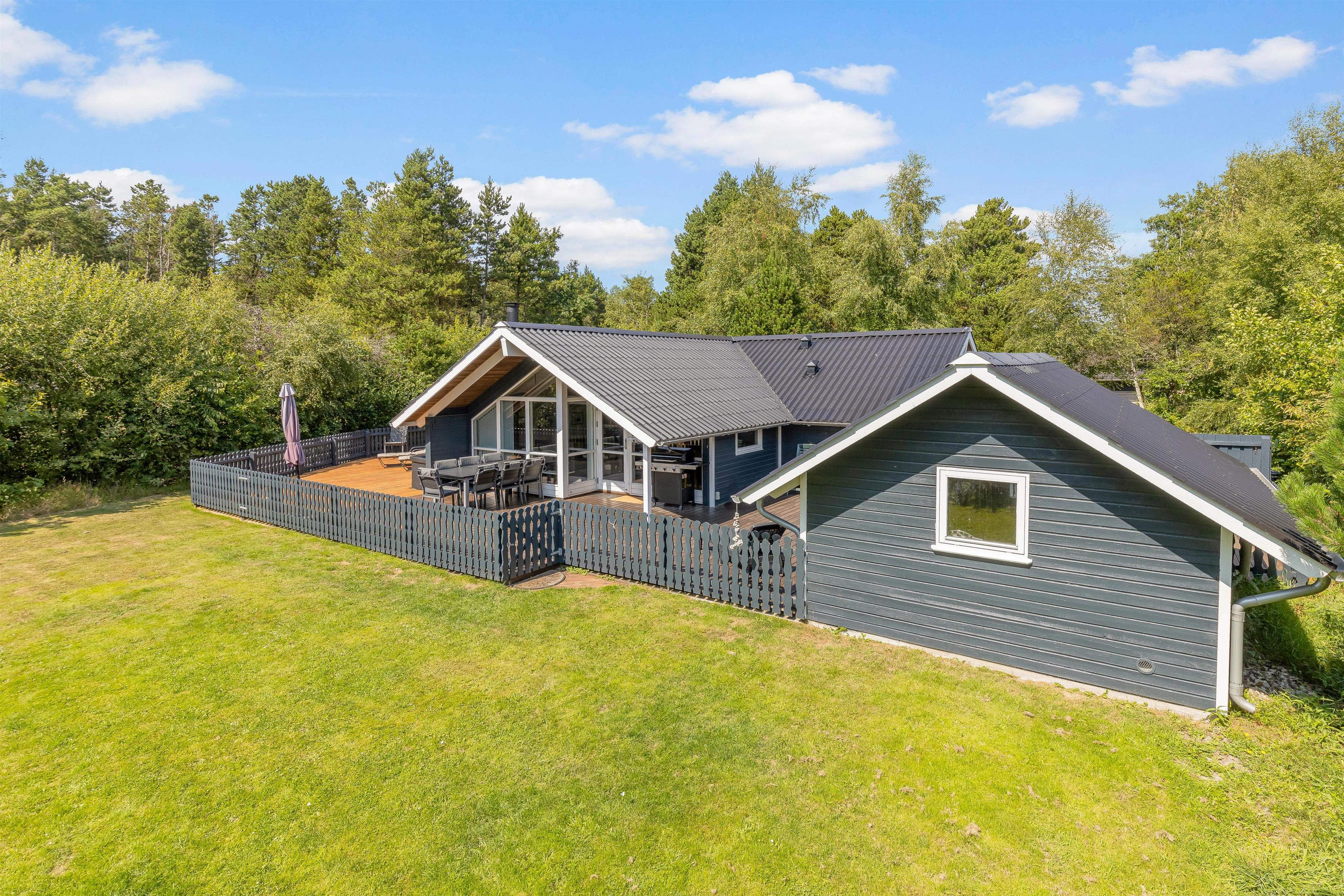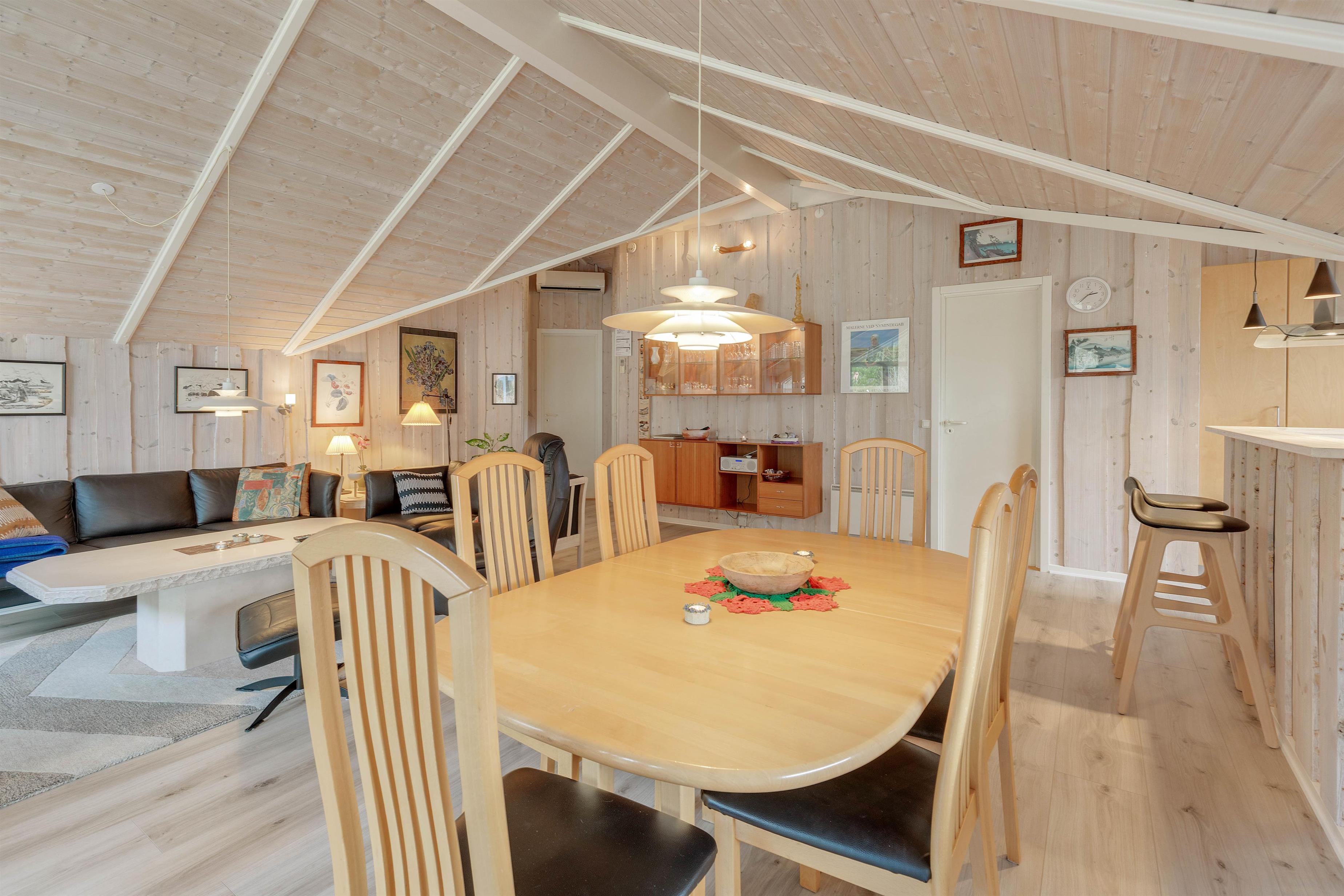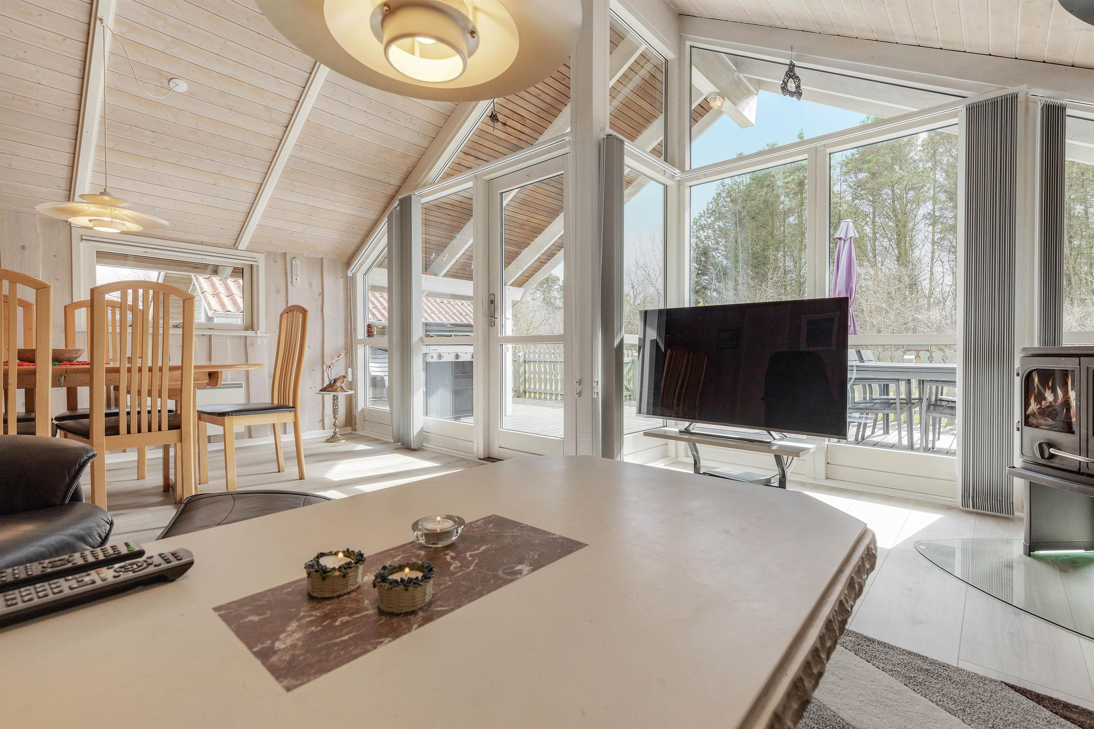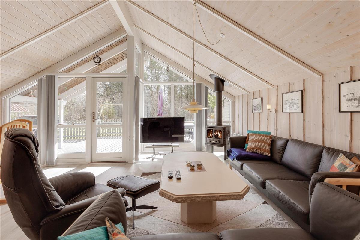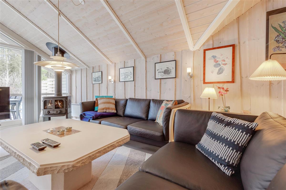 This welcoming wooden holiday home stands on the edge of woodland in Houstrup, featuring an enclosed terrace that's perfect for holidays with children and dogs. The living area is bright and cheerfully furnished with characteristic Danish charm, creating an instant holiday atmosphere as soon as you step inside.