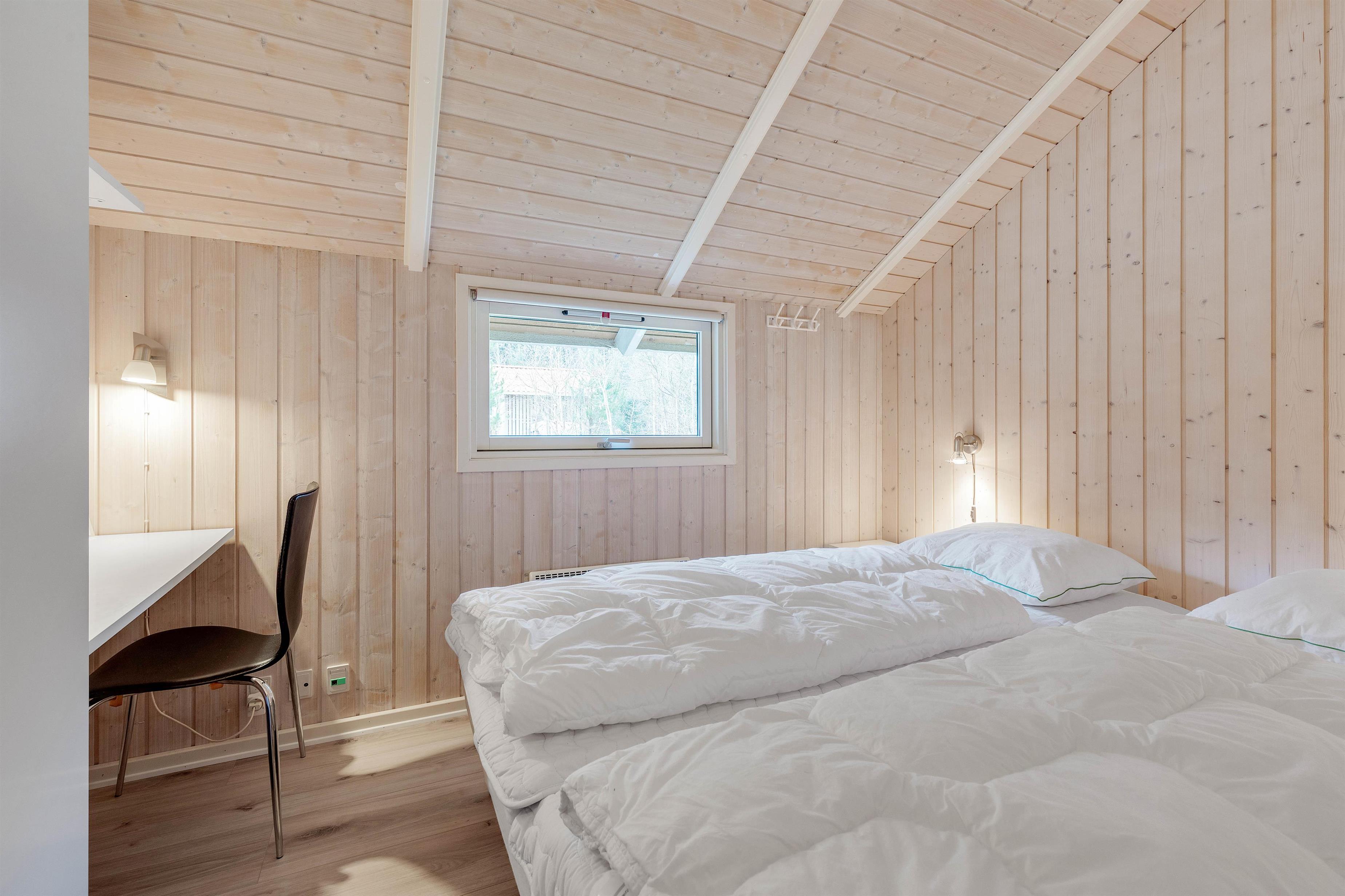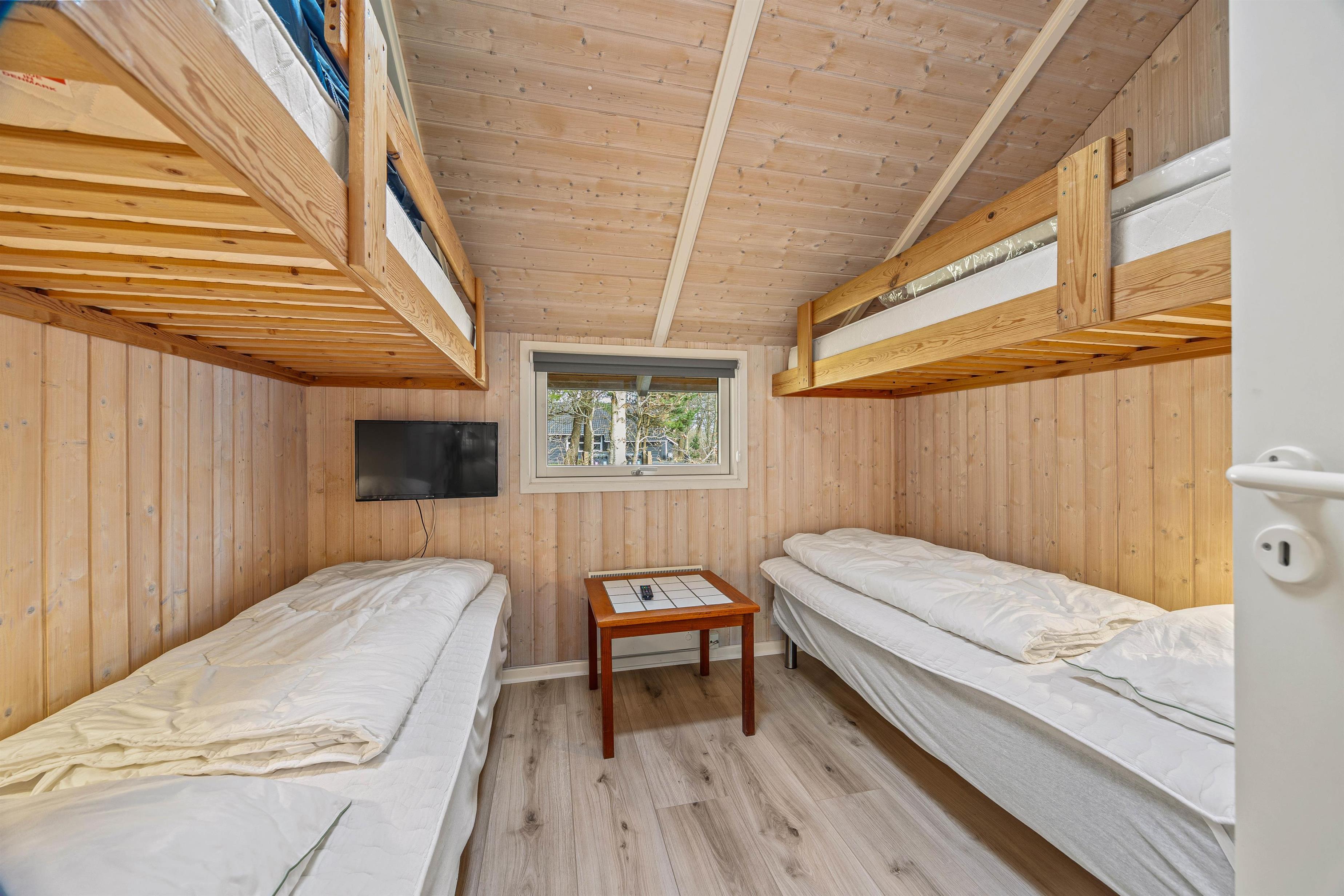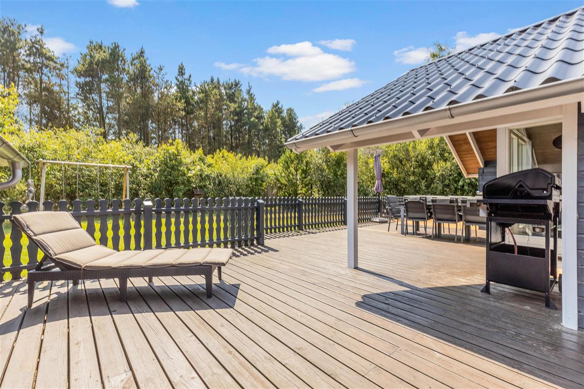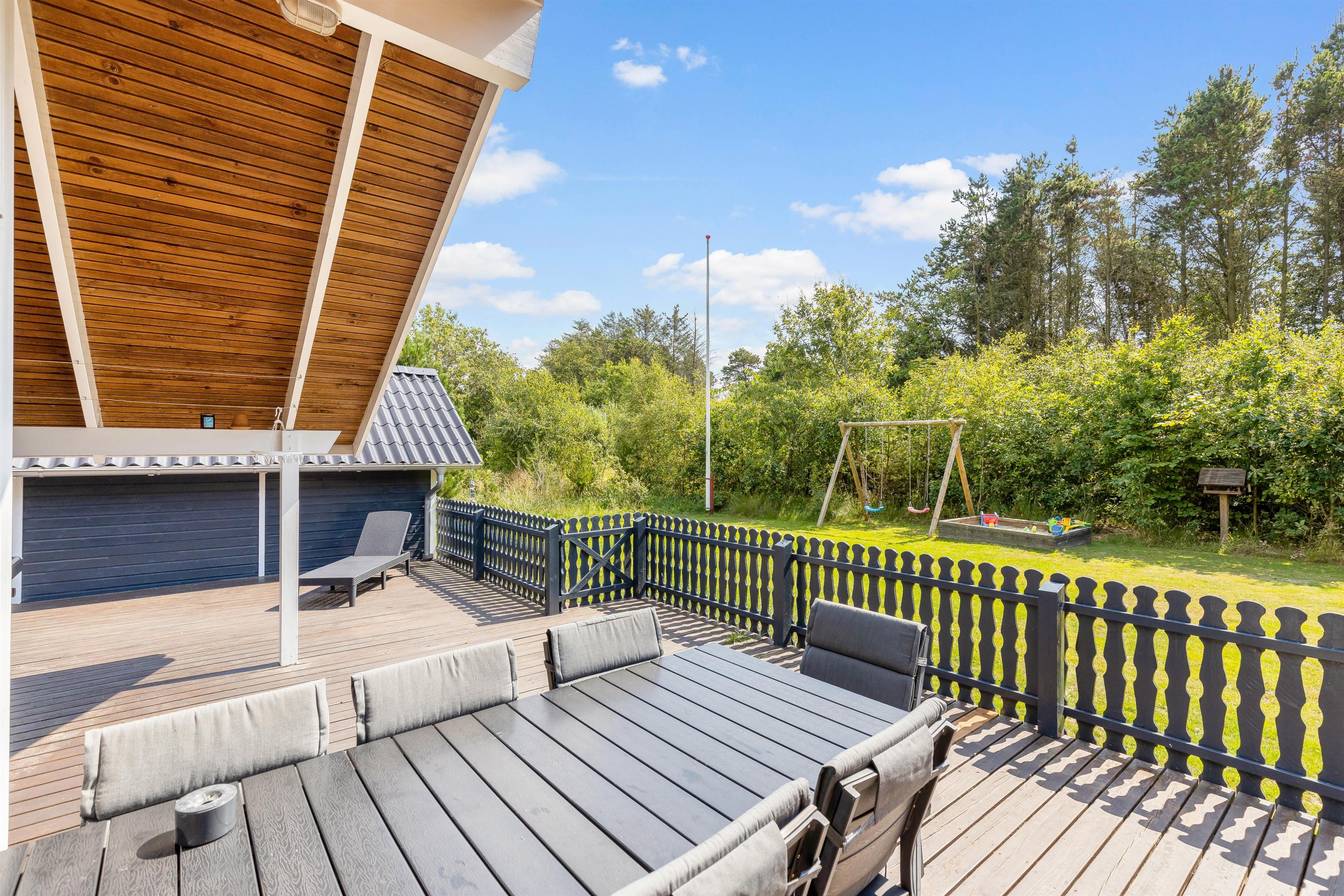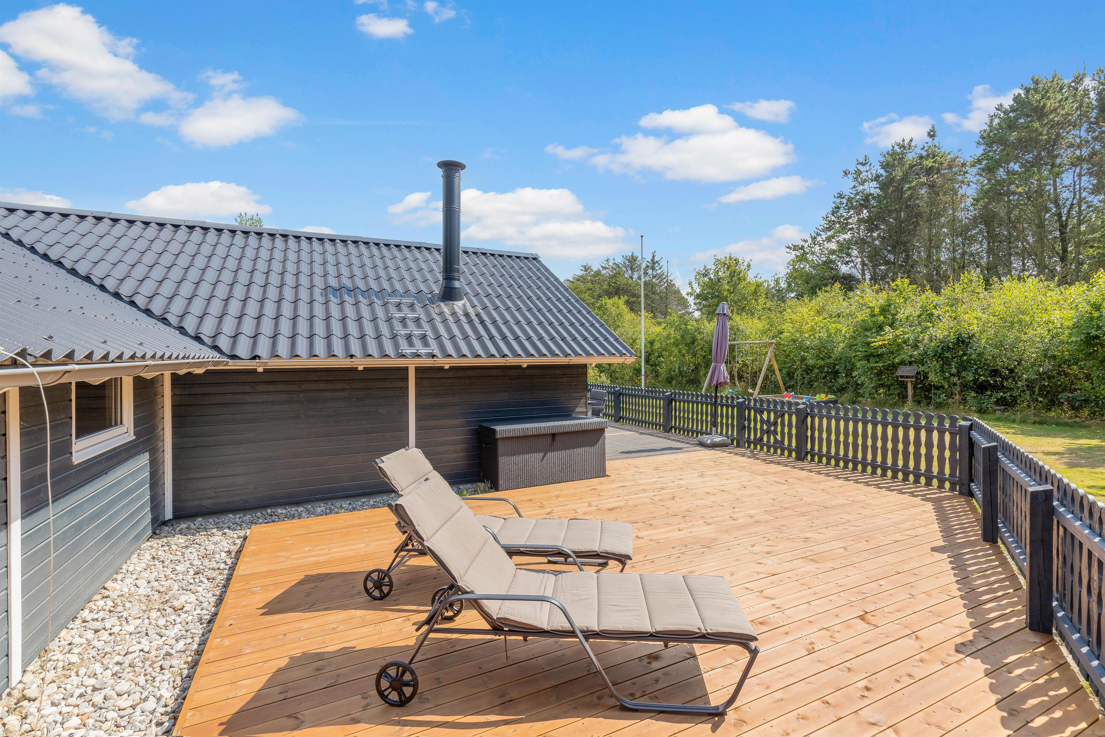 This welcoming wooden holiday home stands on the edge of woodland in Houstrup, featuring an enclosed terrace that's perfect for holidays with children and dogs. The living area is bright and cheerfully furnished with characteristic Danish charm, creating an instant holiday atmosphere as soon as you step inside.
