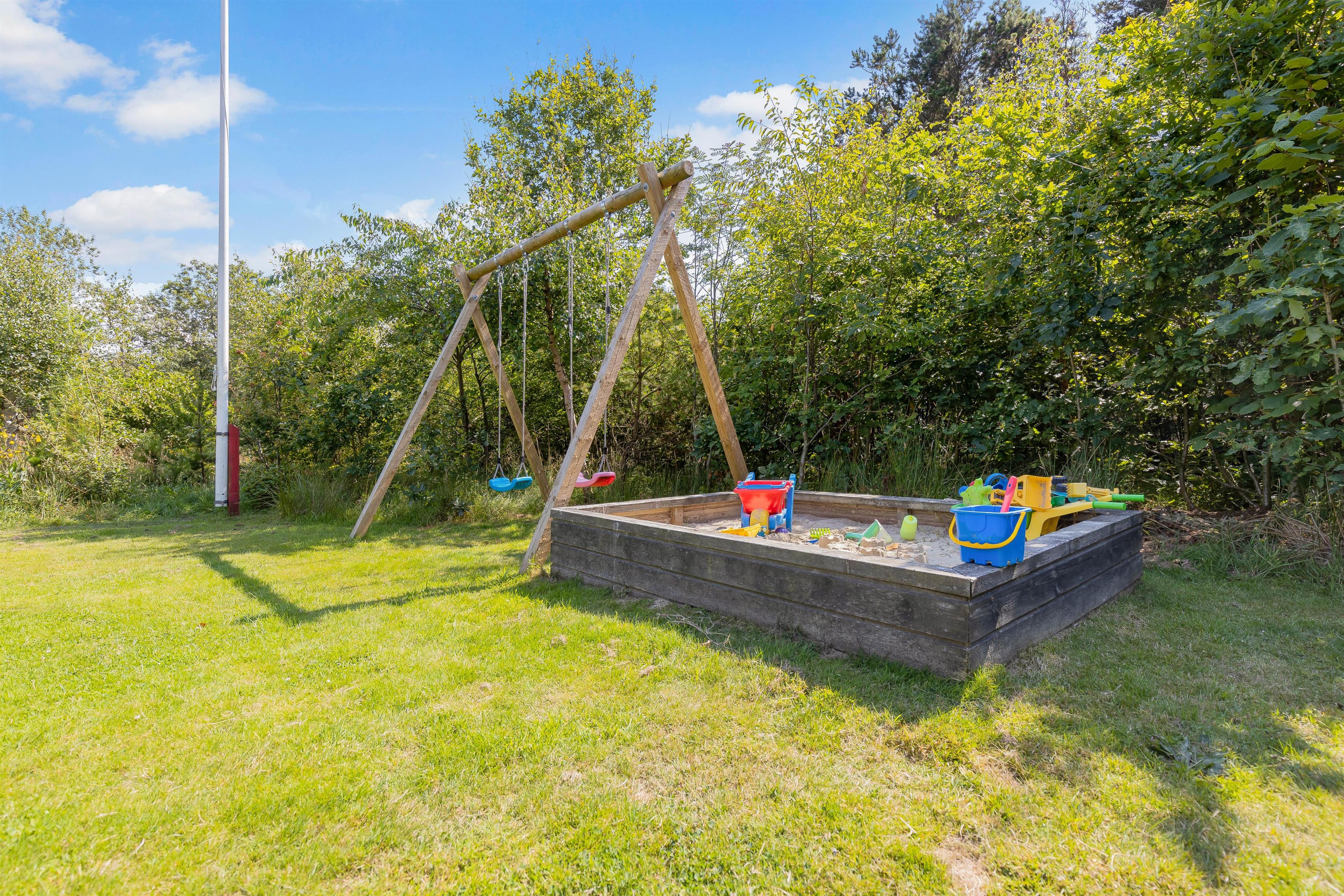 The large lawn, surrounded by tall trees, invites both young and old to play football, build sandcastles, and enjoy the swings. The enclosed terrace is ideal for dog owners and families with small children, allowing everyone to relax outdoors without worry and enjoy their holiday to the full.