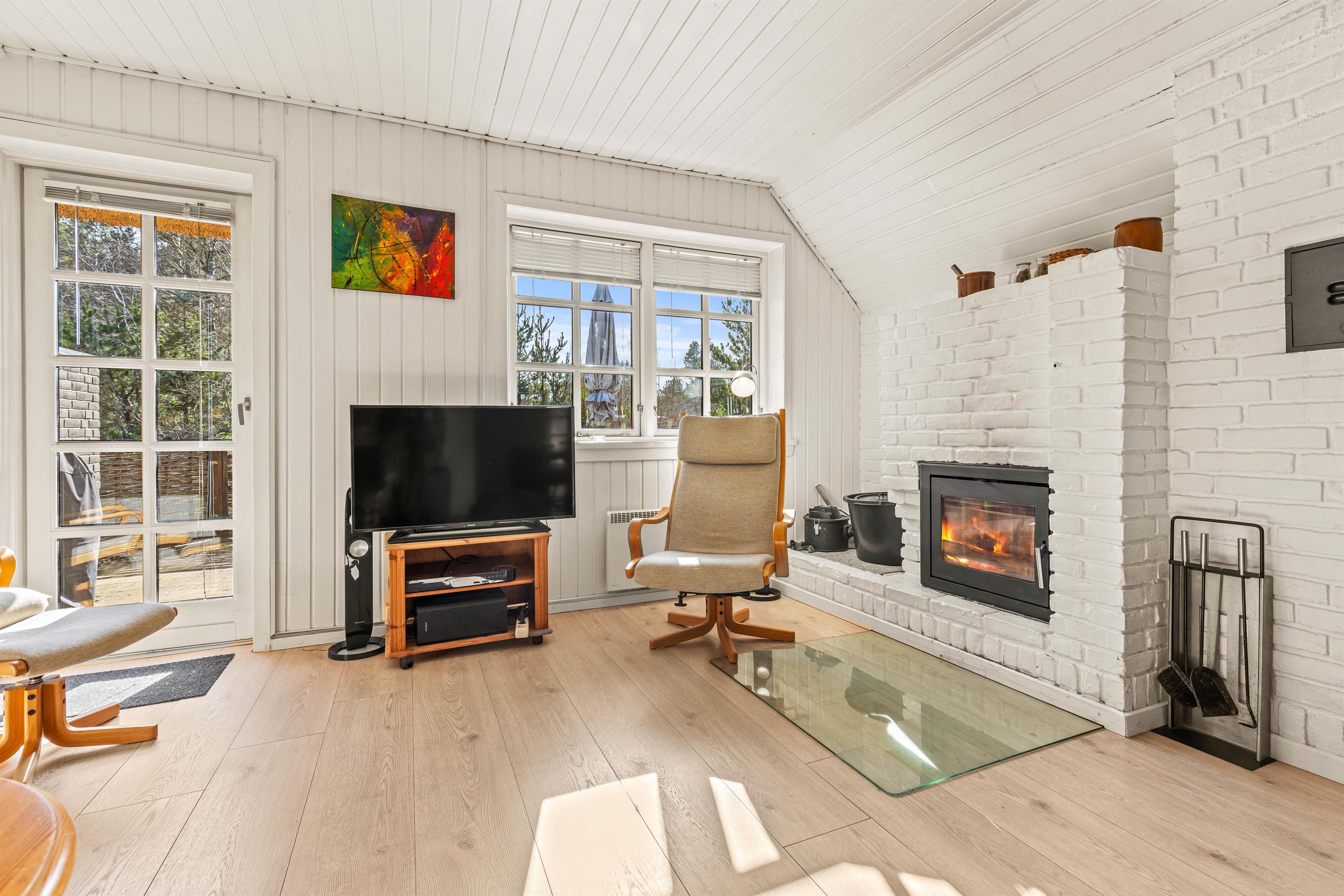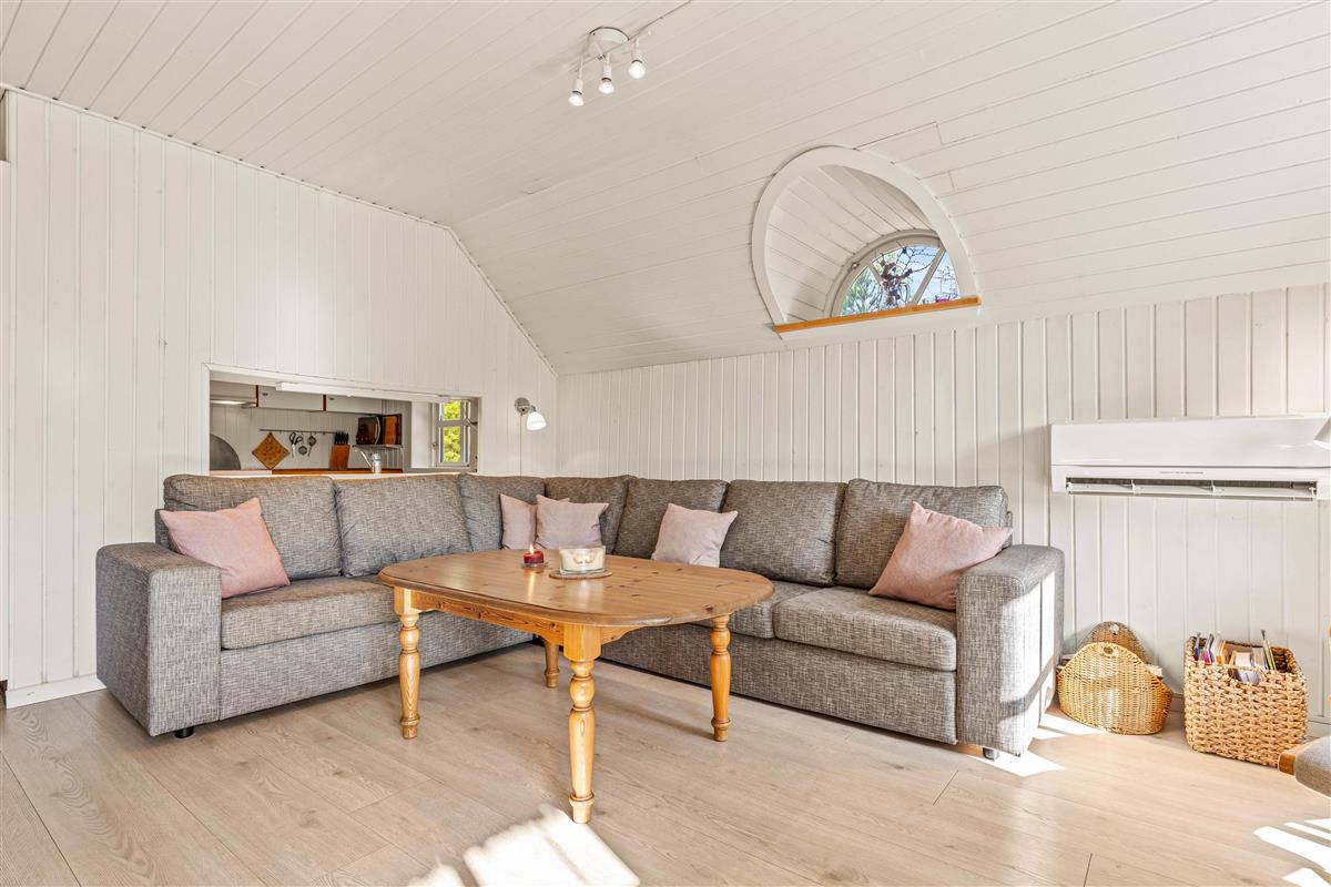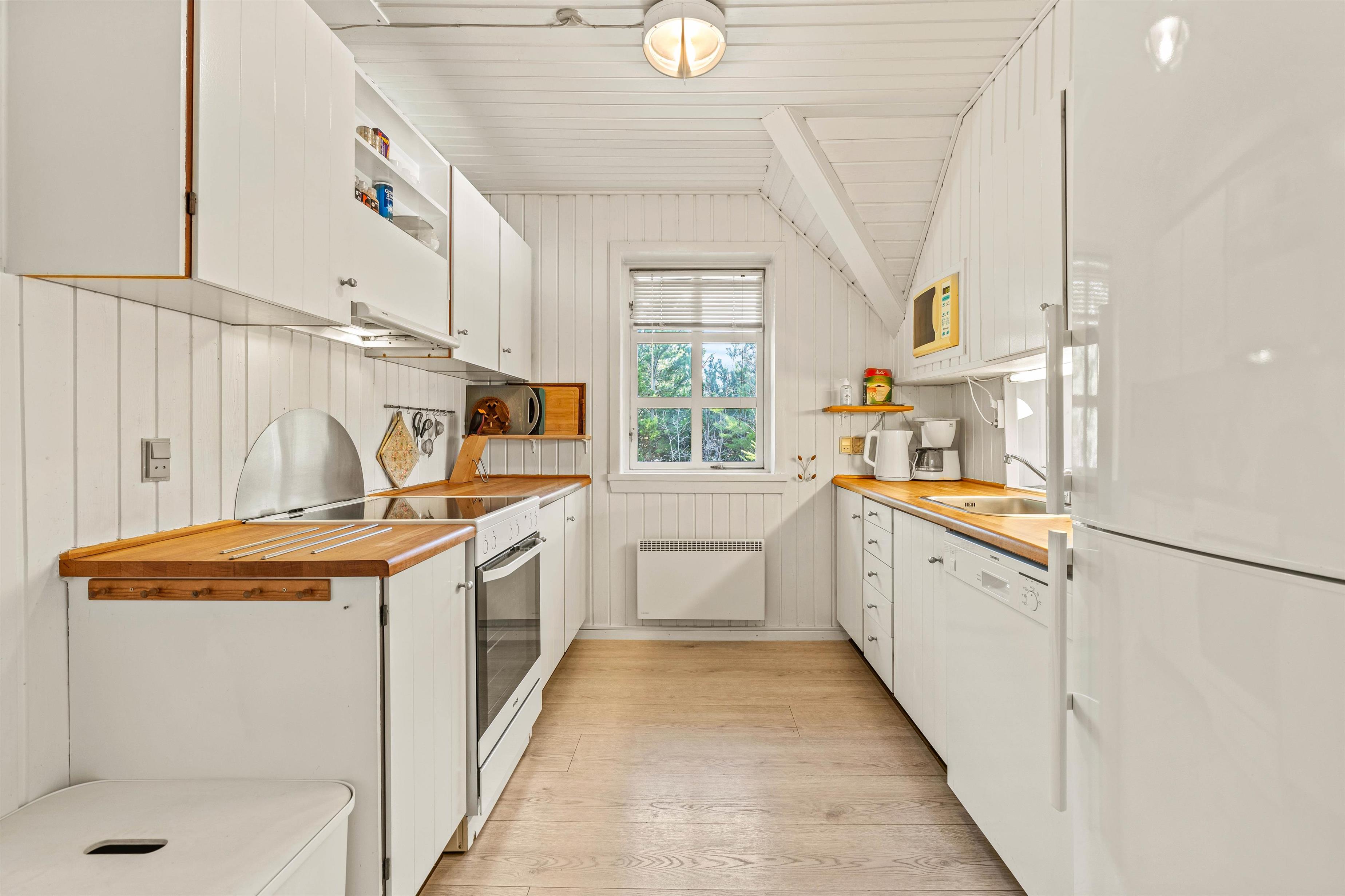 The large corner sofa offers comfortable relaxation while the built-in fireplace crackles, whether you're watching a film on the TV or reading an engaging book. The comfortable armchairs provide the perfect spot to unwind with music and conversation during your holiday on Denmark's west coast. The long dining table is perfect for card games and enjoying meals prepared together. The well-equipped kitchen provides everything needed, including a large fridge-freezer, microwave, dishwasher and a quality cooker with oven.