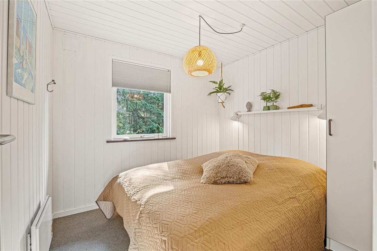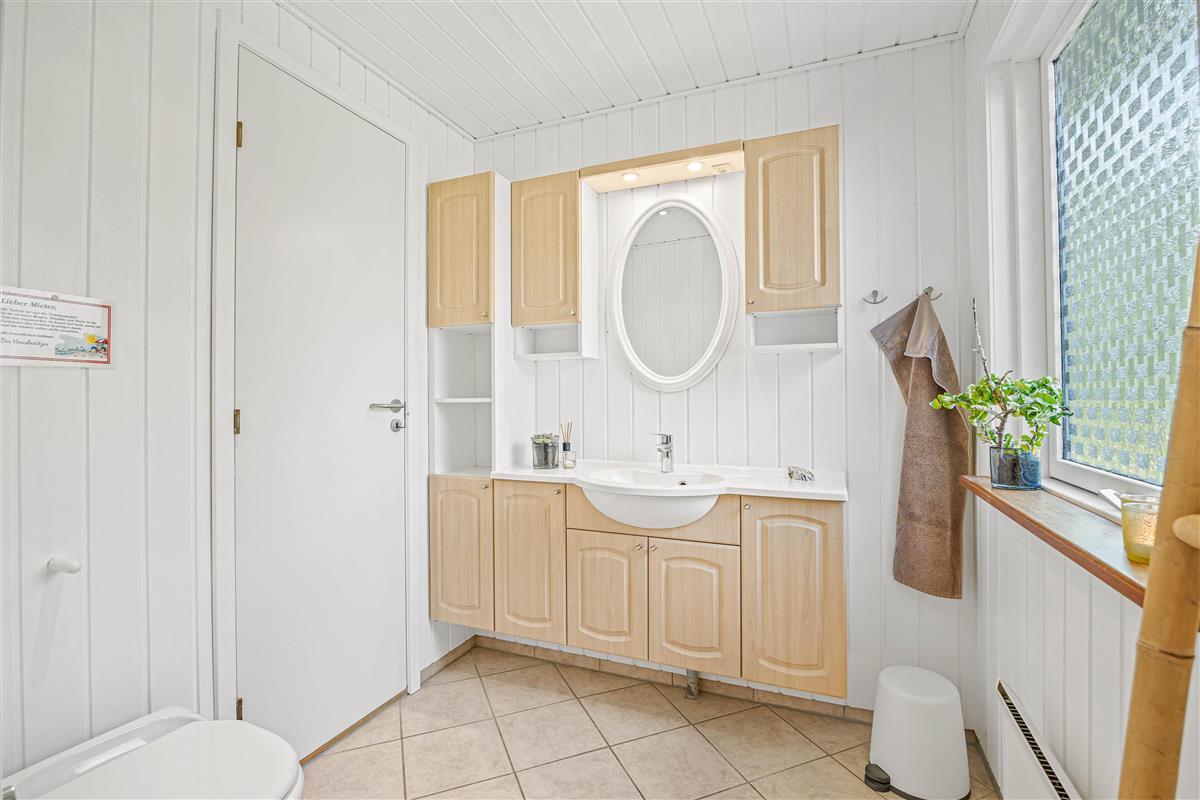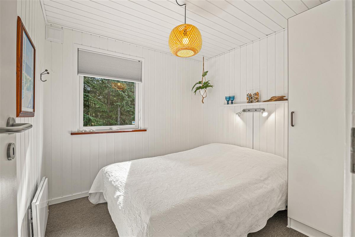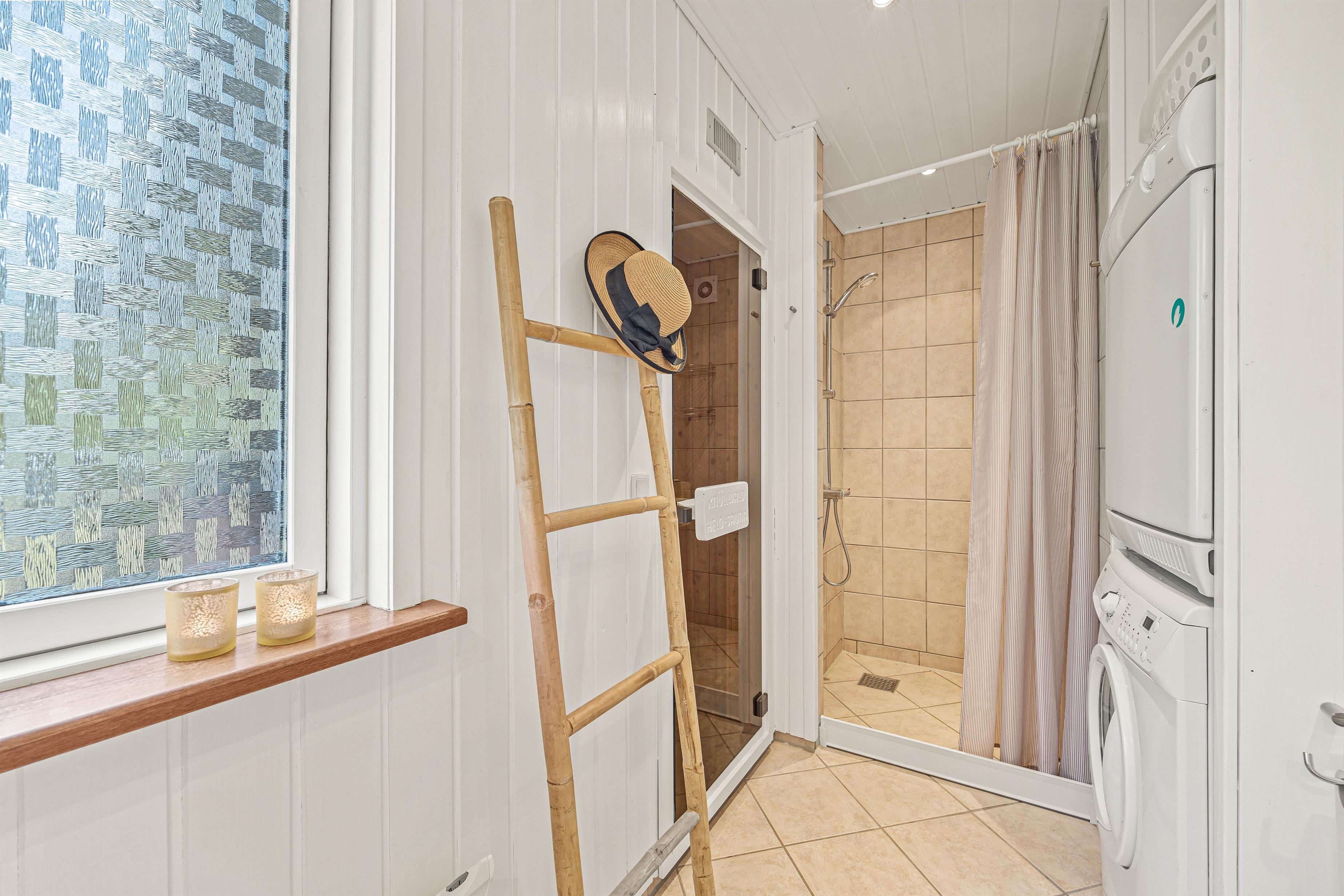 Entering the holiday home on Højsvej 19, you'll find yourself in a long hallway. To your left are two bedrooms, one with a single bed and one with a double bed. On the right is the bathroom with underfloor heating, offering direct access to the sauna. A washing machine and tumble dryer ensure fresh towels daily.