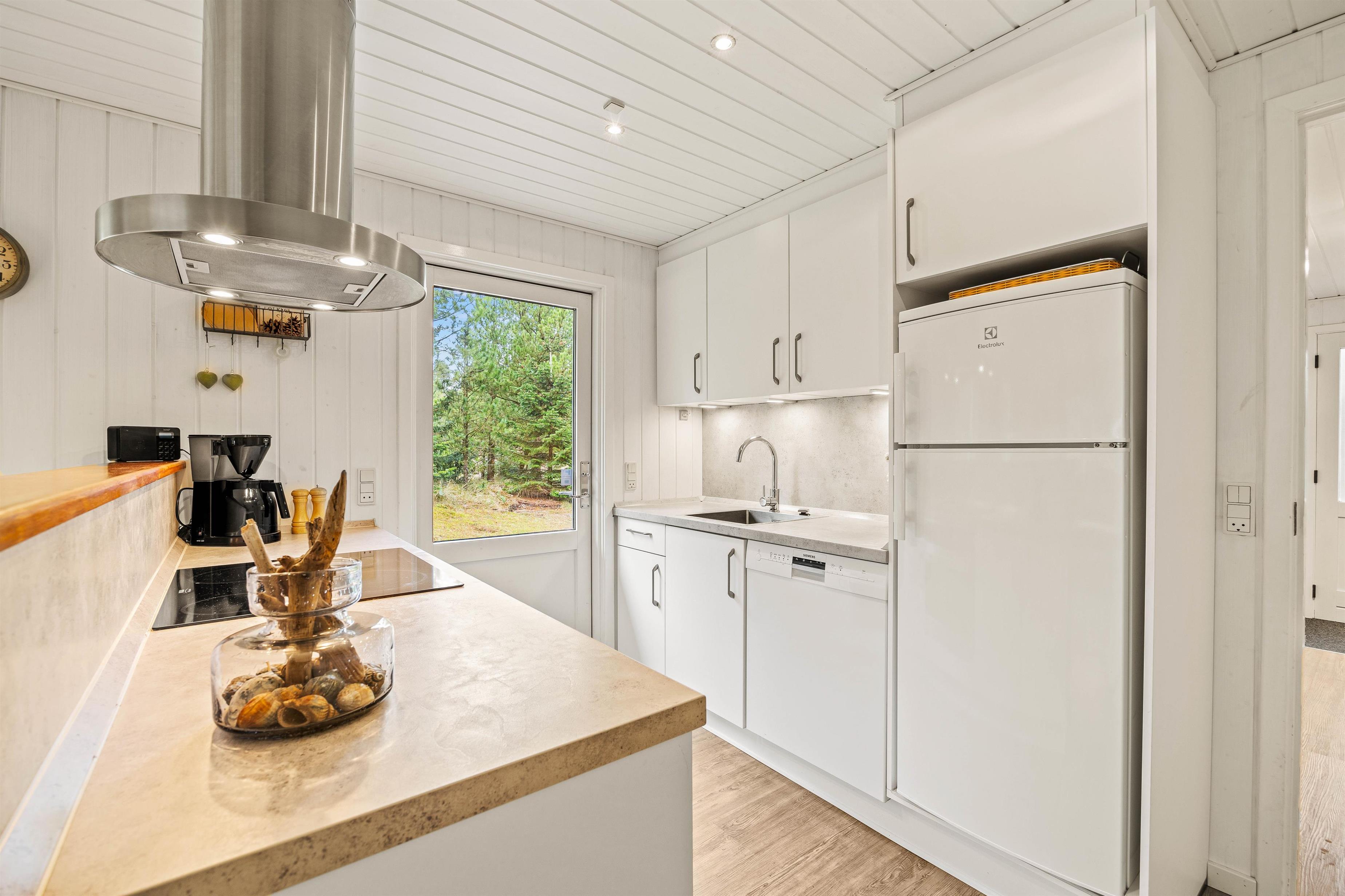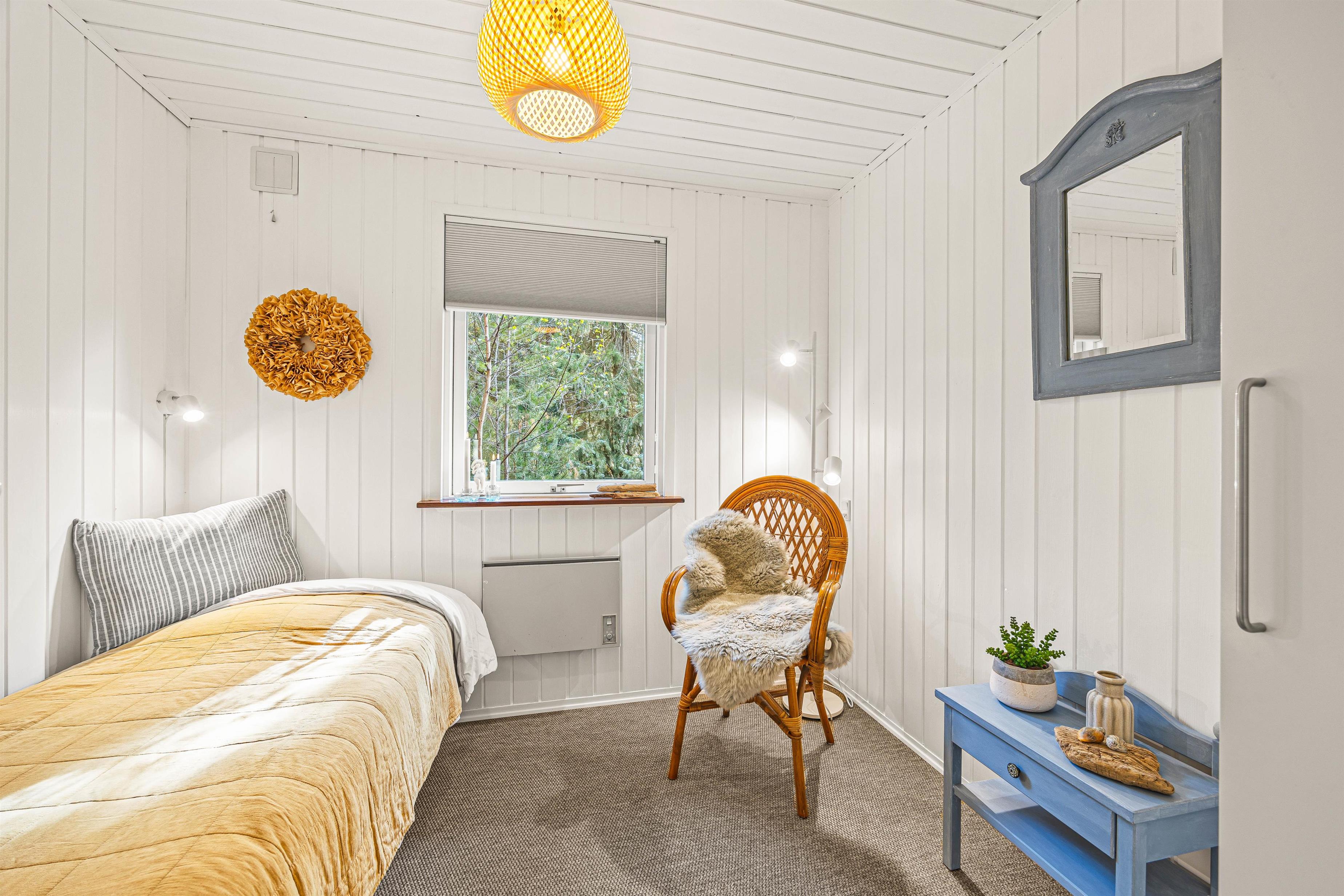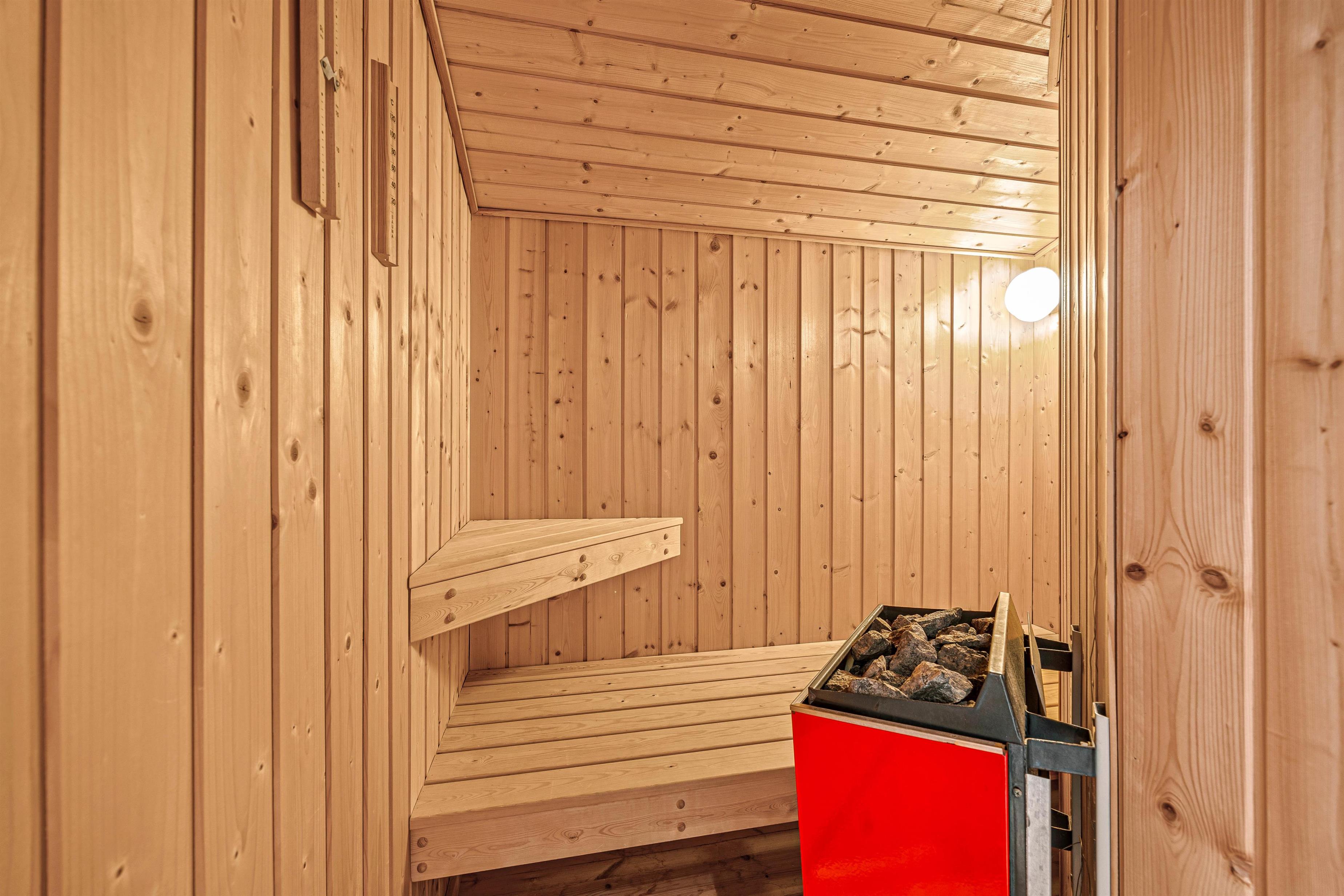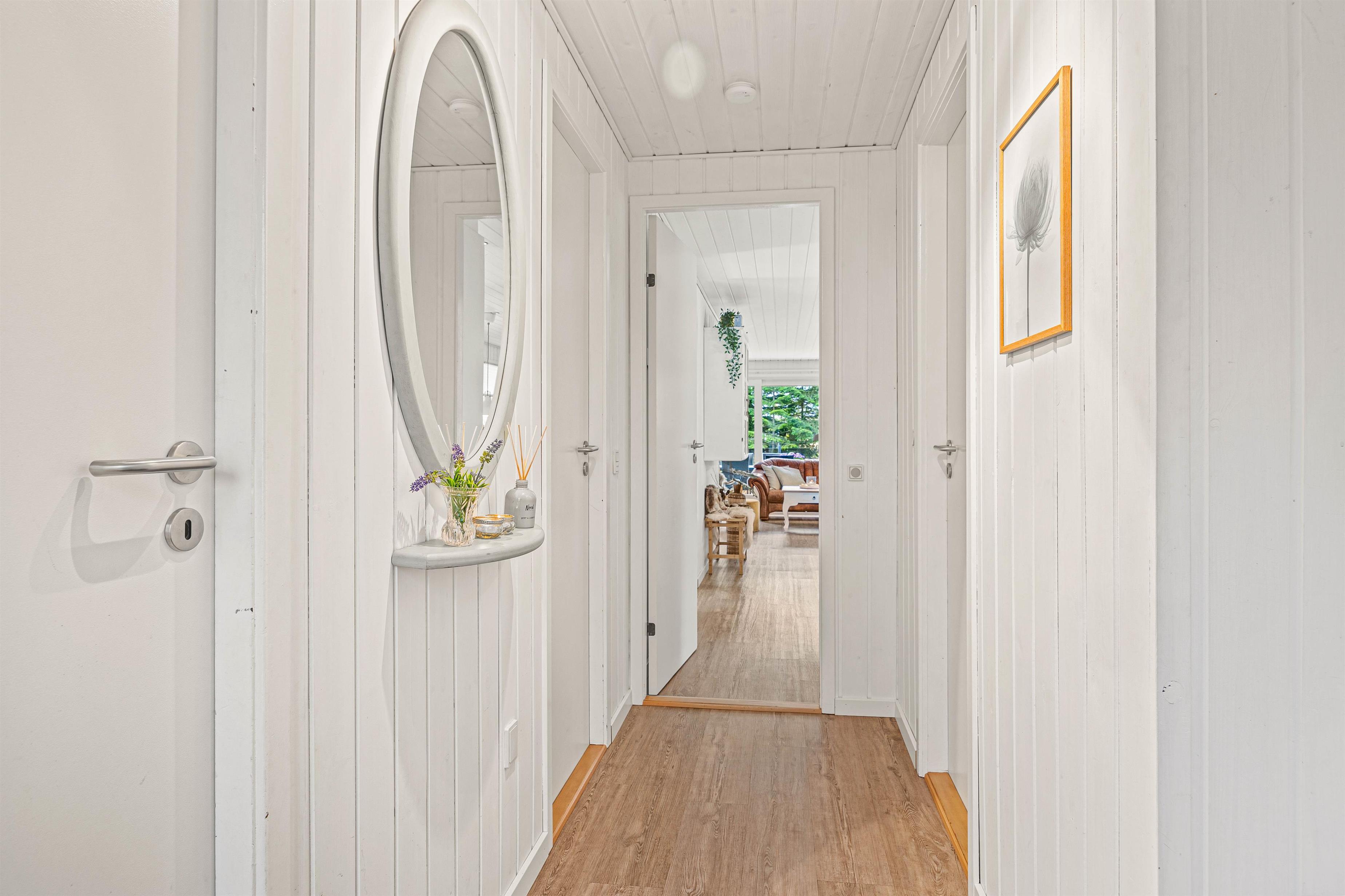 Entering the holiday home on Højsvej 19, you'll find yourself in a long hallway. To your left are two bedrooms, one with a single bed and one with a double bed. On the right is the bathroom with underfloor heating, offering direct access to the sauna. A washing machine and tumble dryer ensure fresh towels daily.